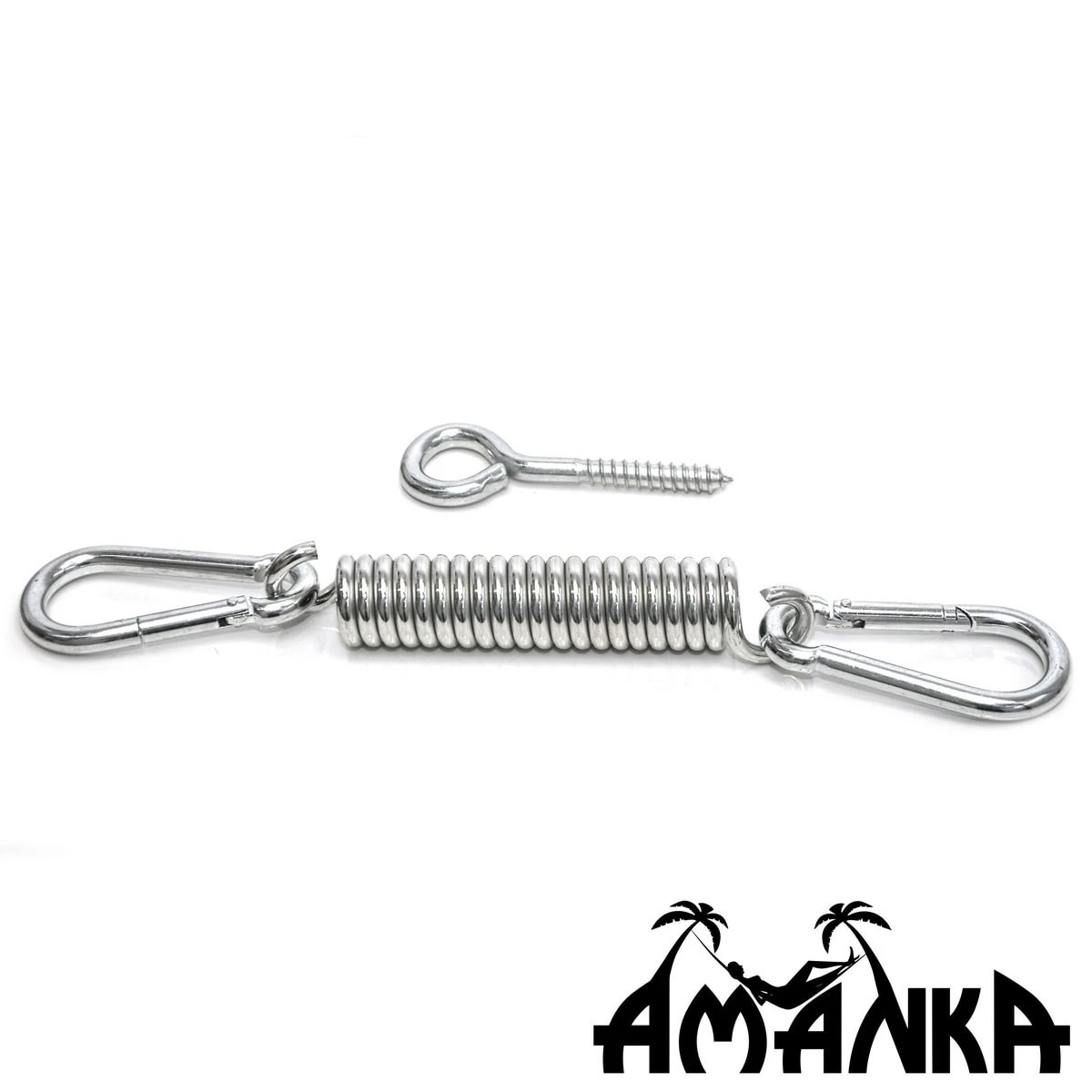 Bei einem Hängestuhlgestell haken Sie nur den Karabinerhaken ein und verzichten auf die Ringschraube. Die 2 großen Karabiner halten die Schwingfeder sicher in ihrer Position. Die Metallfeder gibt elastisch nach und federt Sie sanft in Ihre Wunschposition.