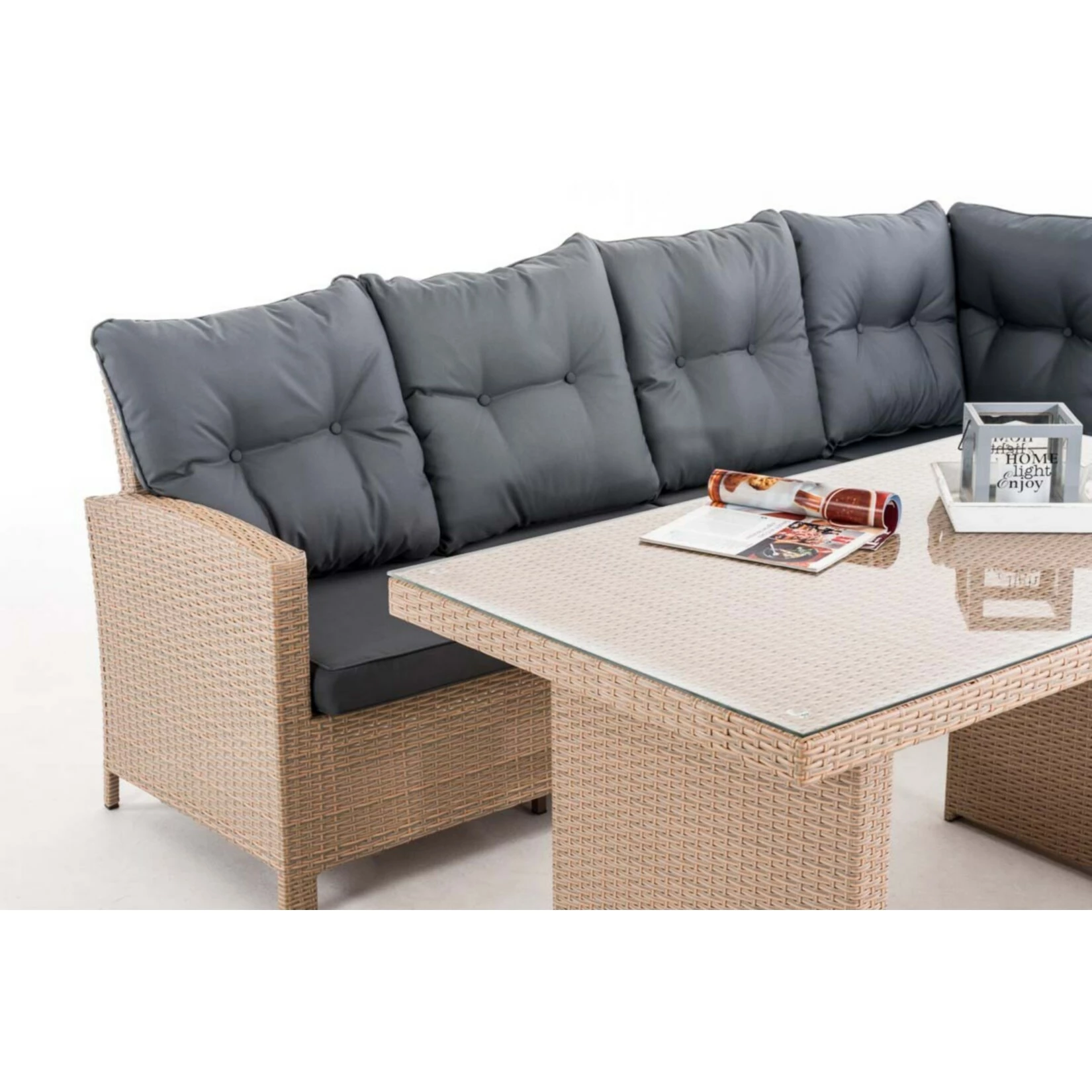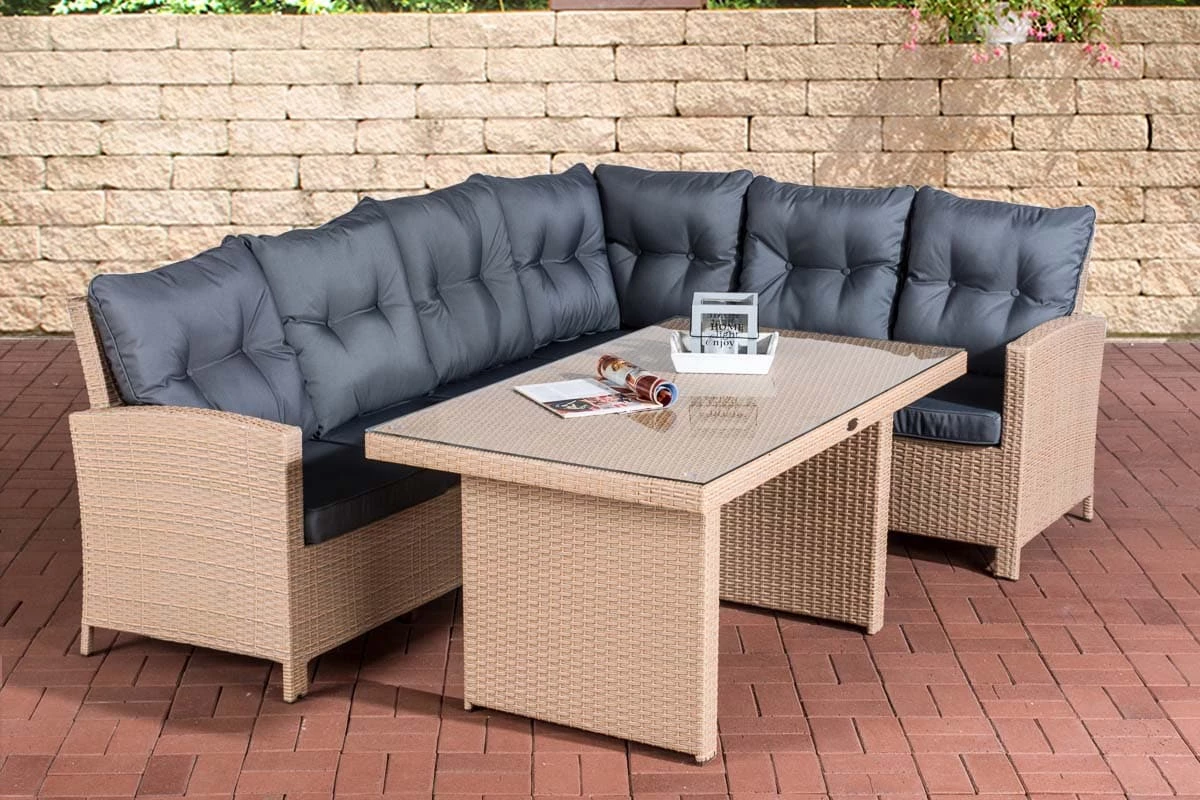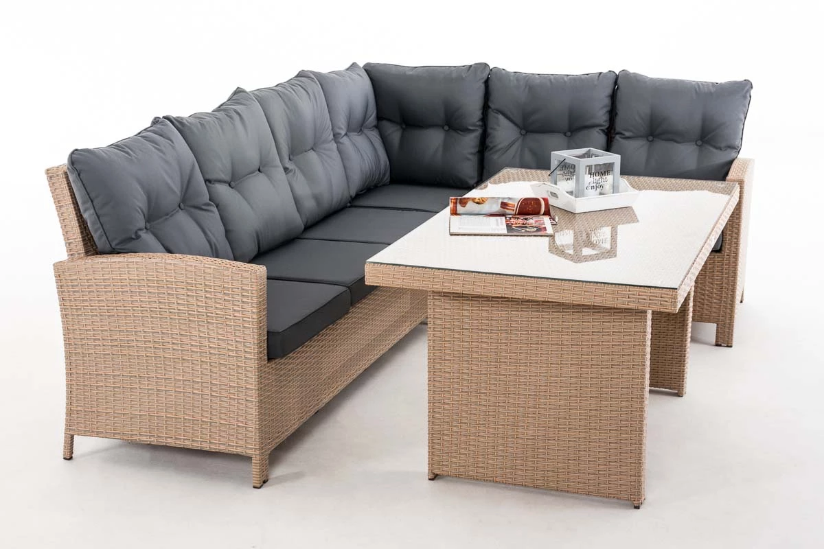 Die Gartengarnitur Minarient enthält ein Ecksofa und einen Esstisch mit einer Tischplatte aus Glas. Das Kunststoffgeflecht aus dem die Möbel gefertigt sind, ähnelt optisch herkömmlichen Rattan-Produkten, ist jedoch pflegeleichter und langlebiger. Die Möbel verfügen außerdem über hochwertig gepolsterte Sitzauflagen und Kissen. Diese sind im Lieferumfang enthalten. Unter der Polyrattan-Verkleidung sorgt ein vollverschweißtes Aluminiumgestell für einen stabilen Stand der Gartenmöbel.