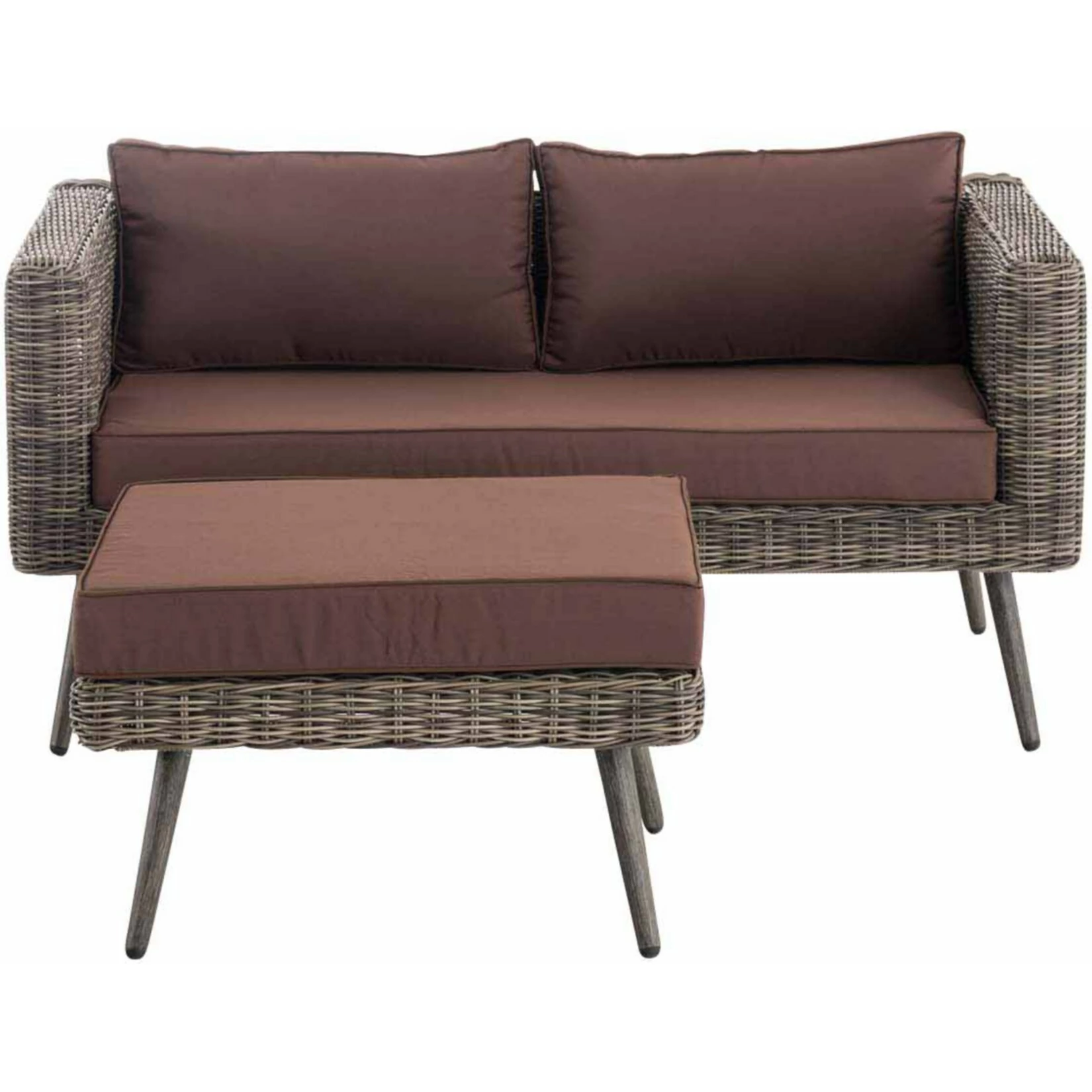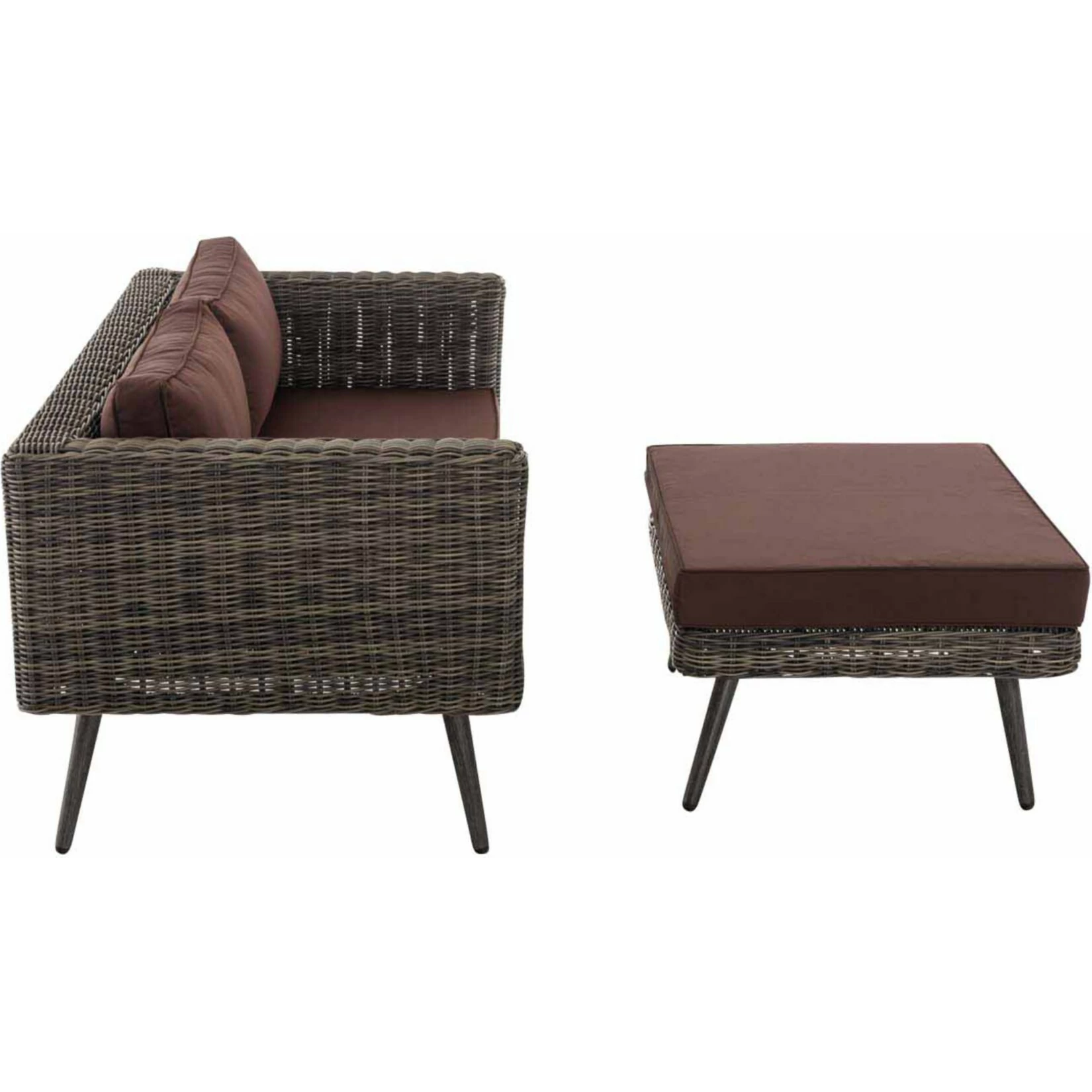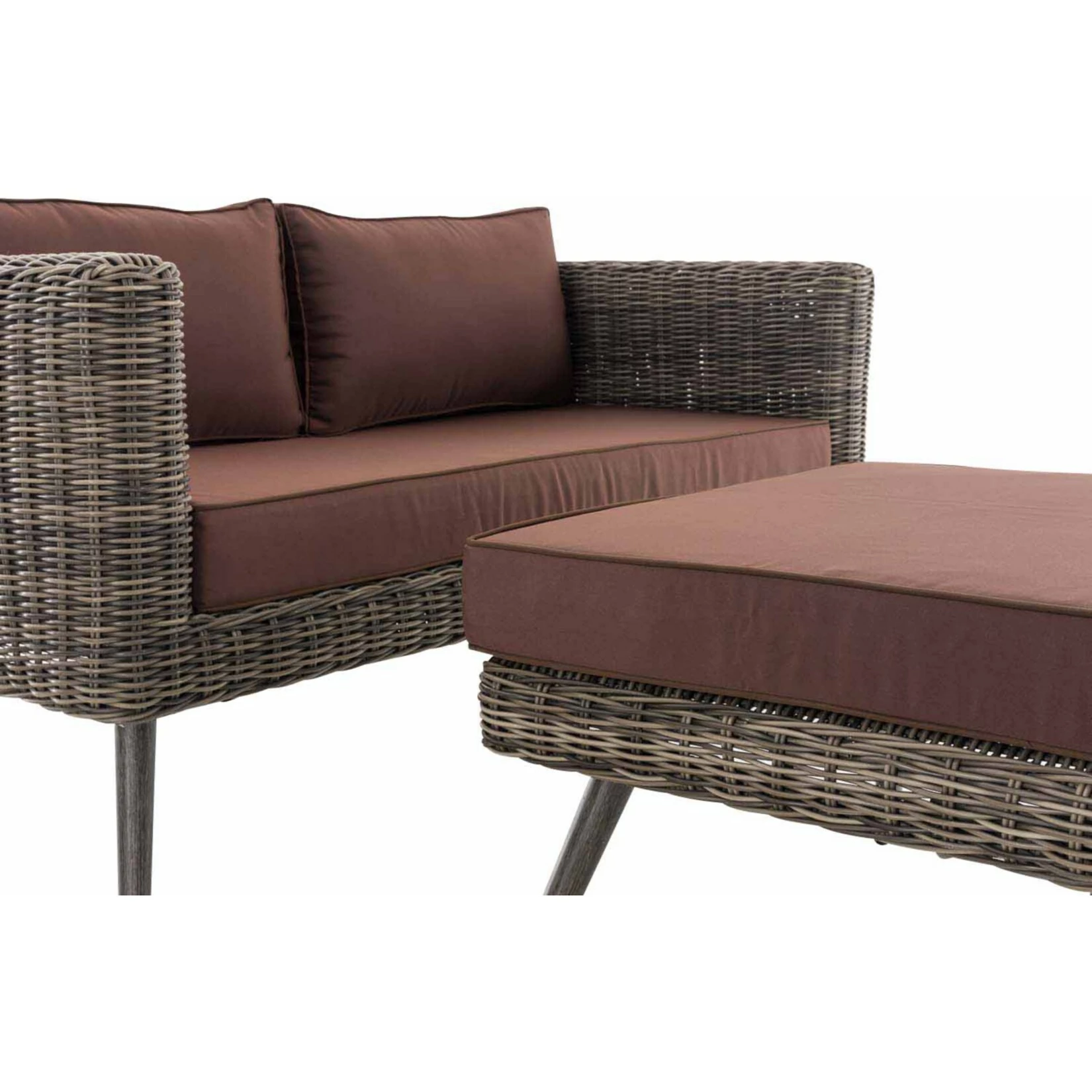 Diese schicke Gartenlounge entspricht ganz dem skandinavischen Stil. Das komfortable Lounge-Sofa mit passendem Fußhocker macht Ihren Garten, die Veranda oder bei schlechtem Wetter auch den Wintergarten zu einem gemütlichen Plätzchen. Das Sofa ist dank der großzügigen Polsterkissen sehr komfortabel und optimal für lange Sommerabende mit Freunden. Das schöne Ensemble lässt sich leicht variieren und findet dank des stabilen und witterungsbeständigen Polyrattans und Aluminiumgestells überall seinen Platz – auch drinnen macht es sich gut. Die hochwertigen, lackierten Aluminiumfüße in Holzoptik lassen sich leicht reinigen und bieten dank den Bodenschonerkappen sicheren Stand.