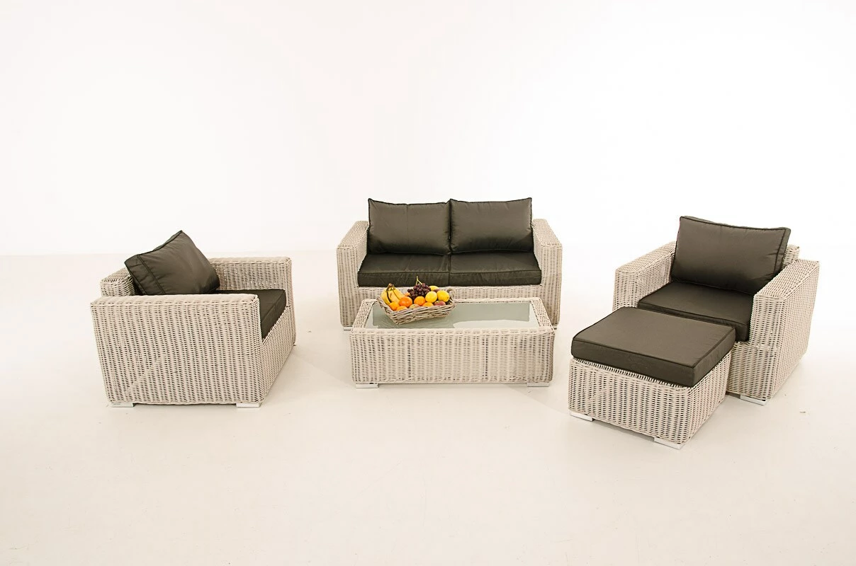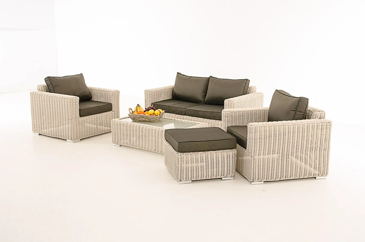 Ein 2-Sitzer Sofa, zwei Sessel, Tisch und ein gepolsterter Hocker – das Set Madeira 2-1-1 bietet eine allseits beliebte Sofa – Sessel – Tisch – Kombination. Die Elemente können jeweils einzeln gestellt werden. Die besonders dicken Sitz- und Rückenkissen, sowie die leicht erhöhte Rückenlehne, sorgen für einen sehr angenehmen Sitzkomfort.