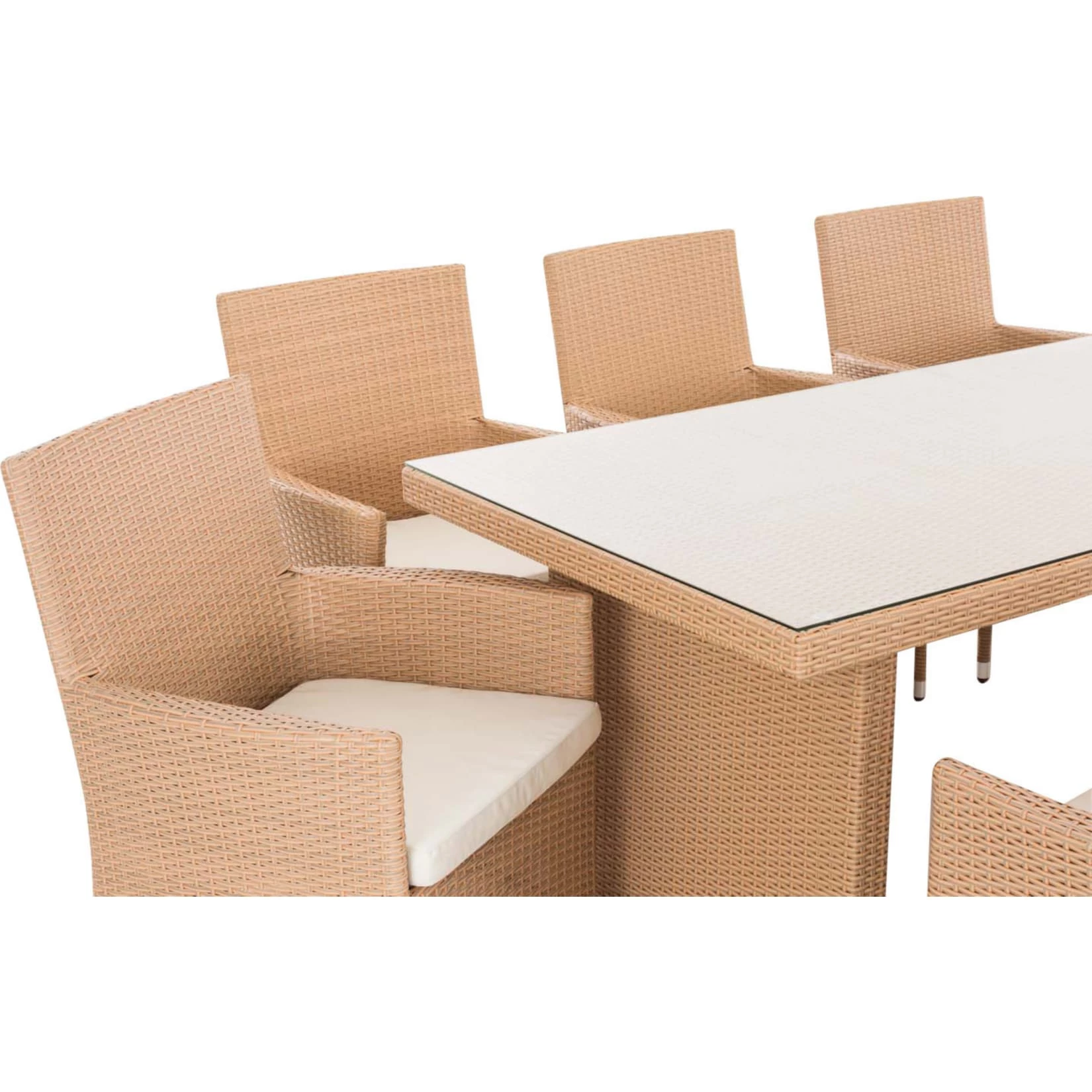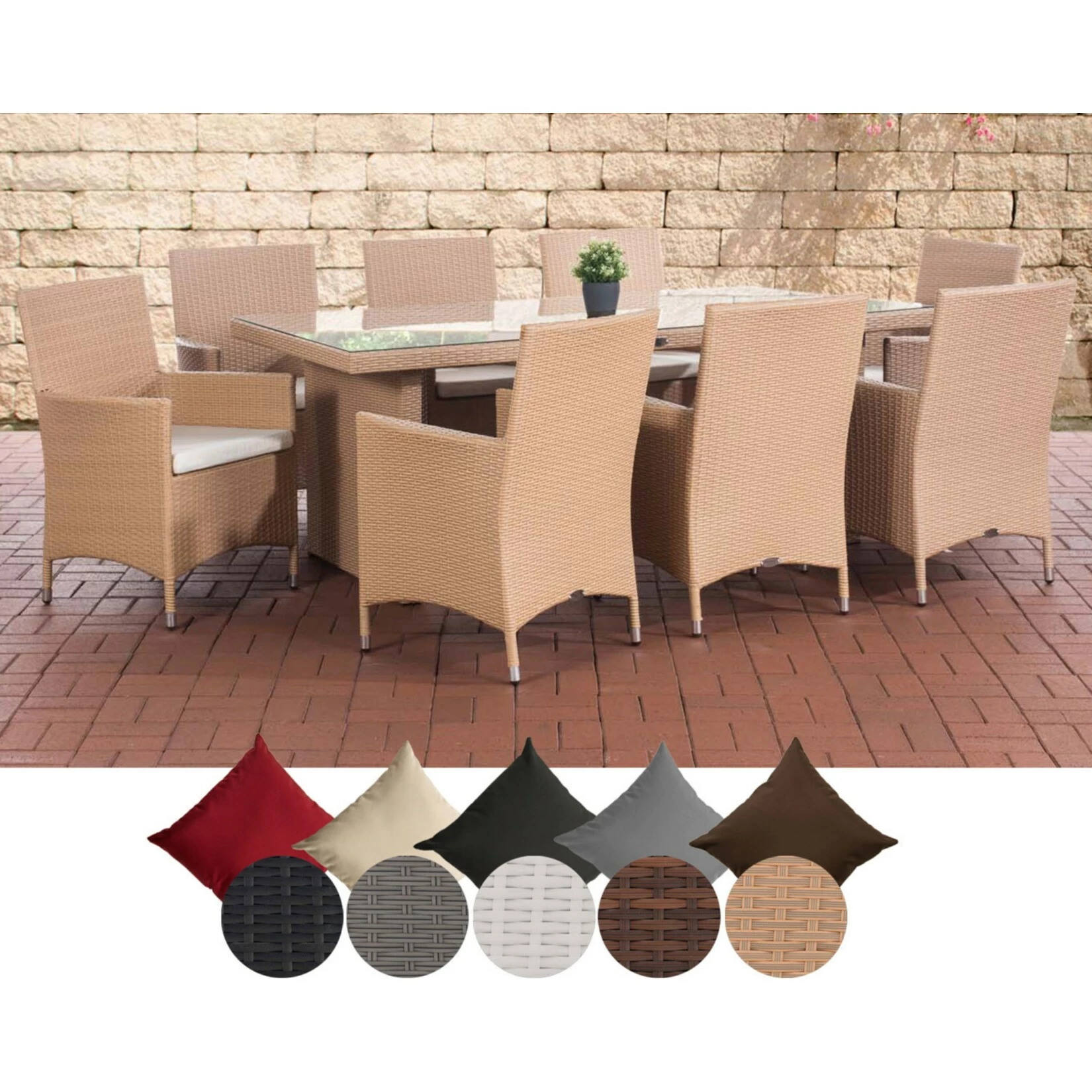Diese Gartengarnitur mit 8 Stühlen ist komplett aus Polyrattan geflochten und besteht aus einem großen Tisch mit Sicherheitsglasscheibe, sowie acht Stühlen inklusive Sitzauflage. Es handelt sich um ein Markenprodukt von höchster Qualität an dem Sie lange Freude haben werden.