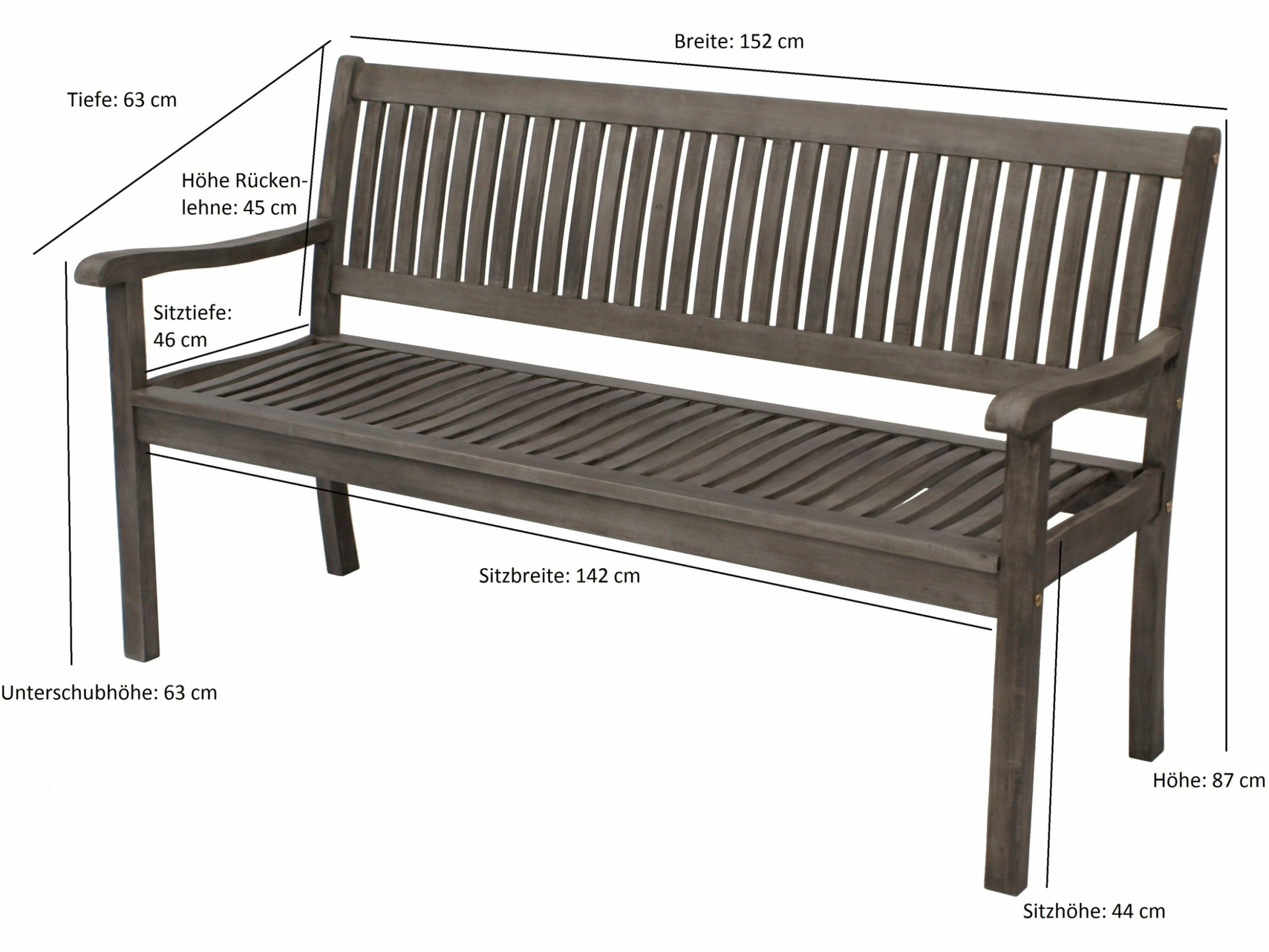 Die Bank ist aus hochwertigem Eukalyptus – Hartholz gefertigt. Sitz- und Rückenteil bestehen aus eingesetzten, ergonimisch geformten Holzstreben, was ihr eine ansprechende Optik verleiht. Gleichzeitig ist die Bank besonders stabil und solide.