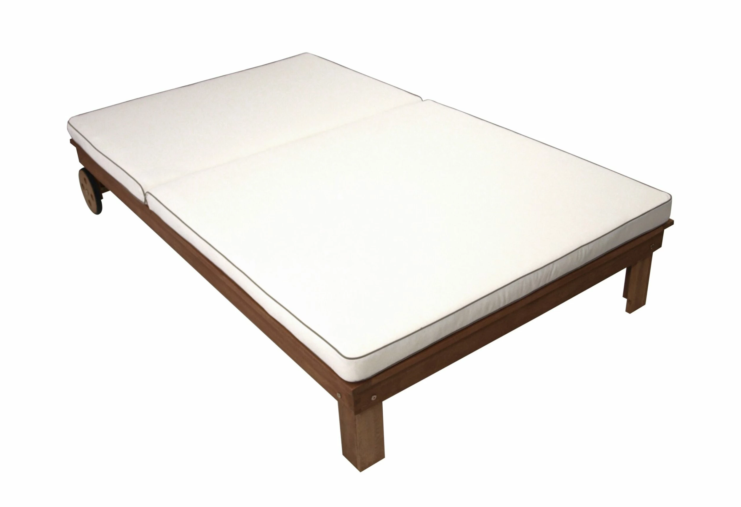 XL – Sonnenliege / Liegebett RIO aus Eukalyptus-Holz, geölt. Lieferung incl. Polsterauflage cremefarben mit brauner Paspel. Maße der Liege: 200x120x33cm.