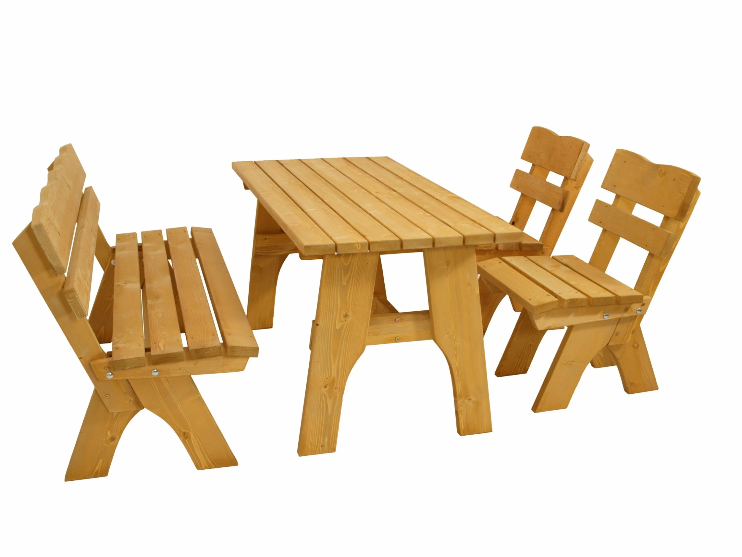4-teiliges Gartenset aus der Freital – Serie, massive Kiefer (30-34mm stark), bestehend aus: 1x Bank 150cm, 2x Stuhl und 1x Tisch 70x150cm. Die Kiefer wird vor der Verarbeitung kammergetrocknet. Dies sichert eine maximale Festigkeit, es entstehen keine groben Nachrisse durch Feuchtigkeit im Holz mehr, wodurch die Stabilität der Möbel beeinträchtigt werden könnte.