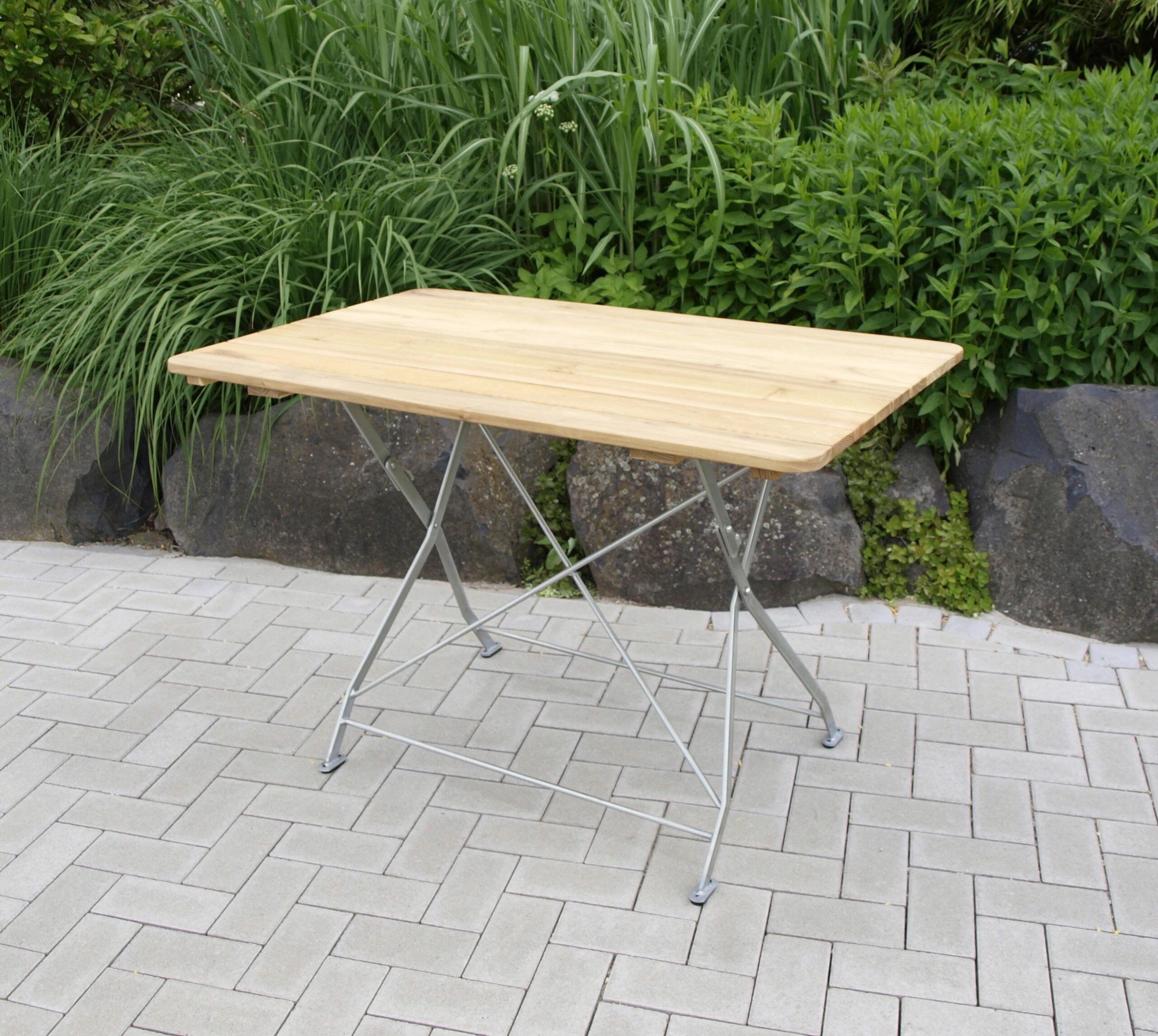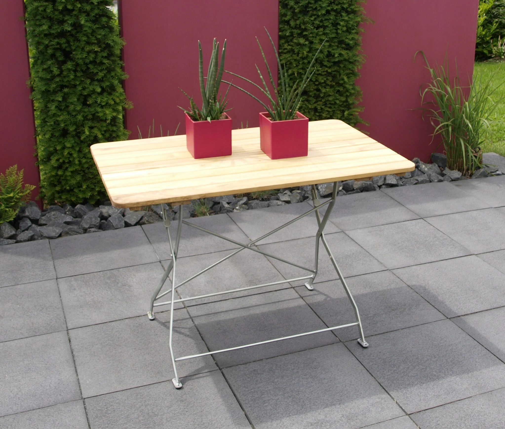 Biergartentisch mit solidem Metallgestell, klappbar. Die Tischplatte ist rechteckig und hat die Maße 70x110cm, Höhe des Tisches 72cm. Der Tisch ist ideal für vier bis sechs Sitzplätze geeignet.