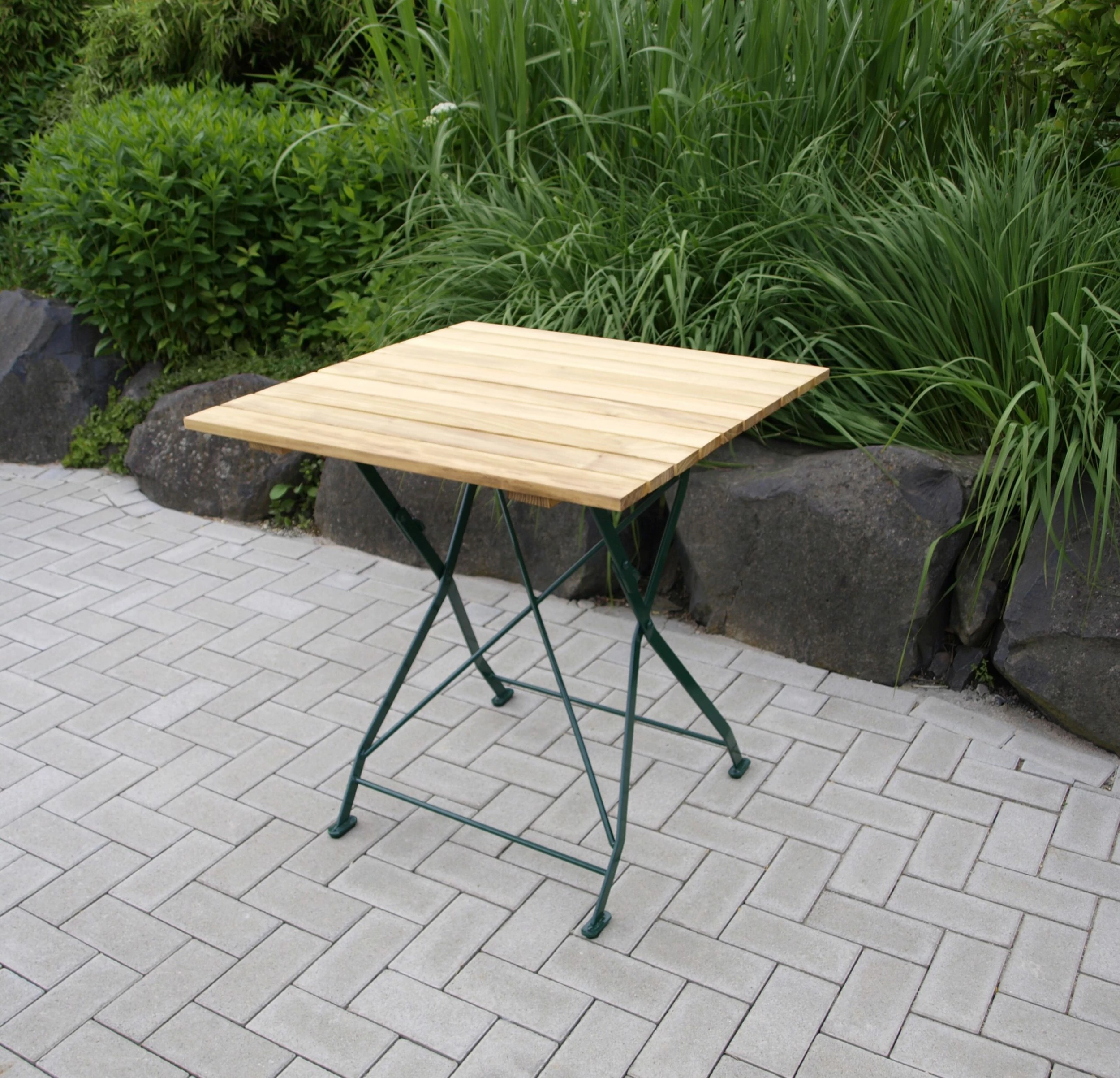 Biergartentisch mit solidem Metallgestell, klappbar. Die Tischplatte ist quadratisch und hat die Maße 70x70cm, Höhe des Tisches 72cm. Der Tisch ist ideal für vier bis sechs Sitzplätze geeignet.