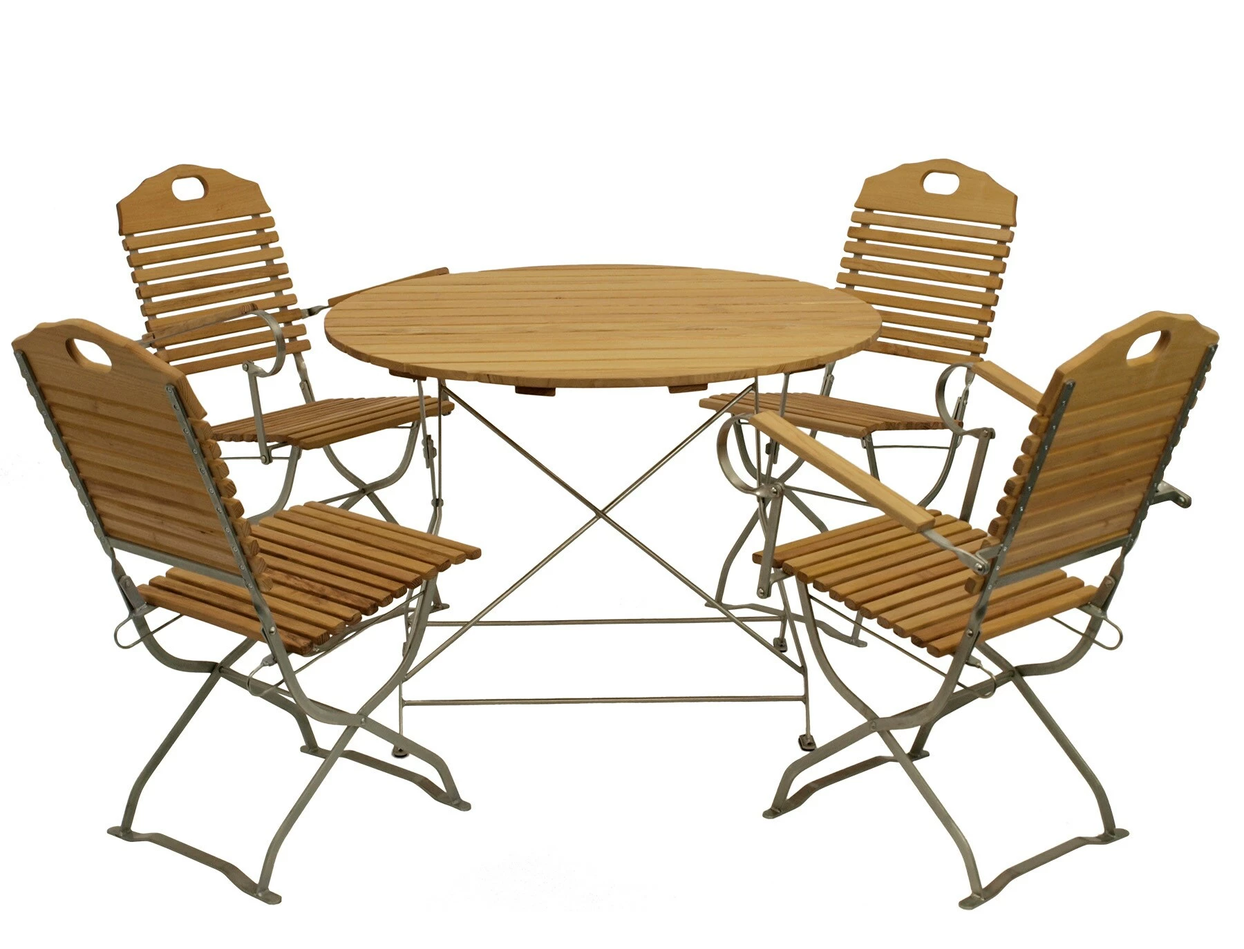 Das hier angebotene Kurgarten Set besteht aus zwei Stühlen, zwei Armlehnensesseln und einem runden Tisch. Der Tisch bietet für bis zu sechs Personen Platz, einzelne Stühle oder Sessel können bei Bedarf nachgekauft werden. Die Ausführung entspricht dem klassischen Kurgarten- bzw. Biergartendesign mit robustem Metallgestell. Alle Hölzer sind sauber verarbeitet. Die Gestelle sind aus massivem Flachstahl gefertigt, verzinkt und transparent pulverbeschichtet.