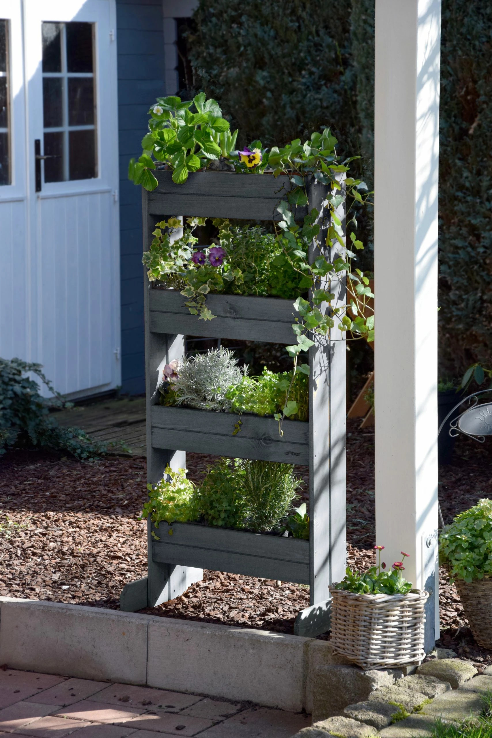Selbst angebautes Gemüse und Kräuter bedeuten Genuss und Lebensqualität denn Sie bereichern die Küche und bieten Gewissheit über Herkunft und Inhaltstoffe. Mit diesem robusten Vertikalbeet ist das Anlegen eines kleinen Gartens auch auf der Terrasse und dem Balkon möglich. Kreativ bepflanzt wird aus dem Hochbeet schnell ein dekoratives Gestaltungselement und kann bei entsprechender Bepflanzung auch als Sichtschutz oder Trennelement eingesetzt werden. Die erhöhte Lage der Pflanzkästen bietet einige Vorteile, wie etwa besseren Schutz vor Schnecken und Unkraut, während die rückenfreundliche Arbeitshöhe die Pflege der Pflanzen erleichtert. Mit der, im Lieferumfang enthaltenen, Pflanzfolie kann das Hochbeet zudem einfach und schnell bepflanzt werden. Das anthrazitfarbene Blumenbeet besteht aus FSC®-zertifiziertem Nadelholz (Cunninghamia lanceolata, Hauptholzart) aus nachhaltiger und umweltfreundlicher Forstwirtschaft und ist wetterfest lasiert. Die Außenmaße sind ca. 55 x 40 x 125 cm (L x B x H), die Innenmaße der Pflanzkästen sind jeweils ca. 50 x 17 x 16 cm.