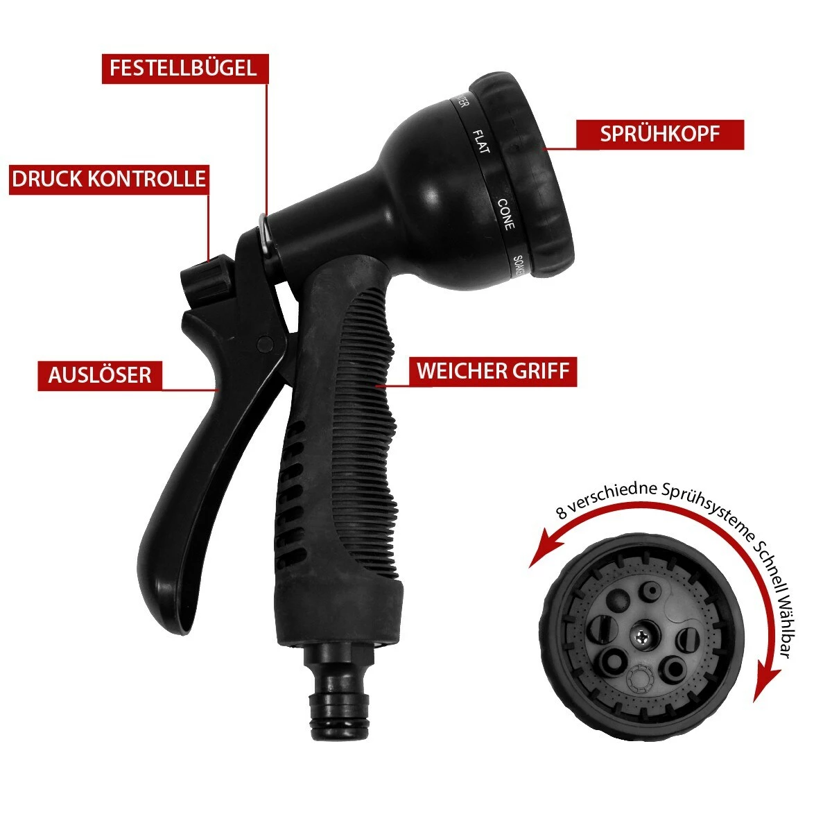 Die mitgelieferte Pistolengriffbrause verfügt über 8 verschiedene Sprühfunktionen: Center, Mist, Angle, Full, Soaker, Shower, Cone, Flat. Am Kopf der Brause sind deutliche Markierungen angebracht und die Sprühmuster lassen sich mühelos einstellen.