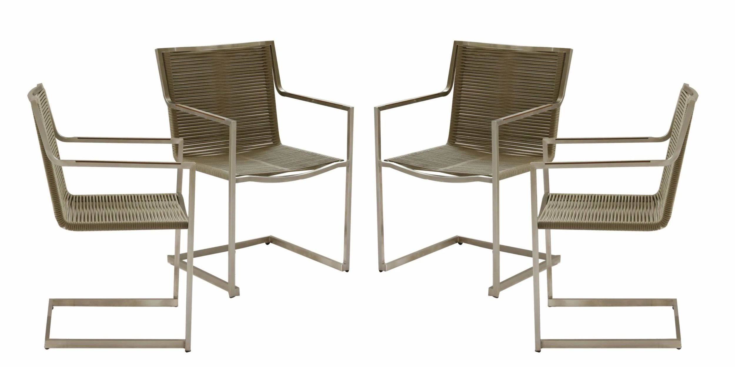 Freischwinger SIENNA 4er Set Material: Edelstahl Kunststoff Edelstahl #304 / Seilbespannung taupe Maße ca.: B56xH87xT57 cm Sitzhöhe ca.: Stahlrohr: 19x19x2 mm Seil-Ø: 6mm Edelstahl gebürstet HPL Armlehne grau Kartonmass ca. LxBxH: L58xB68xH103 cm Marke: Garden Pleasure Gewicht netto/brutto ca.: 6,25 kg / 9 kg Herstellungsland: CHINA