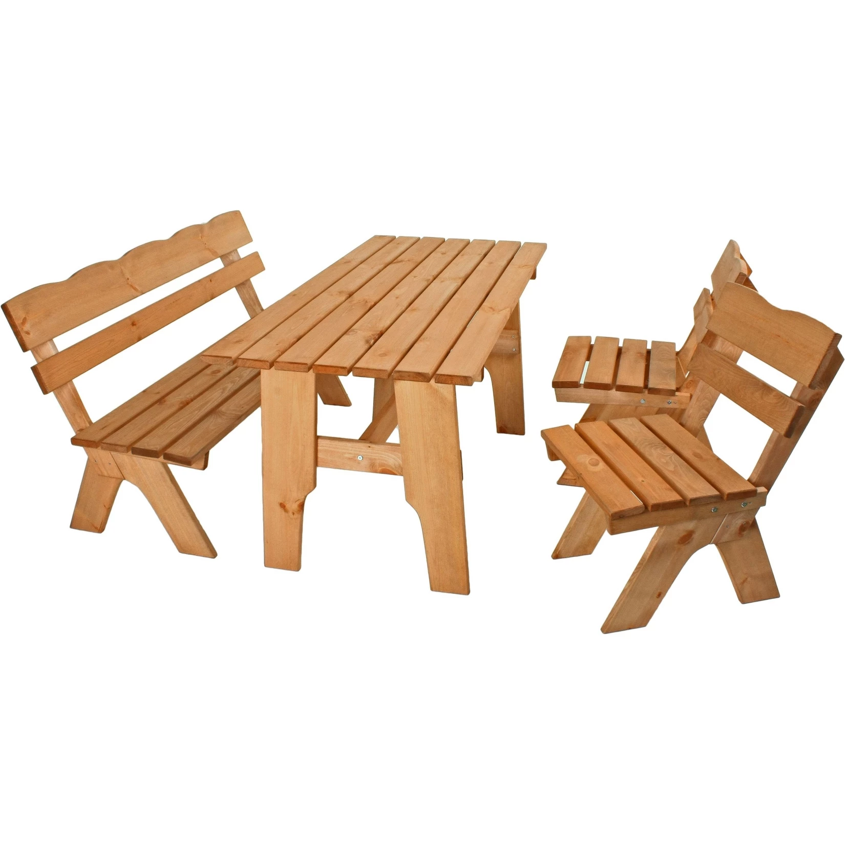 Tischgruppe SCHWARZWALD 4-teilig Material: Kiefer FSC Kiefer geölt / Pinus sylvestris FSC Mix Credit Maße ca.: Tisch L150xB70xH74 cm Bank B150xH82xT60 cm Stuhl B50xH82xT65 cm Sitzhöhe ca.: 42,5 bestehend aus: 1 Tisch 1 Bank 2 Stühlen GFA-COC-001312 verzinkte Beschläge Karton 2 Bank: 153 x 68 x 15 cm Gewicht 17 / 20,2kg Karton 3 Stühle: 69 x 53 x 41 cm Gewicht 17,6 / 19,6 kg Sitzbreite ca.: 150/42 Kartonmass ca. LxBxH: Tisch: L153xB73xH13 cm Marke: Garden Pleasure Gewicht netto/brutto ca.: 21,1 kg / 22,8 kg Herstellungsland: LITAUEN