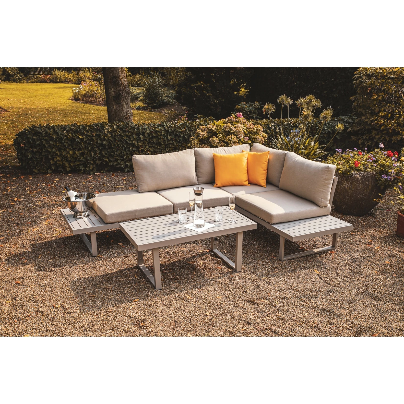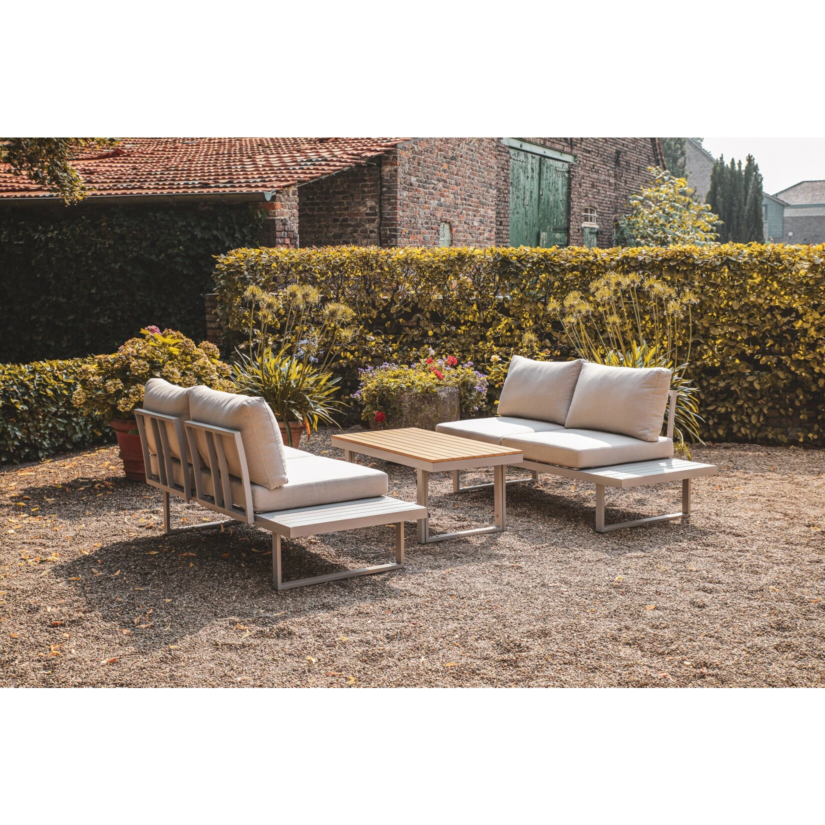 Modernes Lounge-Set Aruba bestehend aus höhenverstellbarem Tisch und zwei Bänken mit seitlichen Ablageflächen – variable Stellmöglichkeiten für individuelle Platzansprüche