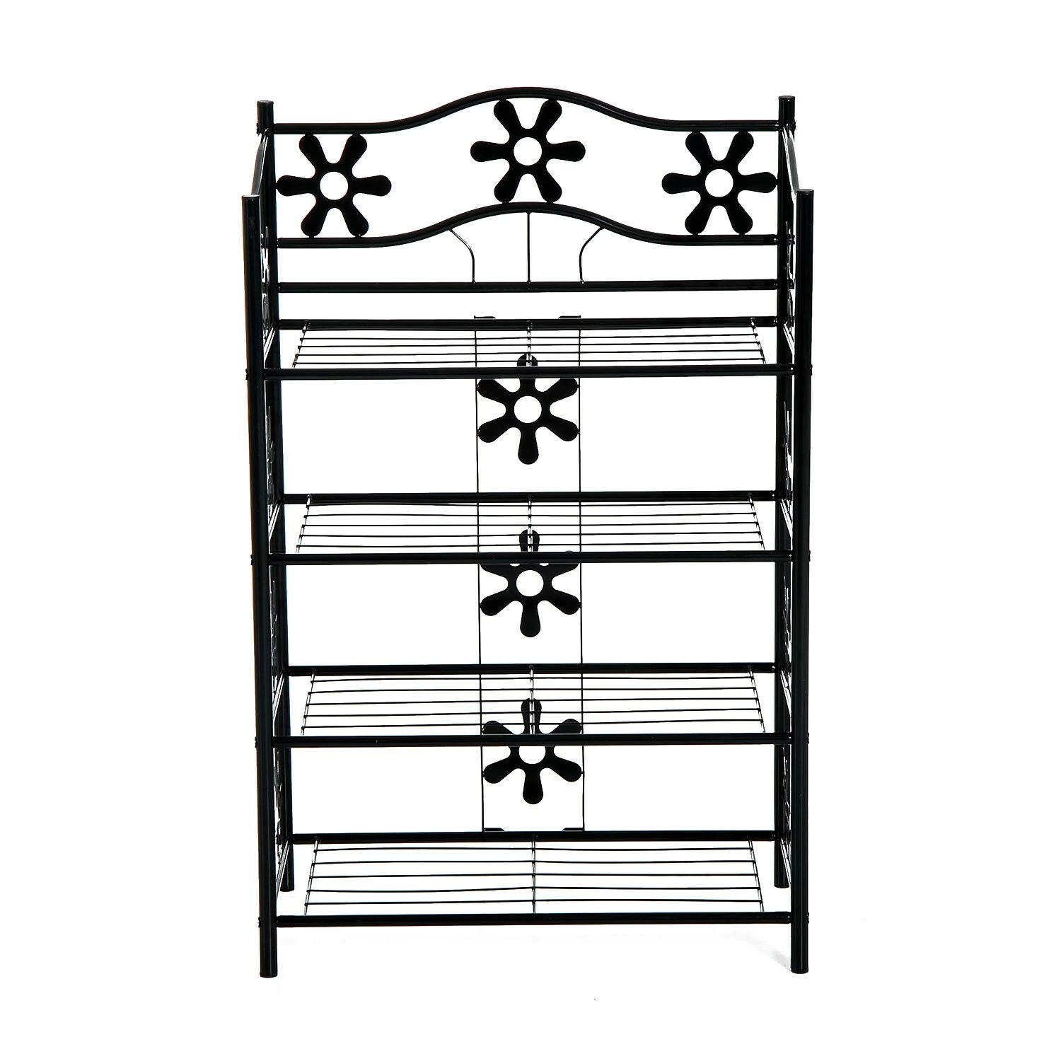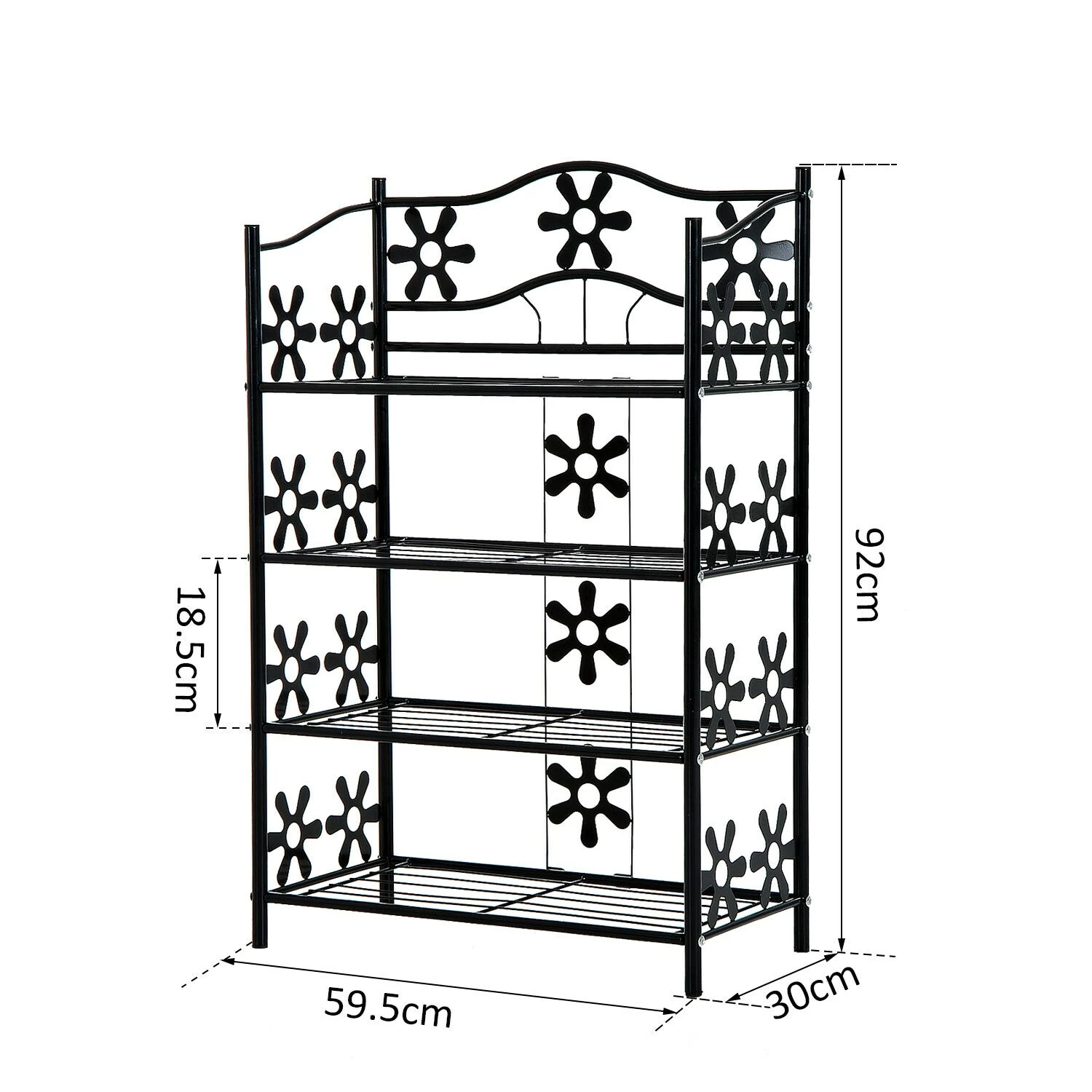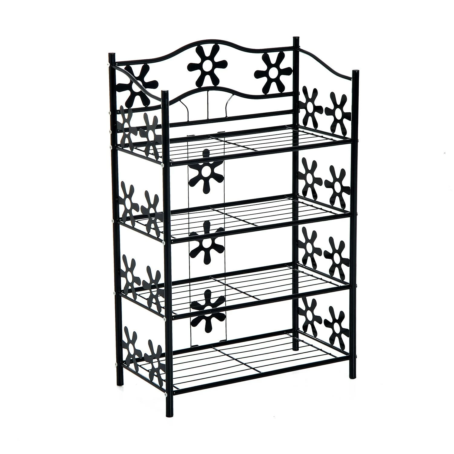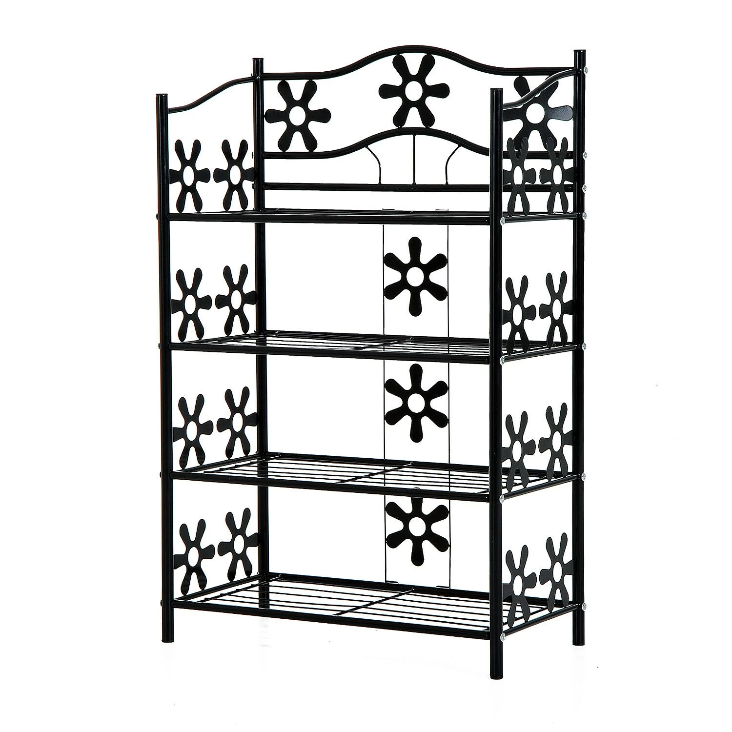 Charmant und vielseitig präsentiert sich unser Blumenregal. Gefertigt aus pulverbeschichtetem Metall zeigt es sich unempfindlich gegenüber Witterungseinflüssen und überzeugt in puncto Verarbeitung und Robustheit. 4 Regalböden bieten Ihnen ausreichend Platz, um Pflanzen, Schuhe oder andere Gegenstände übersichtlich zu platzieren. Nicht nur Blumen finden einen dekorativen Stellplatz in Ihrem Regal. Auch als Badhelfer oder Schuhregal macht es eine gute Figur. Auffallend sind besonders die formschönen Verzierungen, die Ihr Standregal zu einem wahren Hingucker machen. Gut verarbeitet, charmant im Design und klasse im Preis. Mit unserem vielseitigen Pflanzregal holen Sie sich dekorative Eleganz nach Hause.