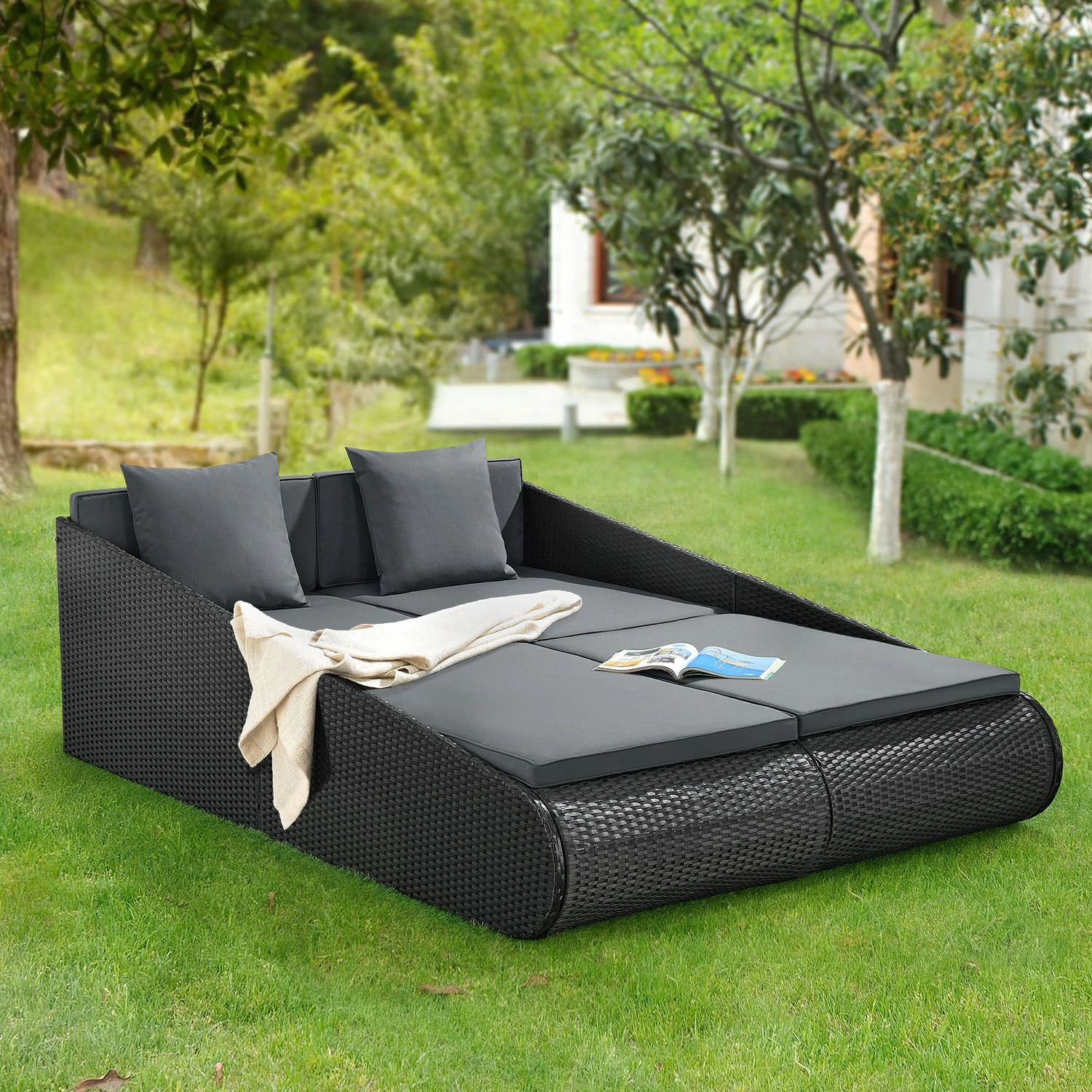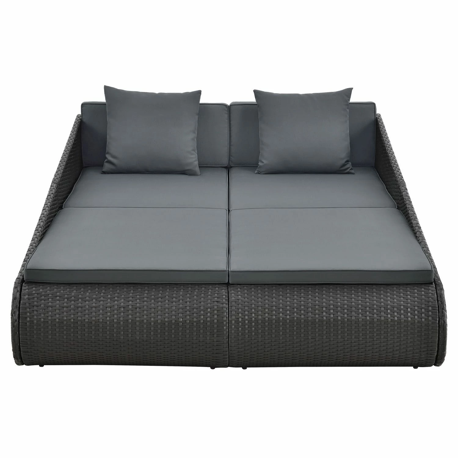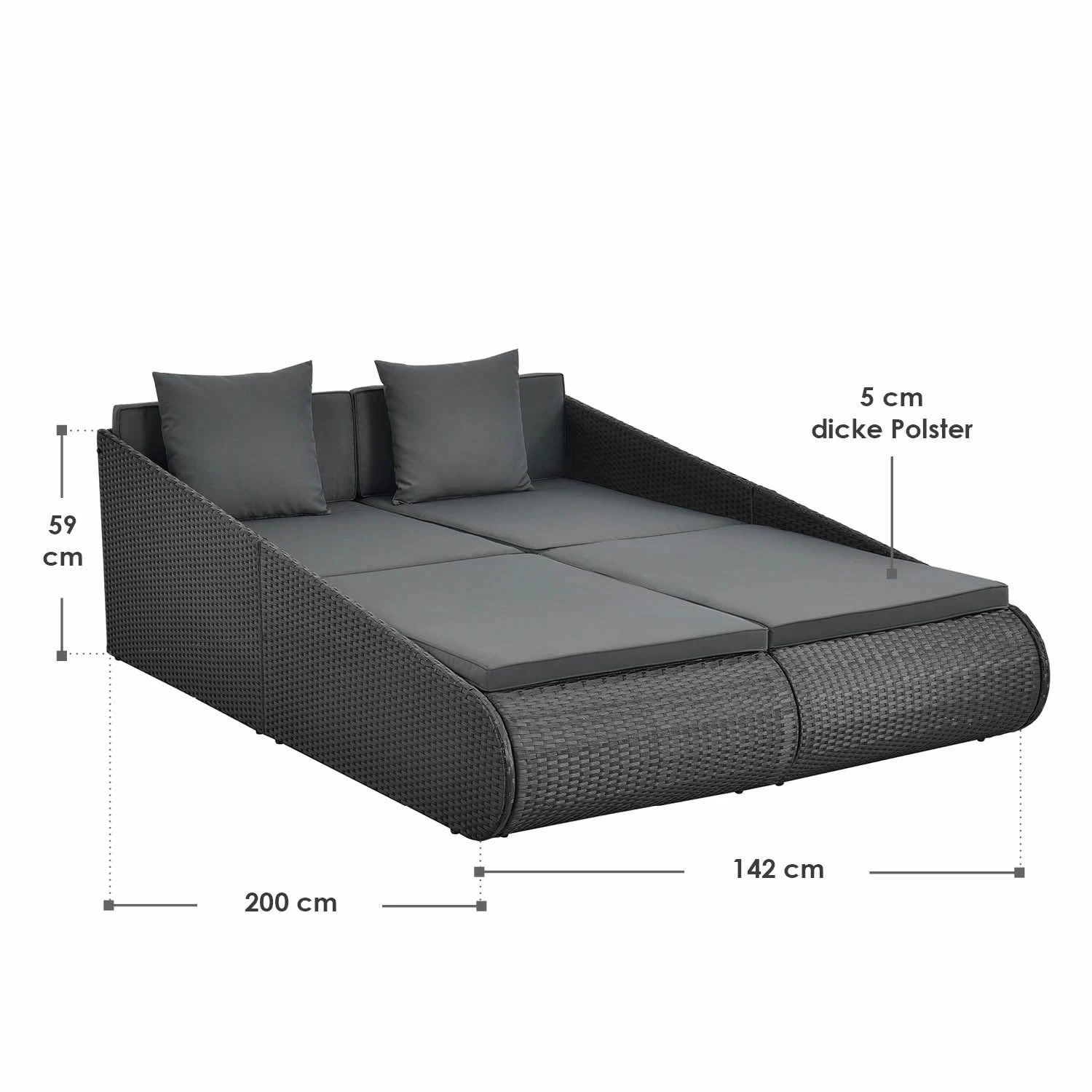 Unsere Doppel Sonnenliege für 2 Personen ist ein echter Hingucker für Garten, Terrasse oder Balkon. Die einzigartige Rattan-Optik in schlichtem schwarz mit Auflagen in dunklem grau verleiht Ihrer neuen Liegeinsel einen modernen Charme und lädt zum Entspannen im Freien ein. Die dicken Polster mit 2 zusätzlichen gemütlichen Kissen machen die Liege zum neuen Lieblingsplatz! Egal ob Sie lieber alleine die Ruhe genießen oder zu zweit Sonne tanken, mit unserer Sonneninsel sind Sie startklar für den Sommer.