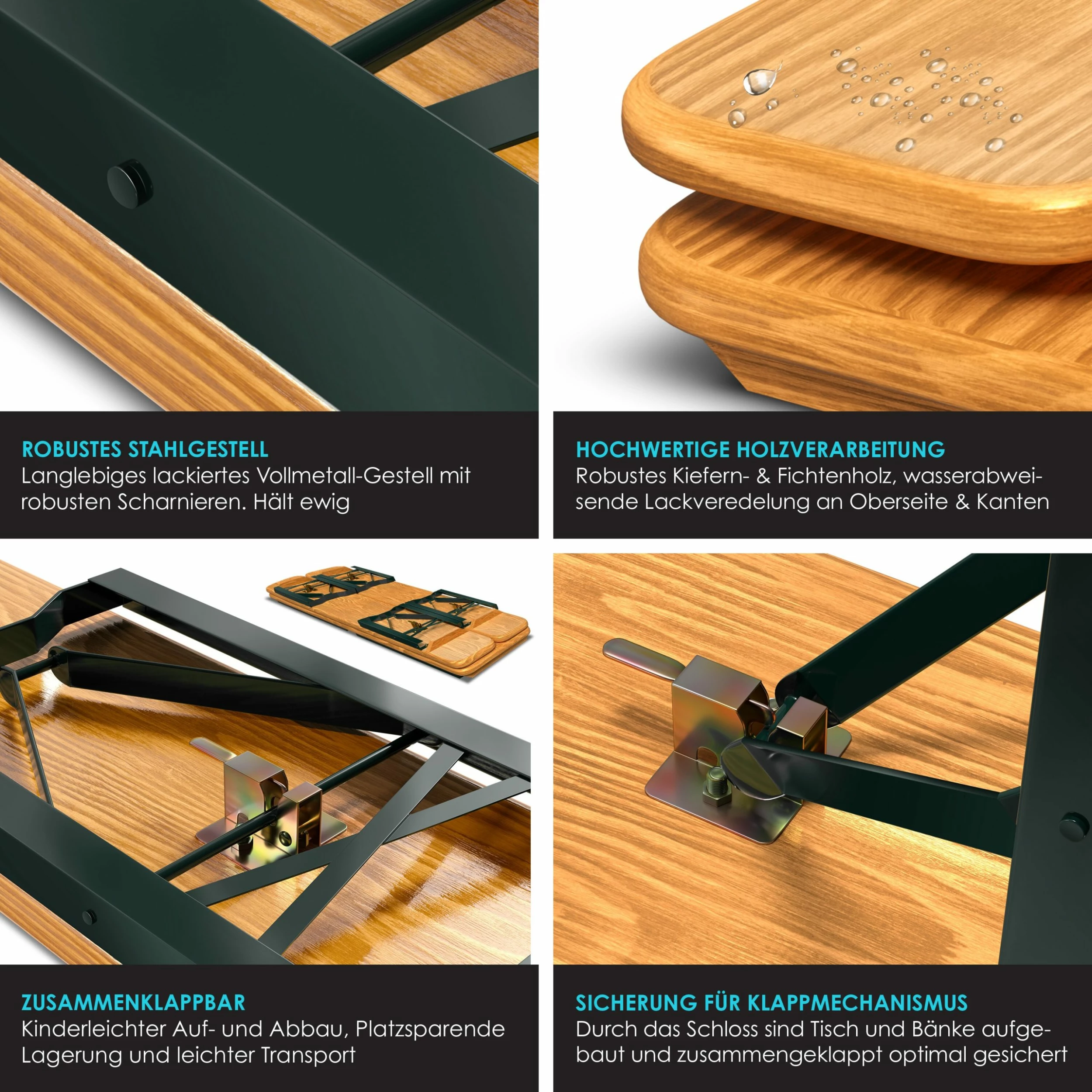 Platz für bis zu 8 Personen: Die 3tlg. Holzgarnitur besteht aus einem großen Tisch + zwei Bänke. Klappfunktion Tisch und Bänke zusammenklappbar – daher bei Bedarf schnell aufzubauen und hinterher wieder platzsparend zu verstauen