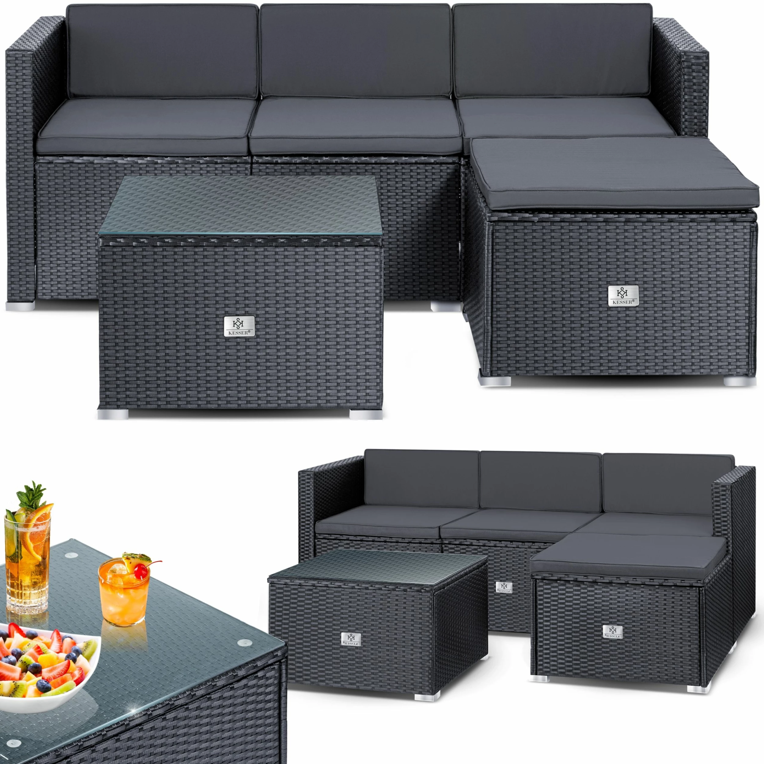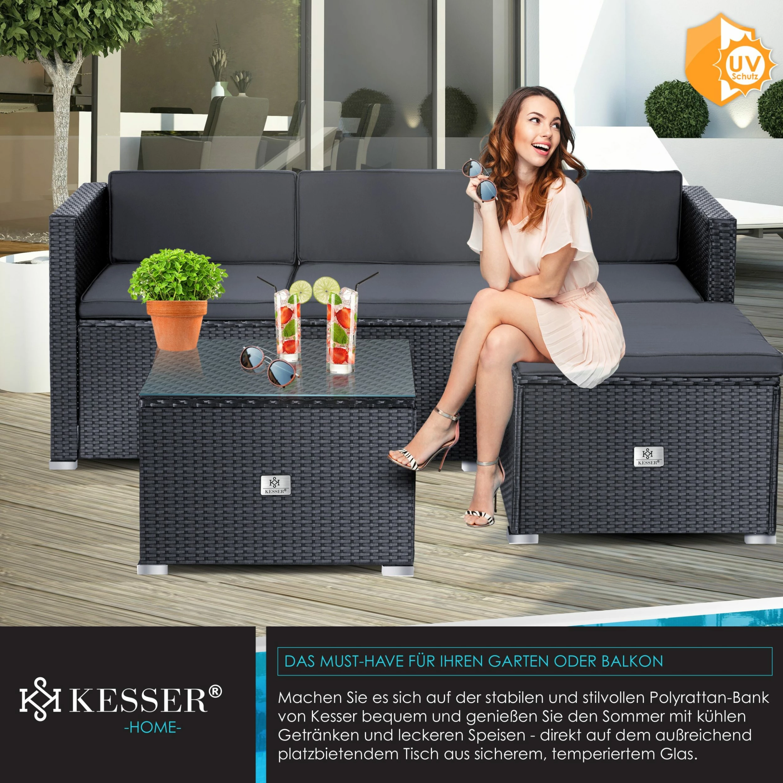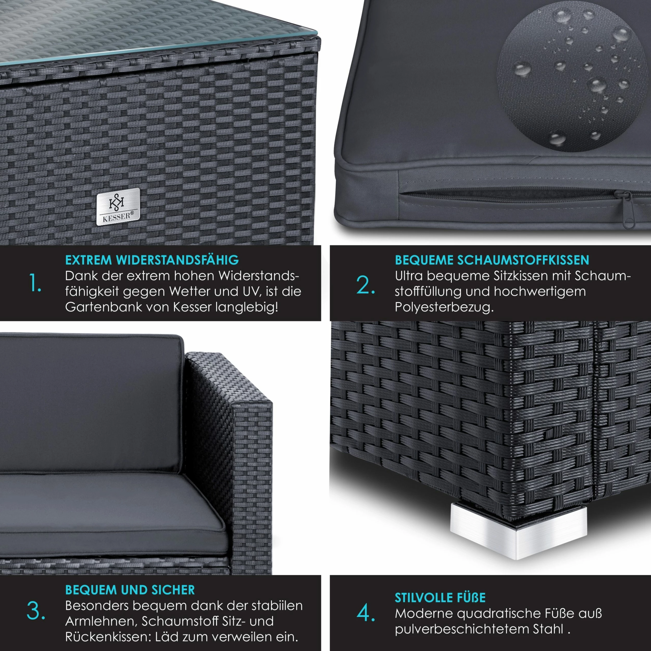 KESSER Polyrattan Gartenbank 3er Set aus hochwertigem Polyrattangeflecht, großer Tisch mit Sicherheitsglasplatte für einen Blickfang in Ihrem Garten oder Terrasse, resistent gegen Schlechtwetter und UV, ultra stabile und pulverbeschichtete Stahlrahmenkonstruktion, inkl. 7 Kissen mit Polyester-Bezug