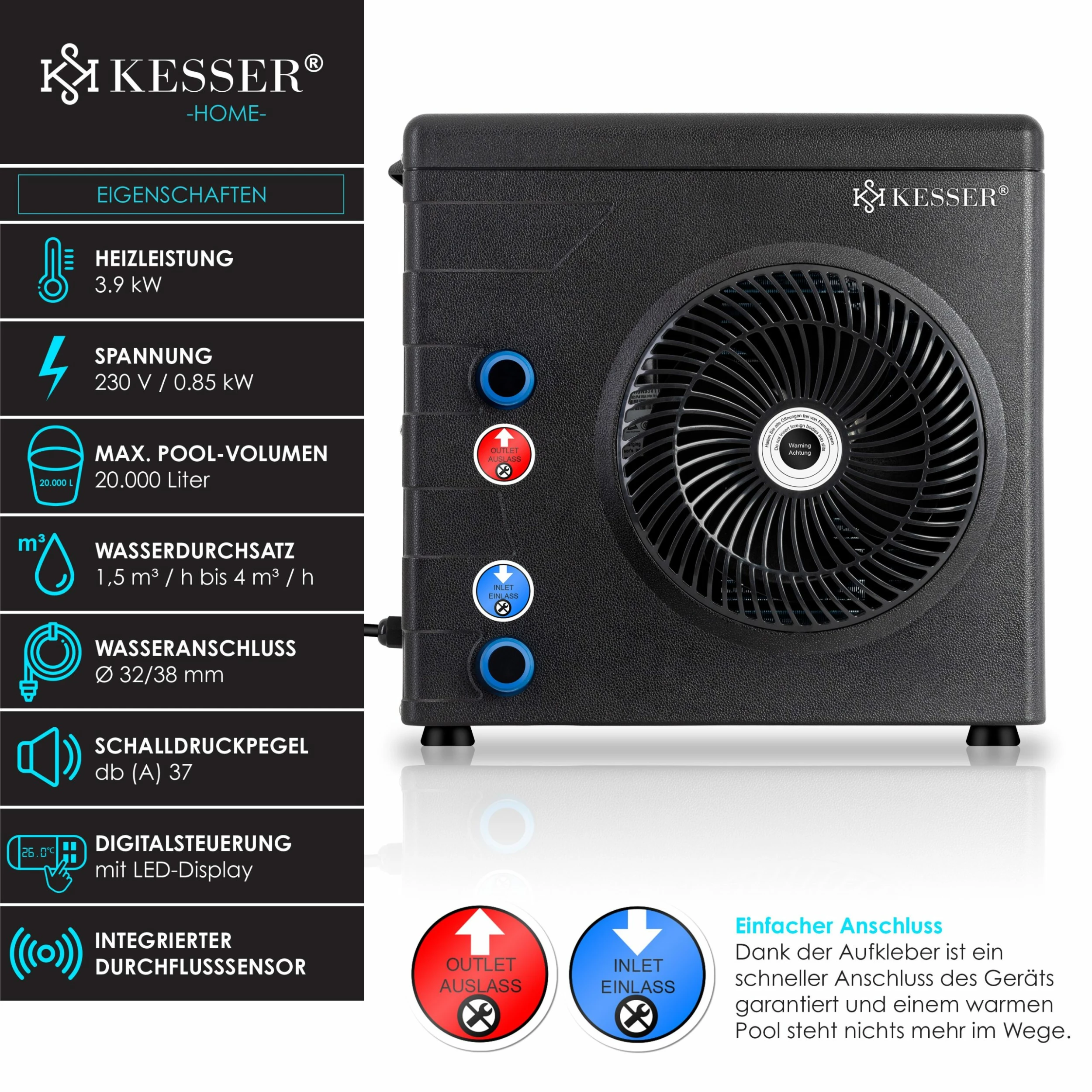 KESSER Wärmepumpe mit Digitalsteuerung, Temperaturanzeige auf dem LED-Display, inkl. Montagezubehör für eine einfache Installation, geringer Schalldruckpegel und integrierter Durchflusssensor, hoher Wasserdurchsatz