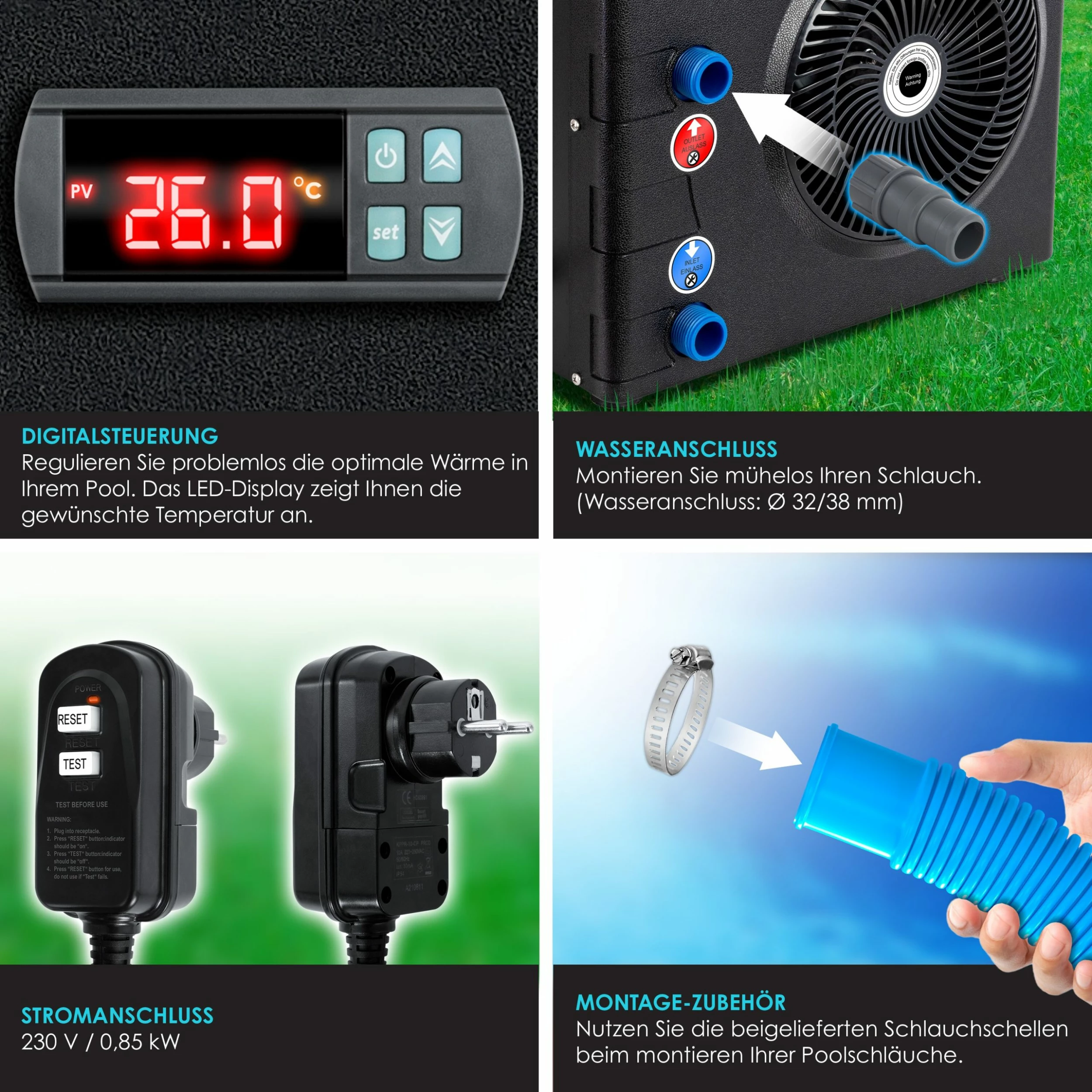 Die Montage ist einfach und unkompliziert durchzuführen. Montieren Sie einfach mühelos Ihren Poolschlauch an unserem Wasseranschluss, welcher einen Durchmesser von 32/38mm hat. Zusätzlich können Sie die mitgelieferten Schlauchschellen bei der Montage Ihrer Poolschläuche verwenden, damit diese fest und stabil sitzen. Dank der Aufkleber an der Wärmepumpe ist ein schneller Anschluss des Geräts garantiert und einem warmen Pool stehts nichts mehr im Wege. Dank integrierten Griffen lässt sich die Wärmepumpe einfach an jeden Ort transportieren.