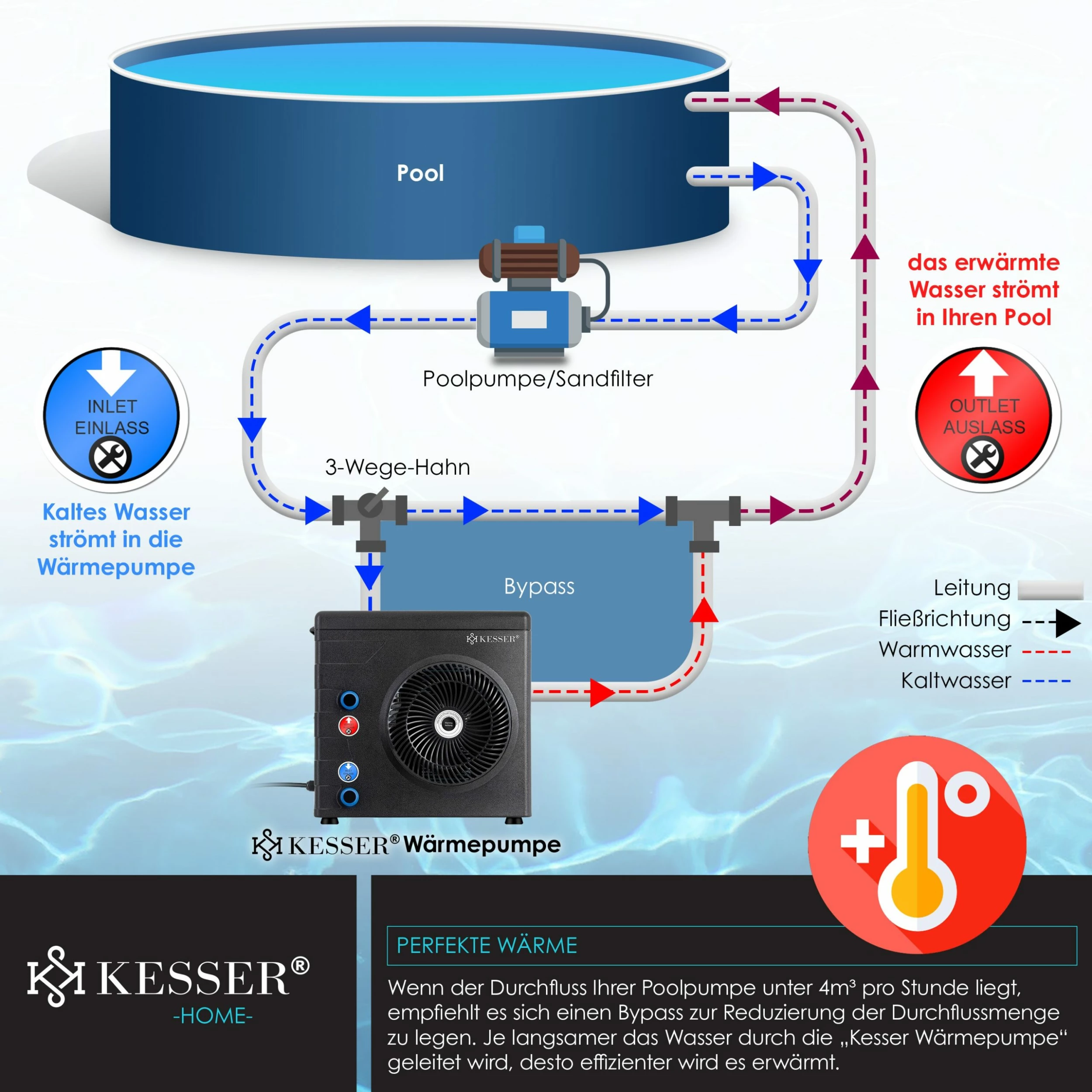 Wenn der Durchfluss Ihrer Poolpumpe unter 4m³ pro Stunde liegt empfiehlt es sich, einen Bypass zur Reduzierung der Durchflussmenge zu legen. Je langsamer das Wasser durch die “KESSER Wärmepumpe” geleitet wird, desto effizienter wird es erwärmt. Kombinieren Sie die Wärmepumpe mit den Poolschläuchen und dem Sandfilter der Marke KESSER für Ihr eigenes und hochwertiges Poolsystem und genießen Sie sauberen und angenehmen Badespaß.