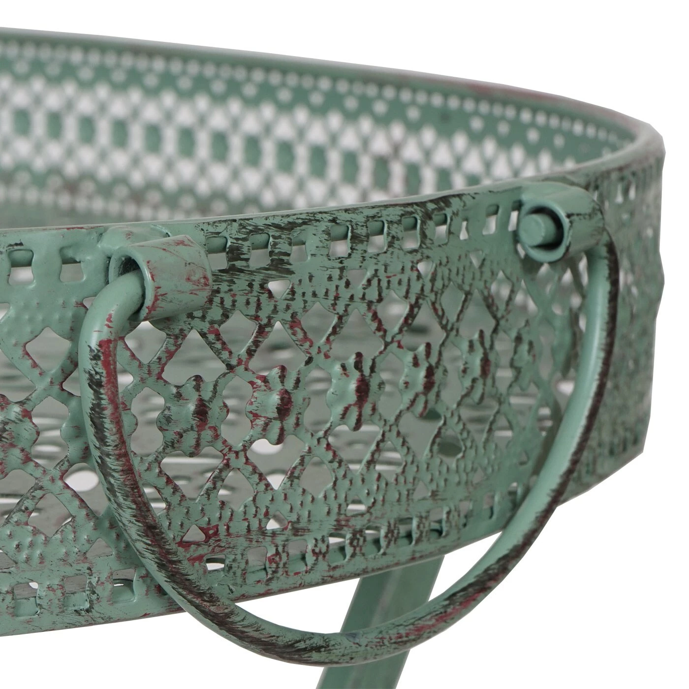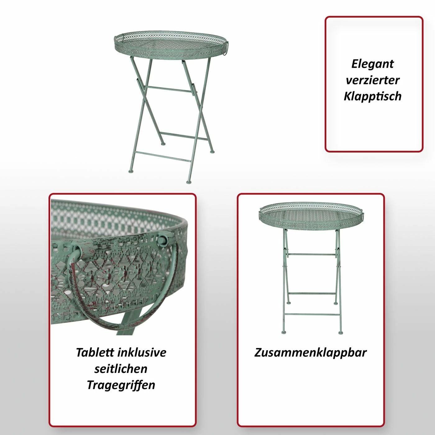 Dieser elegant verzierte Klapptisch beeindruckt durch seine grazile Form und seine liebevollen Details. Durch die praktische Klappfunktion können Sie den Tisch einfach und schnell verstauen und der Rand an der Tischkante sorgt für zusätzliche Sicherheit, bei allem was Sie darauf stellen.