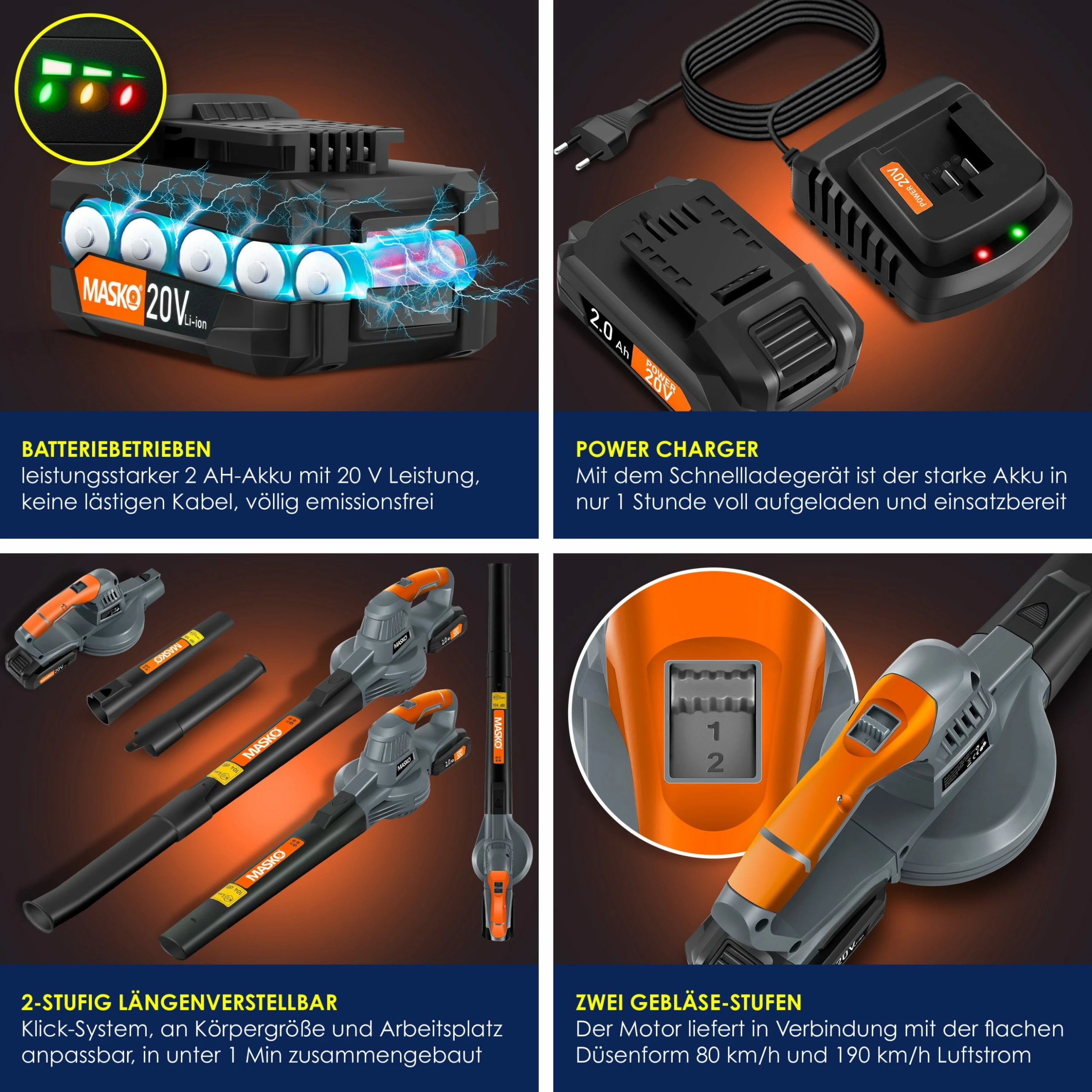MASKO Akku-Laubbläser, 1,2 kg leicht, 190 km/h Luftstrom, 2-stufig längenverstellbar sowie zwei Gebläsestufen, inkl. Power Charger, 2 AH-Akku mit 20V Leistung, ergonomisches Design und bis zu 38 Minuten Arbeitszeit