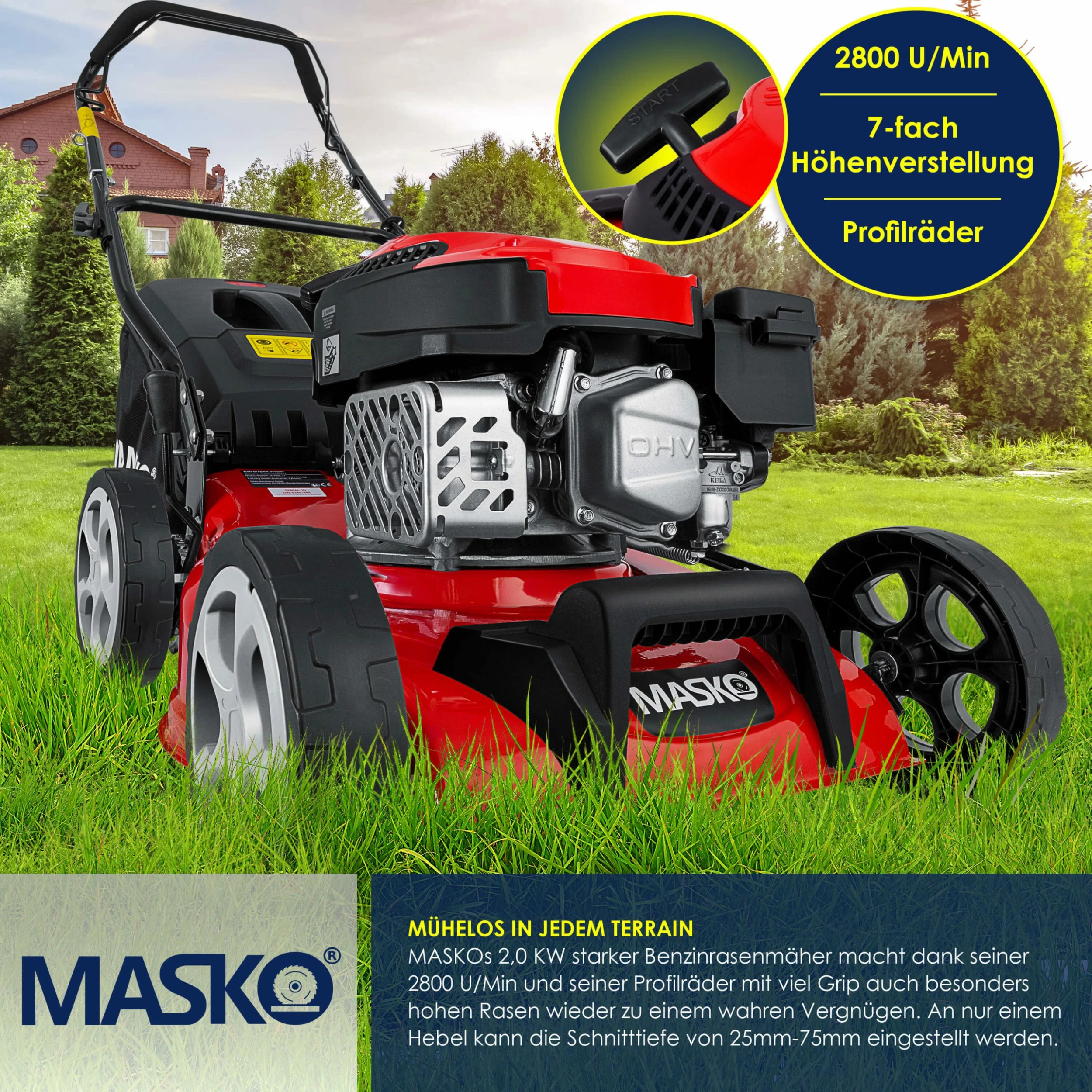 MASKO 5in1 Benzin Rasenmäher mit zuschaltbarem Hinterradantrieb bis 4,3 km/h, schnelle und gleichmäßige Reinigung dank Wasseranschluss, Mulchfunktion und Fangkorb mit hohem Volumen, extra große Schnittbreite von 51cm, Variable Schnitthöhe 8-stufig verstellbar