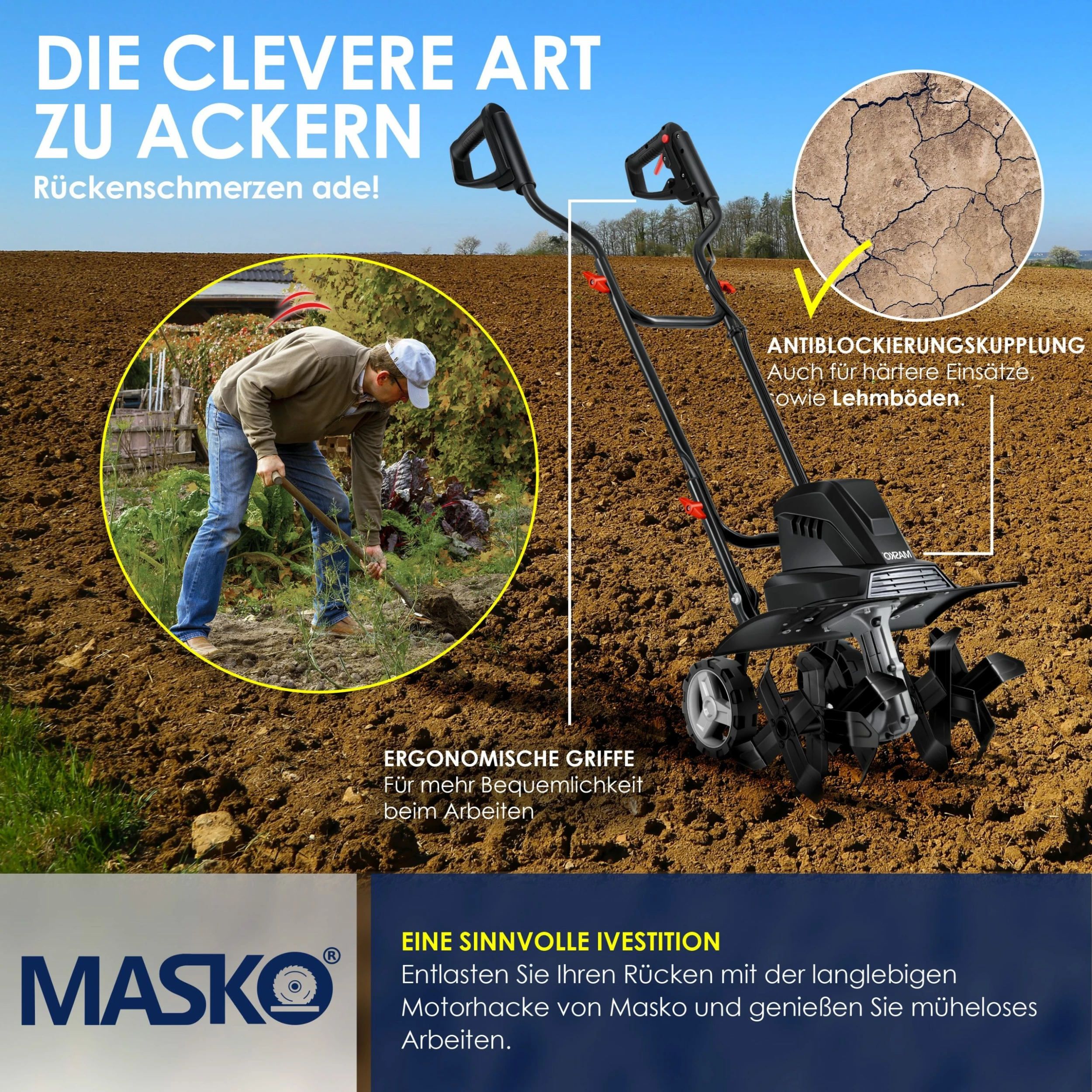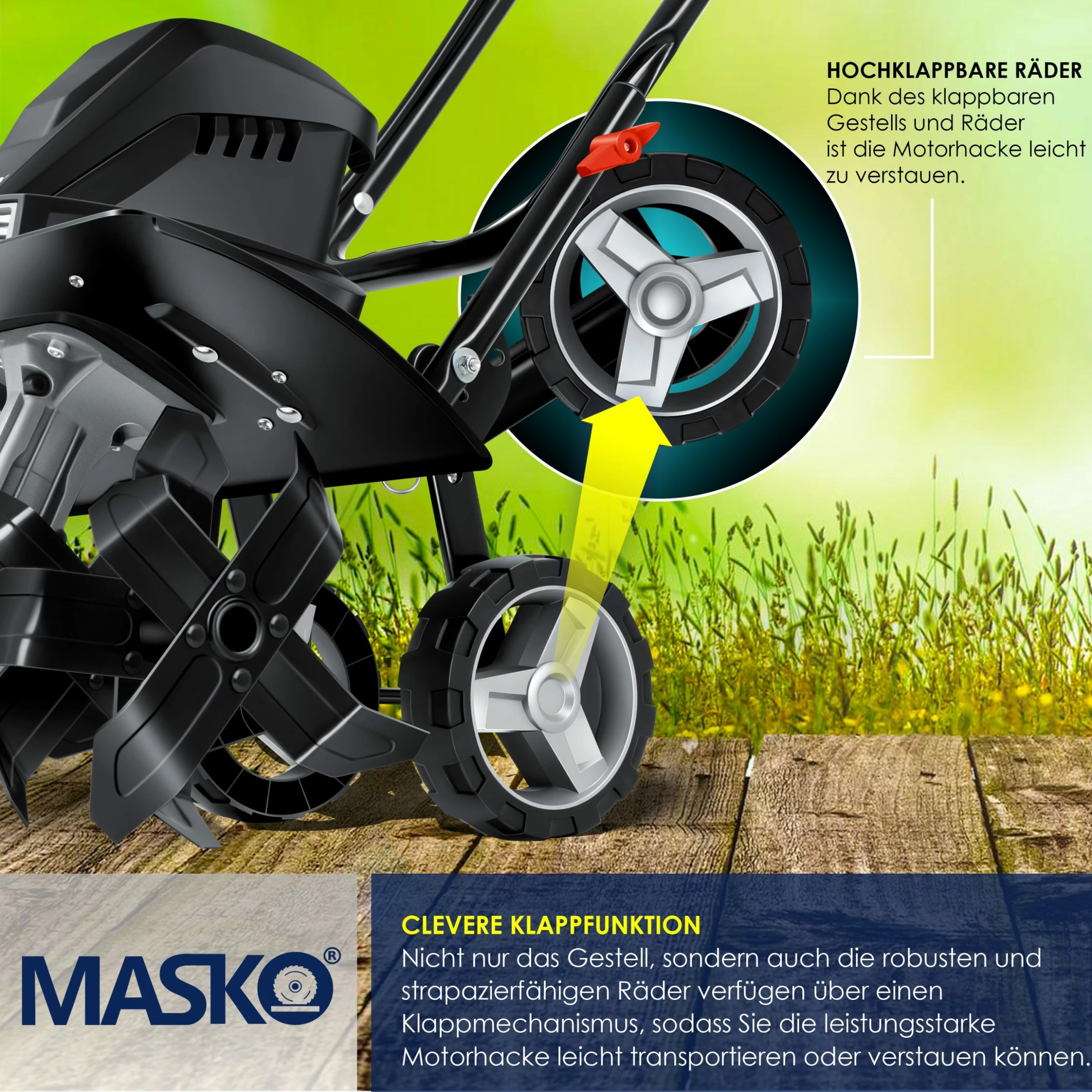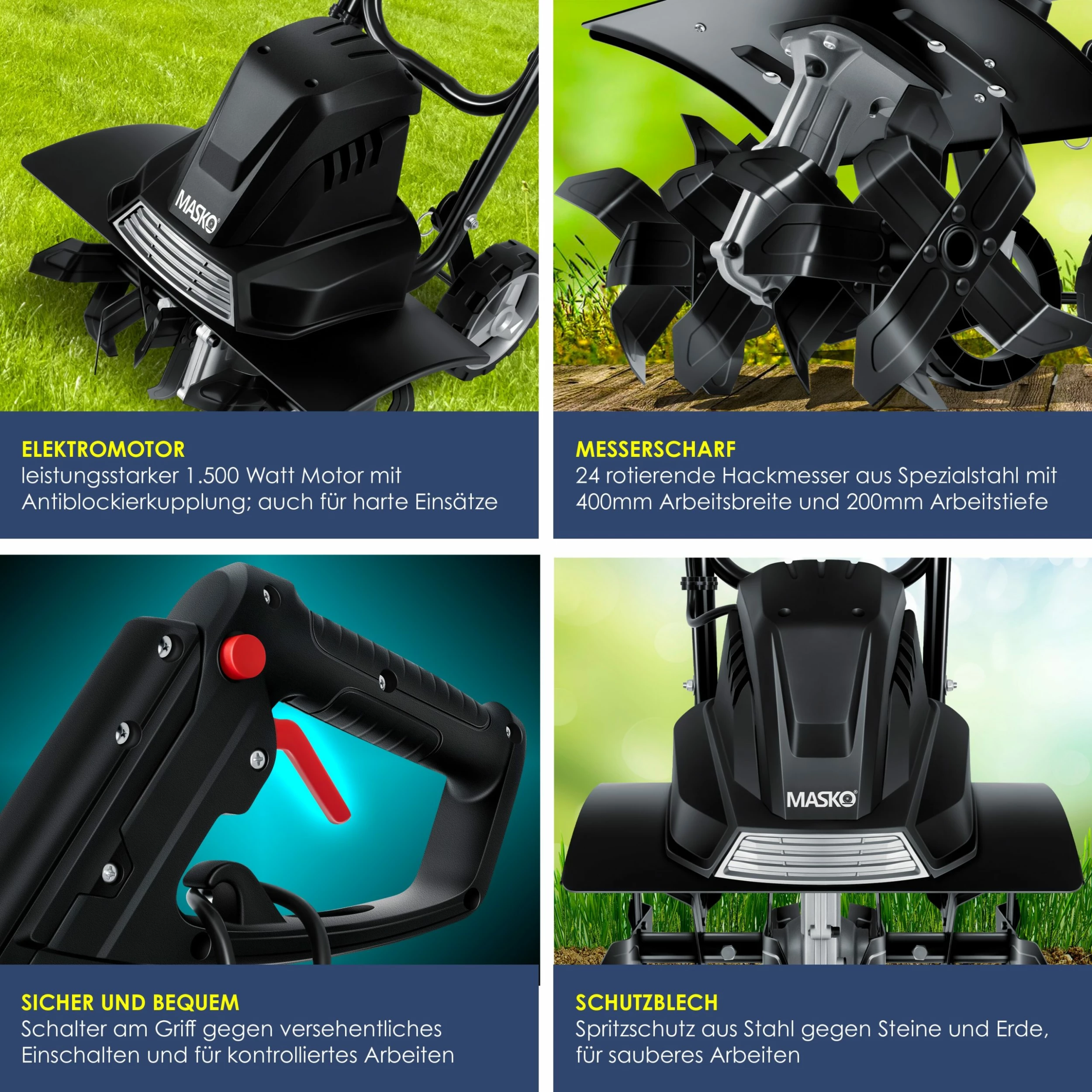 MASKO Bodenhacke mit Elektromotor zur Saatbettvorbereitung 1500 Watt mit ergonomischen Bike-Griffen und Schutzblech aus Stahl