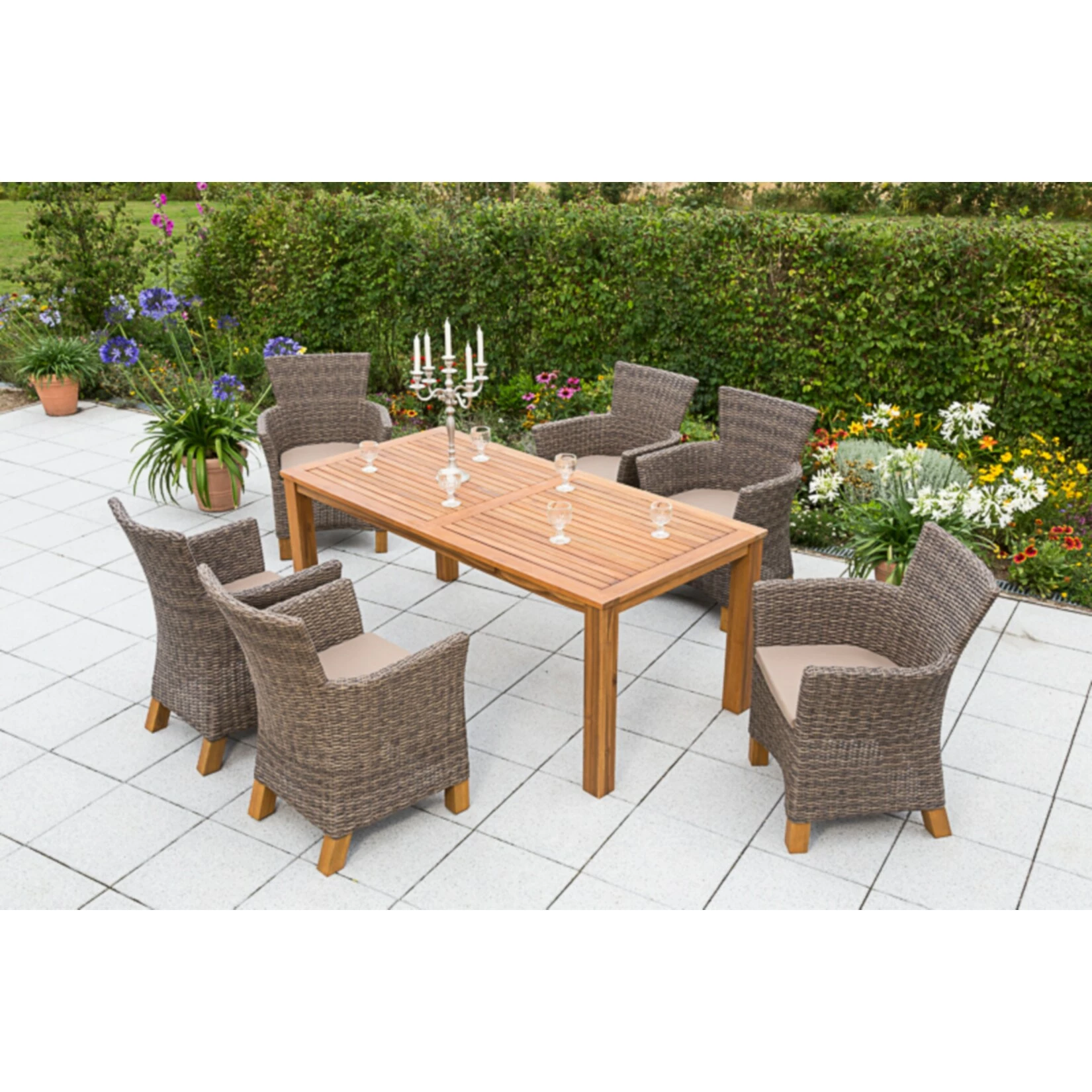 Die Tischgruppe Toskana erhalten Sie im 13-teiligen Set. Der sehr formbewusste Rattansessel Toskana, wird inkl. eines Sitzkissens geliefert und erweckt große und kleine Gärten mit seinem perfektem Sommerkomfort. Der Sessel ist aus Aluminiumgestell mit Kunstoffgeflecht / Polyrattan und Akazienbeinen gefertigt. Der Tisch ist aus klassichem Akazienholz geölt hergestellt.