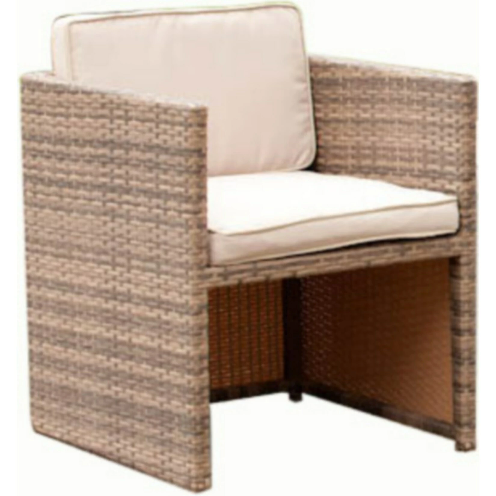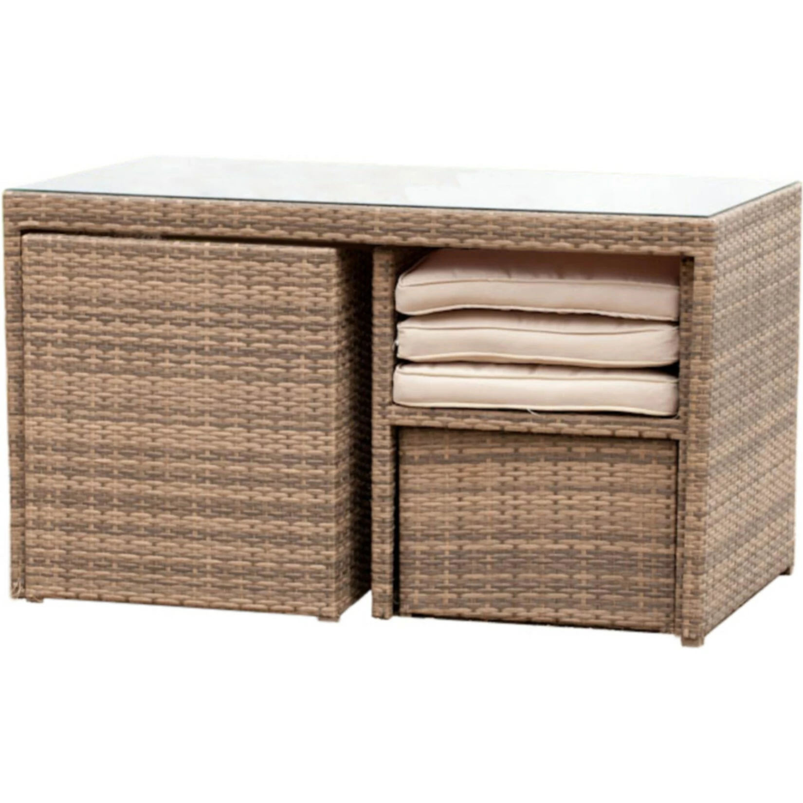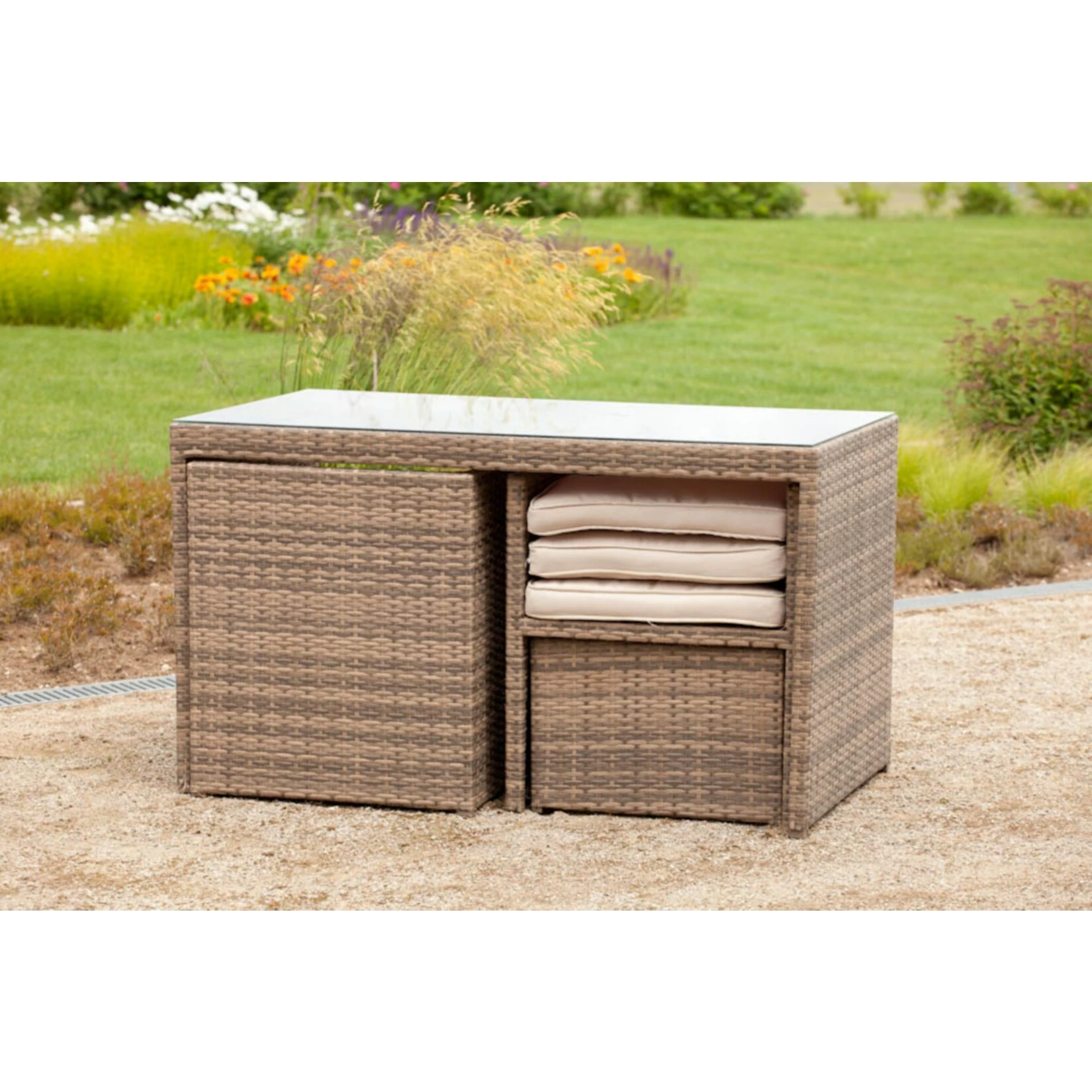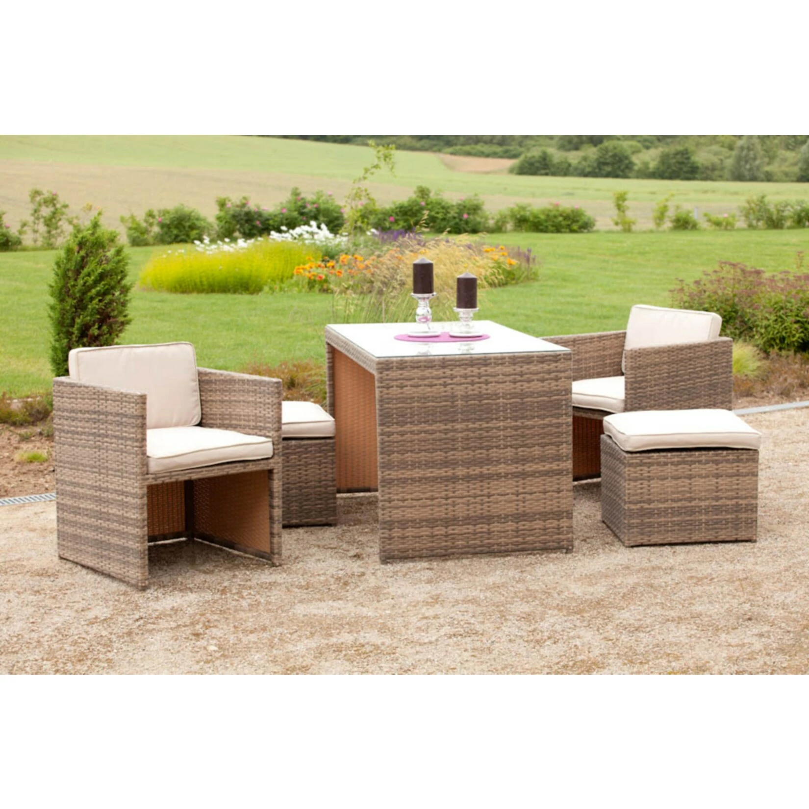 Die Tischgruppe Merano besteht aus 2 Sesseln, 2 Hockern und einem Tisch. Die Möbel aus einem Stahl- und Kunststoffgeflecht in Rattan-Optik sind ideal für Garten und Terrasse und ziehen alle Blicke auf sich.