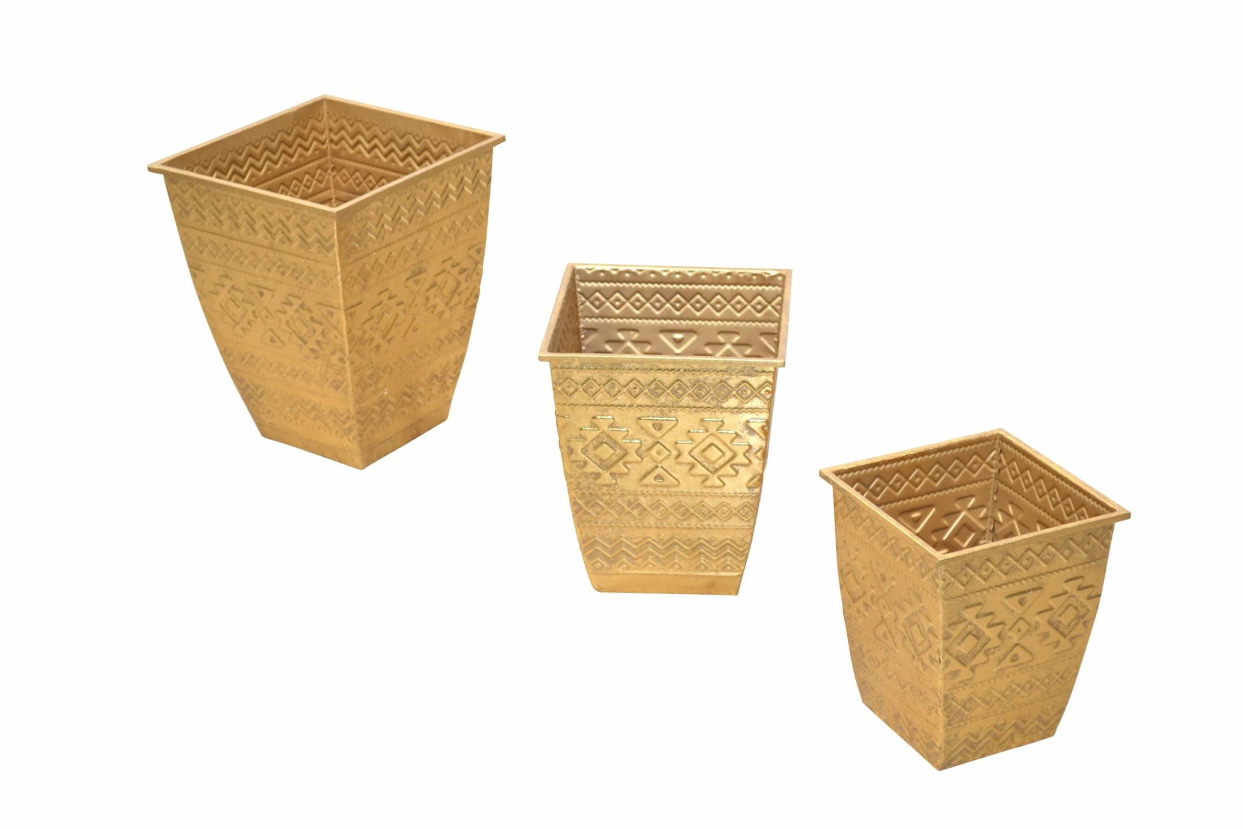 3tlg. Blumenübertopf-Set aus Metall mit reichlich Verzierung auf der Oberfläche gearbeitet und trendig goldfarben, lackiert. Nicht wasserdicht, bitte in Verbindung mit einem Einsatz nutzbar. Maße der einzelnen Übertöpfe: (B/H/T) 32/40/32 /// 26,5/32,5/26,5 und 22/27/22. Innenmaße ca. cm: (B/H/T) 29,5/39,5/29,5, unten 18×18 cm /// 24,5/32,5/24,5 unten 16,5×16,5 cm und 20/26,5/20 unten 14×14 cm.