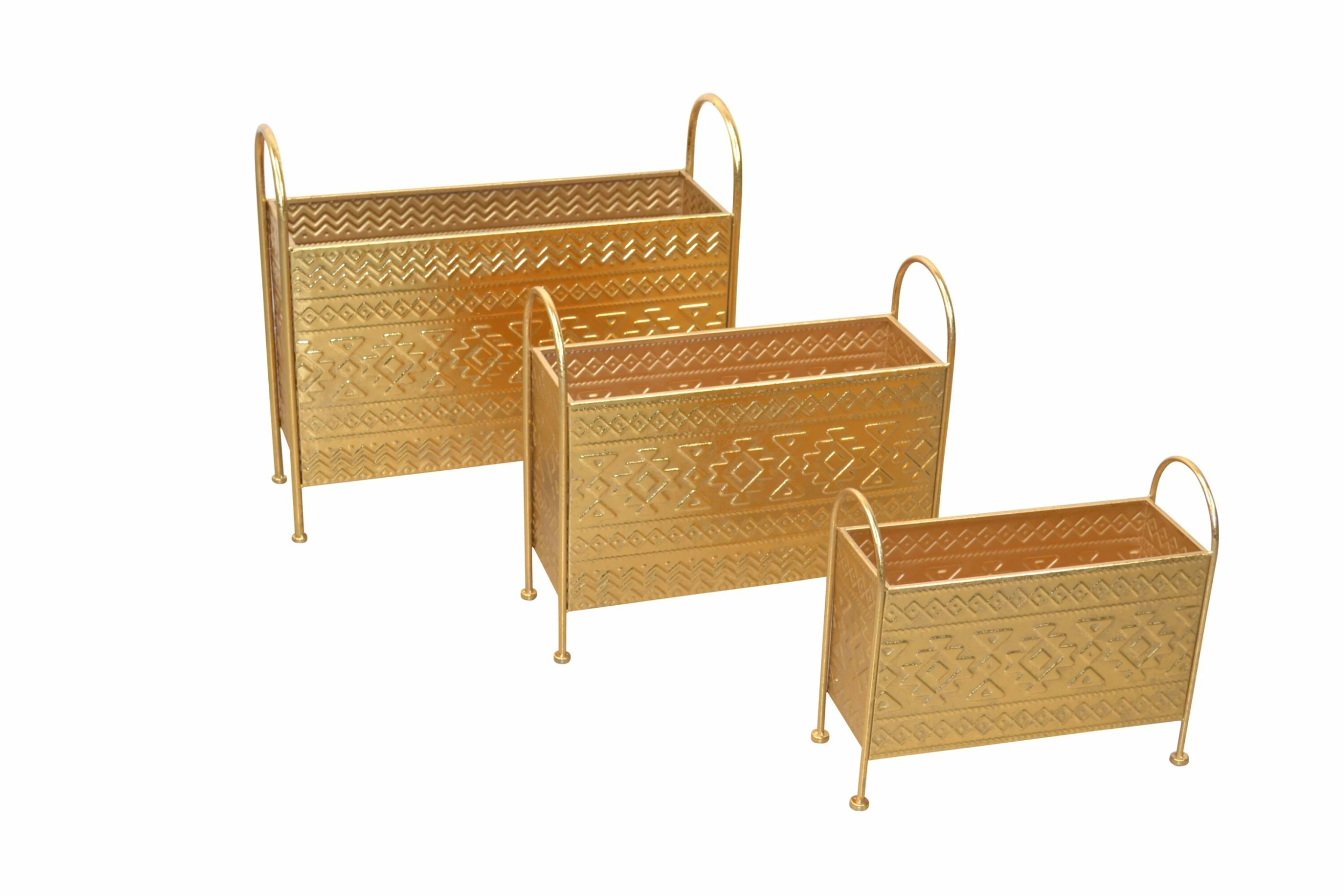 3tlg. Blumentopf-Set komplett aus Metall mit reichlich Verzierung gearbeitet, goldfarben beschichtet. Nicht wasserdicht, deshalb bitte einen zusätzlichen Einsatz verwenden. Maße der Einzeltöpfe ca. cm: (B/H/T) 62,5/56/21 // 50/46/18,5 und 40/35/16. Innenmaße ca. cm: (B/H/T) 57,5/33,5/18,5 // 46/27,5/15,5 und 36,5/21/12,5.