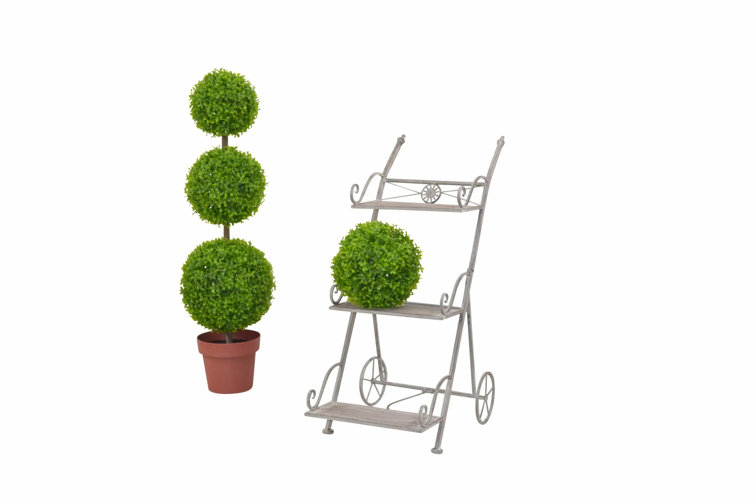 Praktische Regal bzw. Blumenständer aus Metall mit einer trendigen Oberfläche, antik grau lackiert. Insgesamt 3 Abstellflächen, ca. 32 x 14,5 cm groß und Abstand jeweils ca. 26 cm. Die Blumentreppe ist für den Innenbereich aber auch für den Außenbereich geeignet. Schön auch die Verzierungen seitlich und oben. Regal wird montiert geliefert. Maße ca. cm: B. 37 x T. 58 x H. 82 cm.