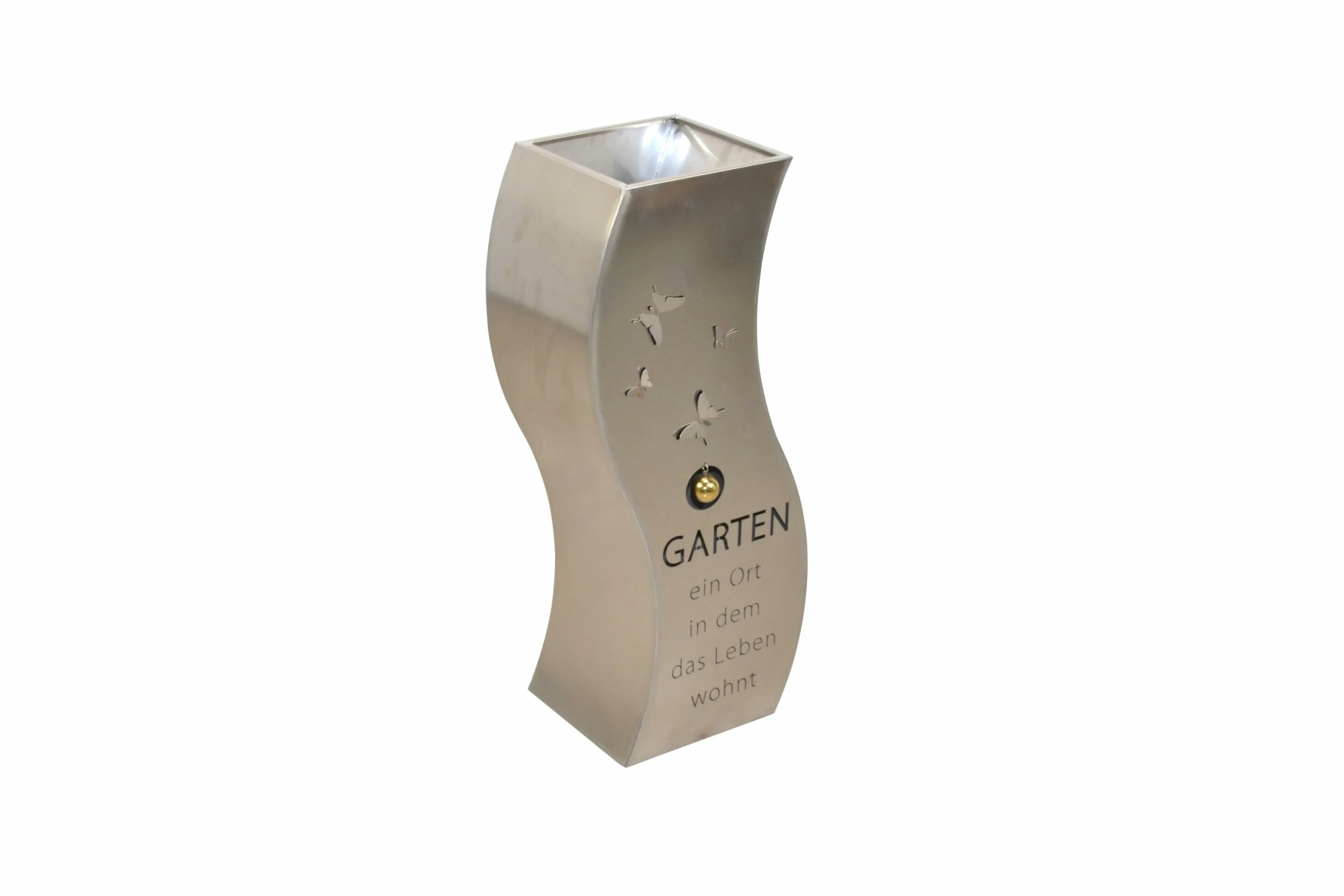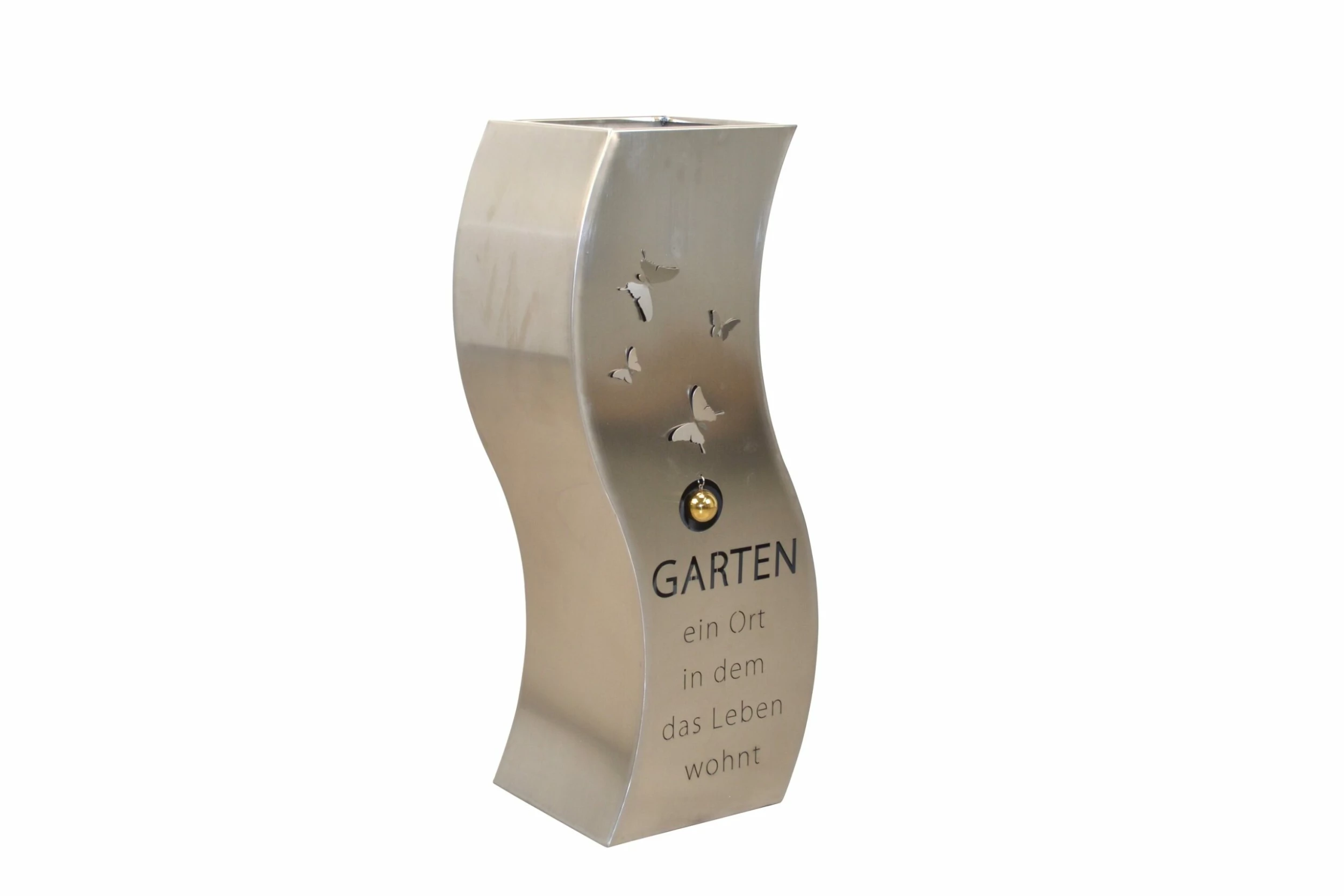 Dekorativ, praktisch und funktionell ist diese schöne Edelstahl-Pflanzensäule mit geschwungenen Korpus. Die Oberfläche ist silberfarben, mit ausgestanzten Spruch und oben mit 4 schönen Schmetterlingen kombiniert. Kreis mit goldfarbener Kugel. Oben ein integrierte Pflanzschale ca. 20x22x12 cm. Gesamthöhe ca. 80 cm, Breite 35 cm, Tiefe 25 cm. Die Pflanzschale verfügt über ein Wasserloch, damit überflüssiges Wasser abtropfen kann. Diese schöne Edelstahl-Pflanzsäule ist im Garten, im Eingangsbereich oder im Wohnbereich ein absoluter Hingucker.