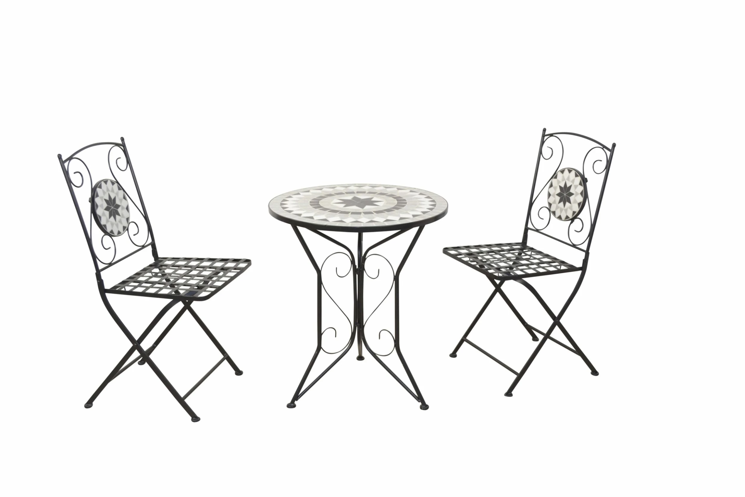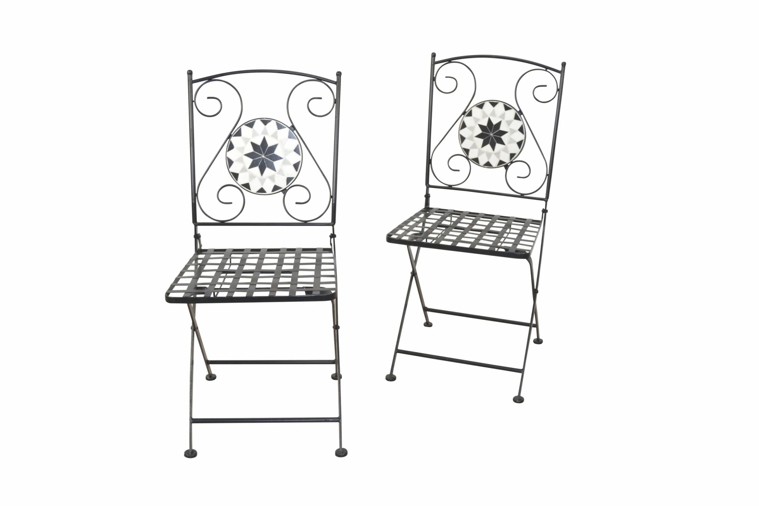 Die eleganten und wunderschönen Gartenstühle “Bamberg” sind aus Eisen gefertigt und ein toller Blickfang auf ihrer Terrasse, Balkon oder im Garten. Das Eisengestell ist, uni schwarz pulverbeschichtet und zeichnet sich durch eine große Stabilität aus. Stühle klappbar, Rücken mit schwarz-weißen Mosaiksteinen beklebt. Maße je Stuhl: B. 40 x T. 54 x H. 89 cm. Sitzhöhe ca. 46 cm. Möbel werden im Paket flach verpackt angeliefert, mit Aufbauanleitung. Passender Tisch auch lieferbar.