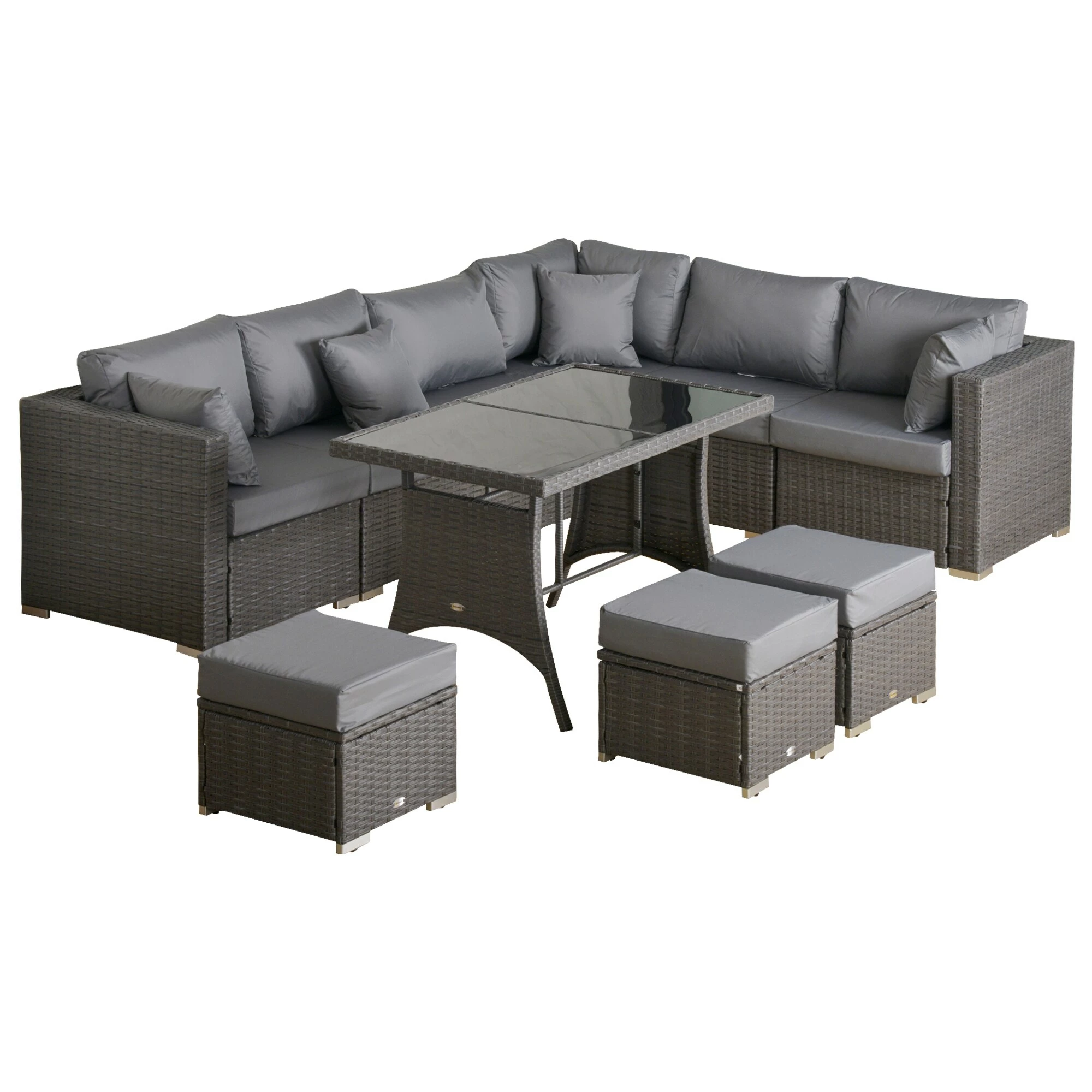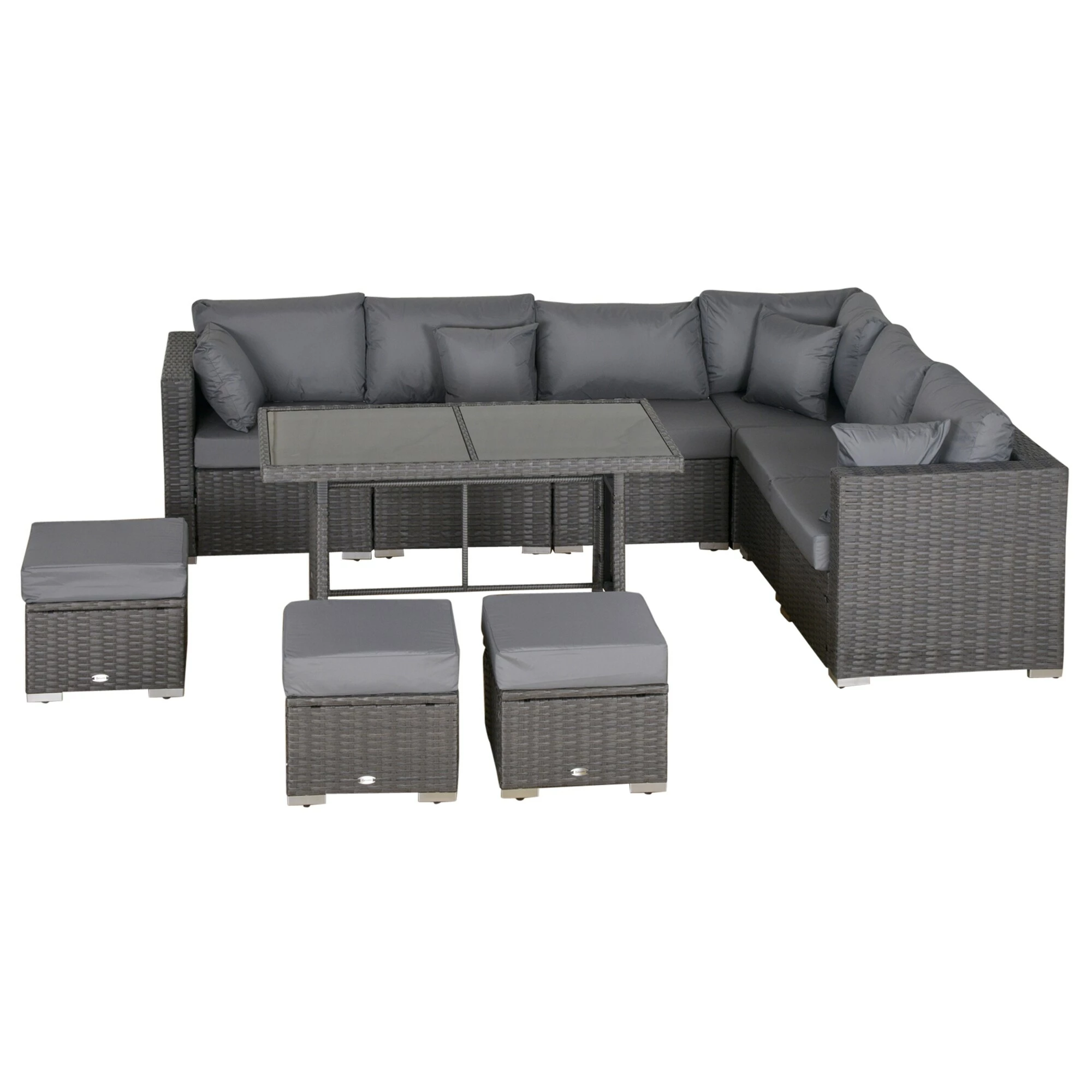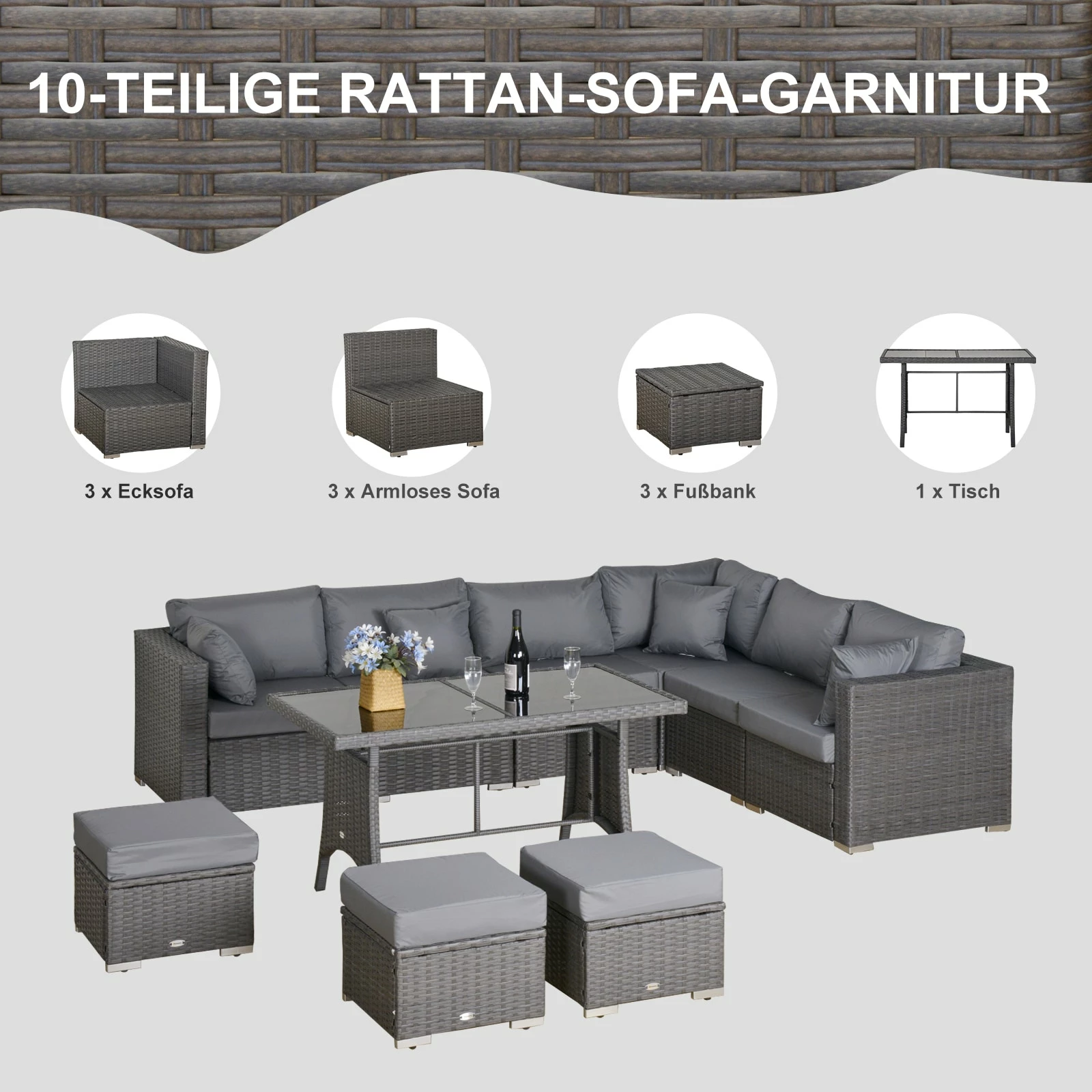 Unsere edle Polyrattan Sofagarnitur ist der perfekte Entspannungsort für wärmere Tage. Das 10-teilige Set zeichnet sich durch modernes Design und hochwertige Verarbeitung aus. Das macht Ihre Sitzgruppe perfekt für den Einsatz im Freien. Der geräumige Tisch ist mit einer belastbaren Glasplatte versehen und eignet sich ideal für gemeinsames Frühstücken oder auch Abendessen.