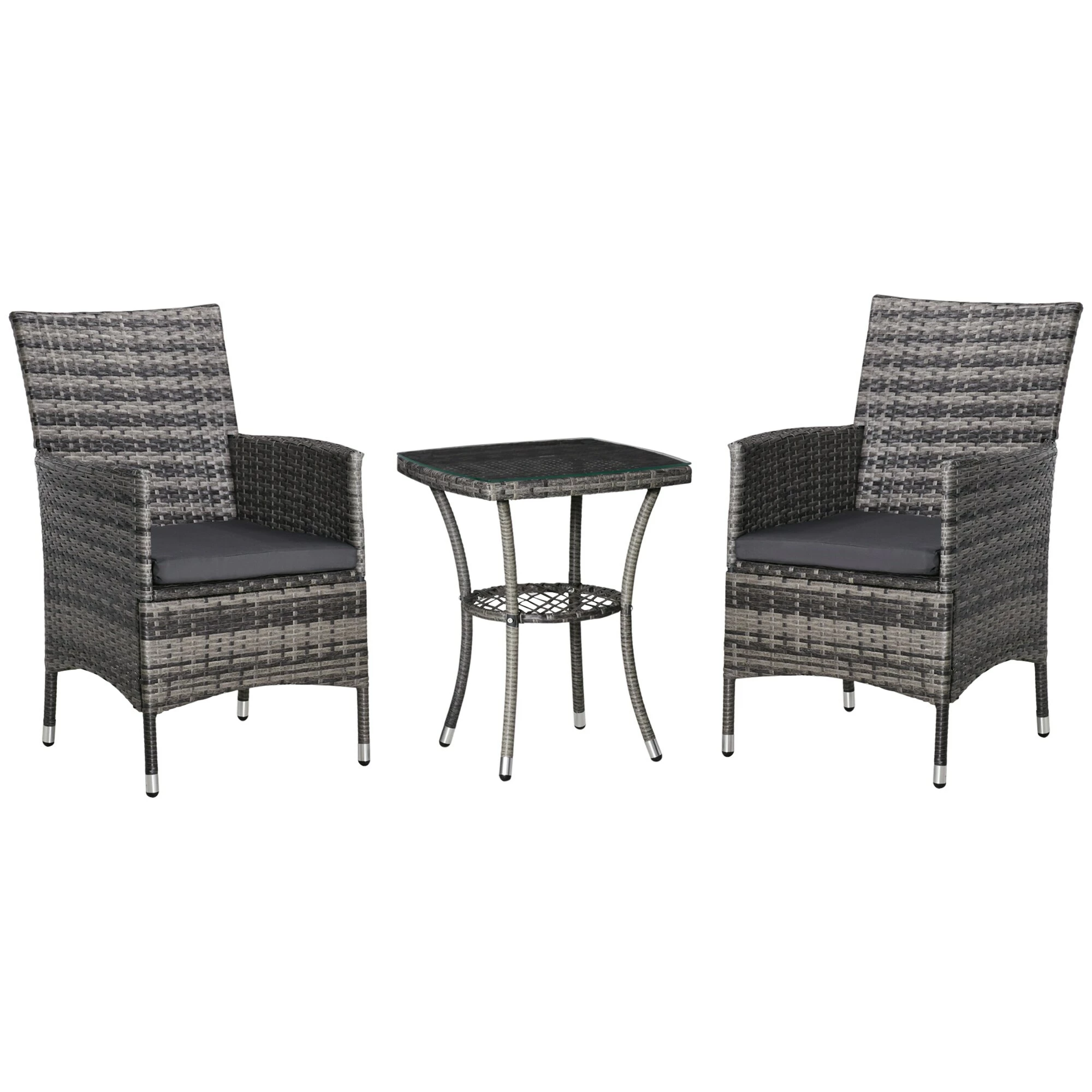 Mit dieser Sitzgruppe für zwei Personen bringen Sie Schick und Komfort auf Terrasse und Balkon. Das Set in Rattan-Optik besteht aus zwei Stühlen und einem Tisch mit gehärteter Glasplatte. Im Lieferumfang enthalten sind auch zwei dicke Polsterkissen mit waschbarem Bezug. Hier können Sie es sich bei einem Kaffee oder Wein so richtig gemütlich machen.