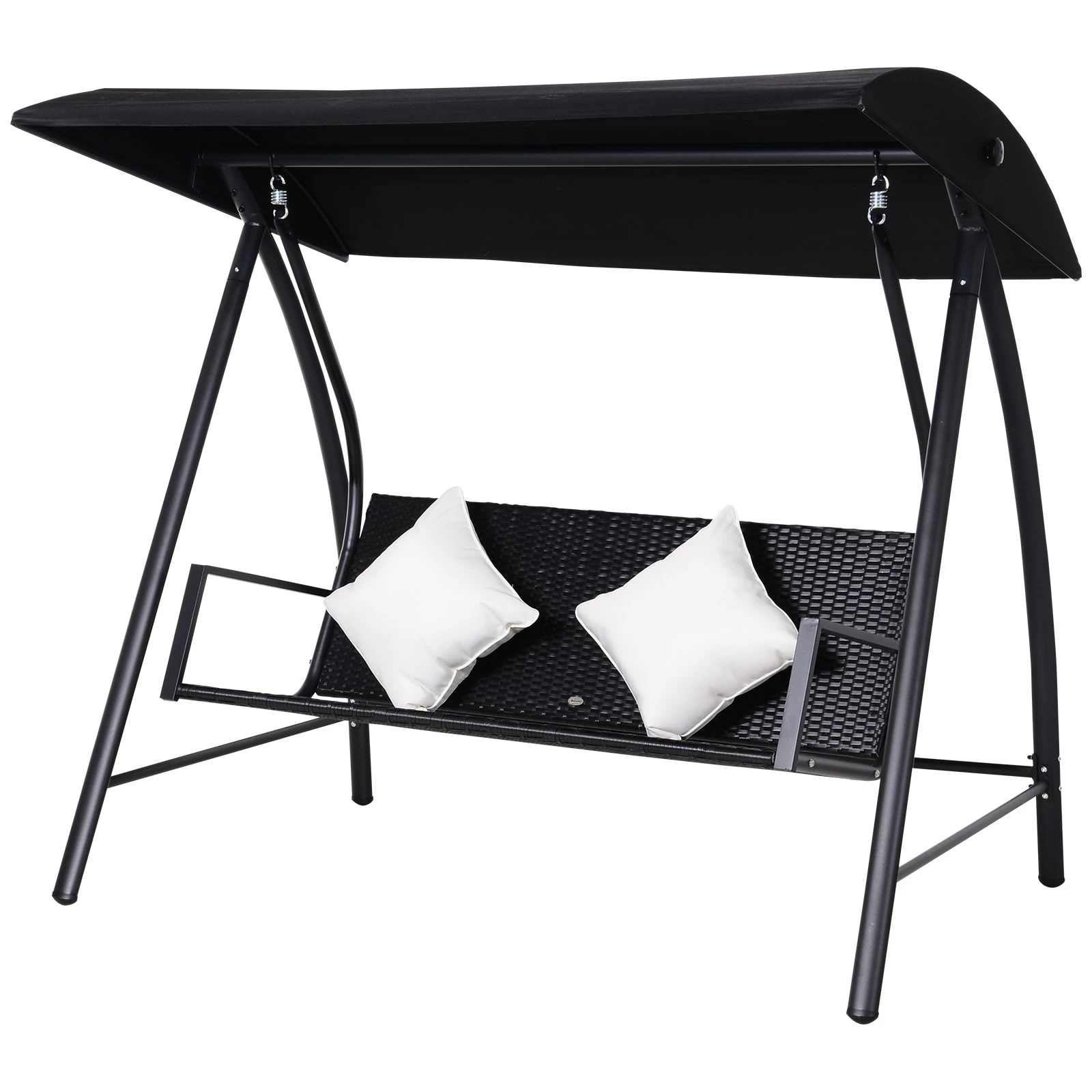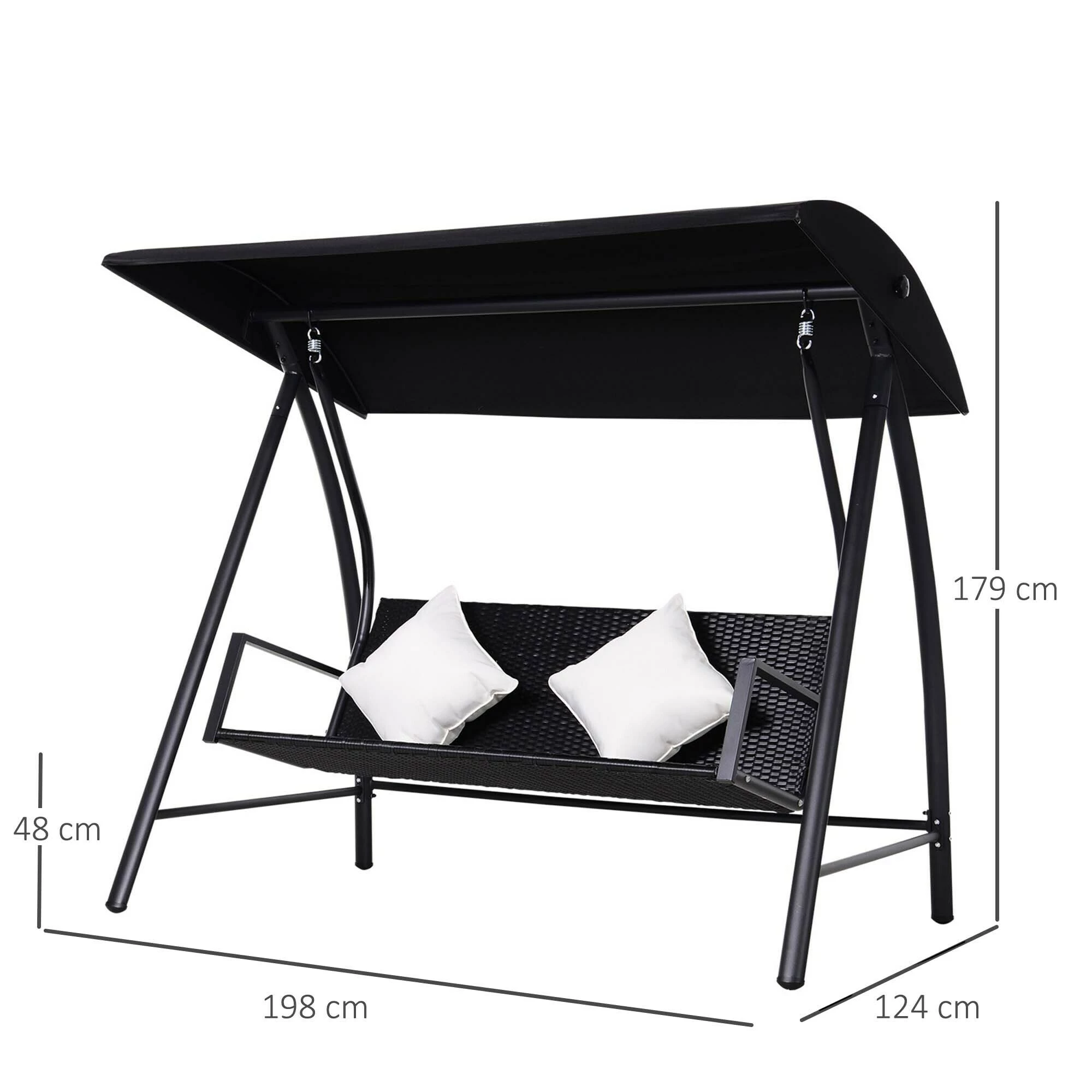 Modern und elegant präsentiert sich die schwarze Hollywoodschaukel. Klare Formen, dezente Rundungen und gedeckte Farben machen Ihre Schaukel zu einem wahren Blickfang für den Garten. Die bequeme Sitzfläche ist aus trendigem Polyrattan gefertigt. Das Kunstfasergeflecht zeichnet sich besonders durch seine Outdoortauglichkeit aus. Es ist witterungsbeständig, pflegeleicht und ausgesprochen langlebig. Zwei dekorative Kissen im kontrastreichen Cremefarben befinden sich ebenfalls im Lieferumfang. Zum Schutz vor intensiver Sonneneinstrahlung und leichtem Regen ist ein Sonnendach montiert. Als Material wurde Polyester genutzt, welches schmutz- sowie wasserabweisend ist.