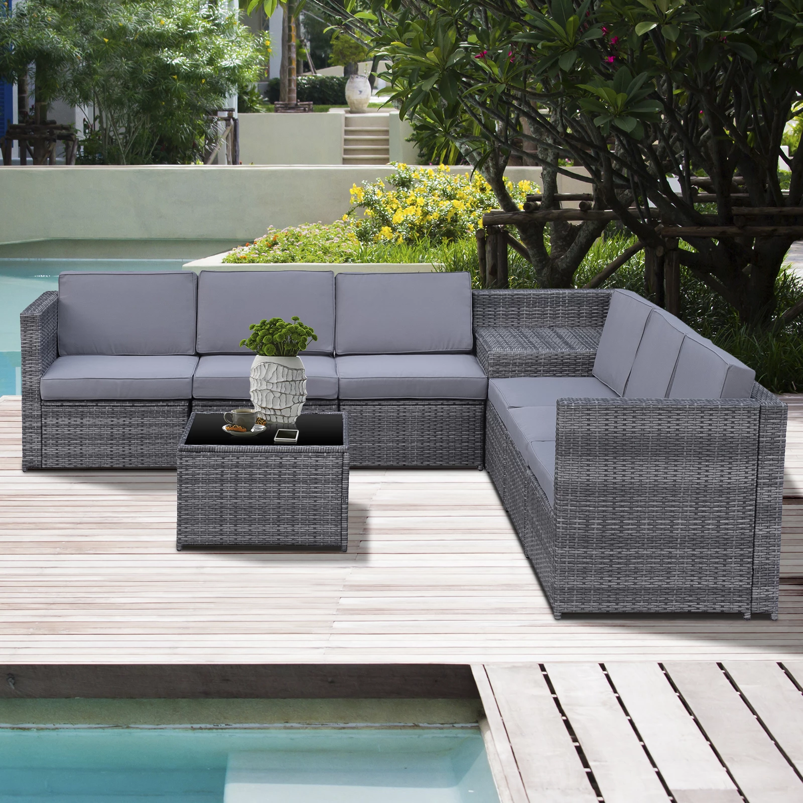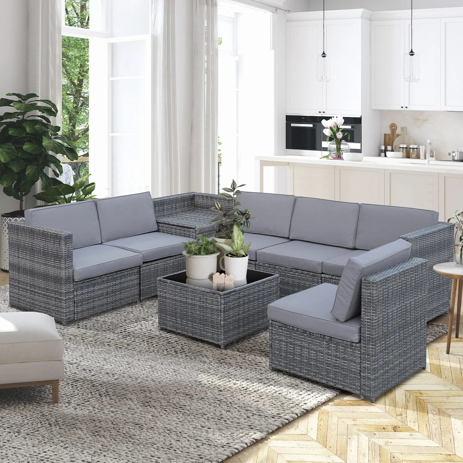 - Lieferumfang: 1 x Couchtisch, 1 x Ecktisch, 2 x Ecksessel, 4 x Mittelsessel, Inkl. Kissen