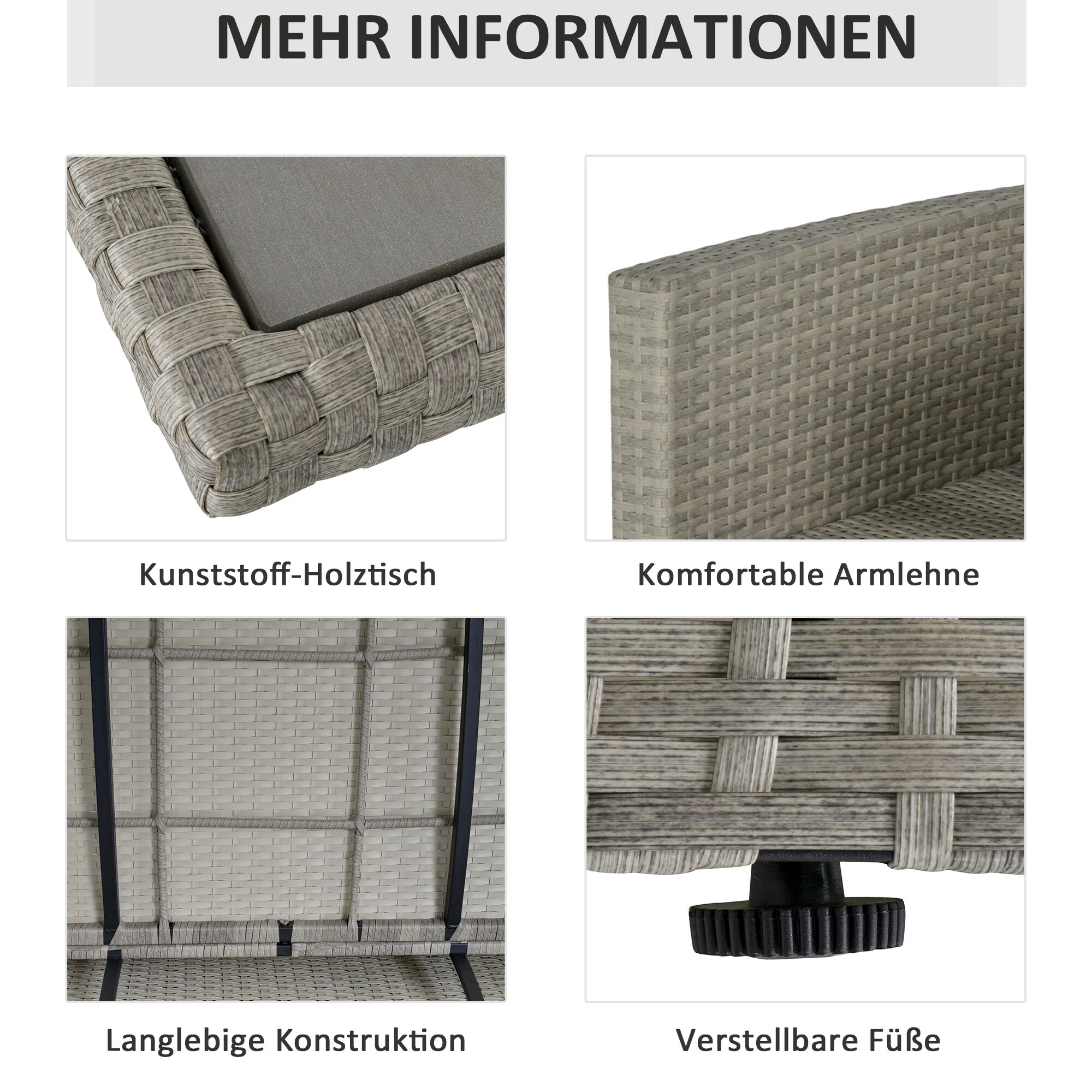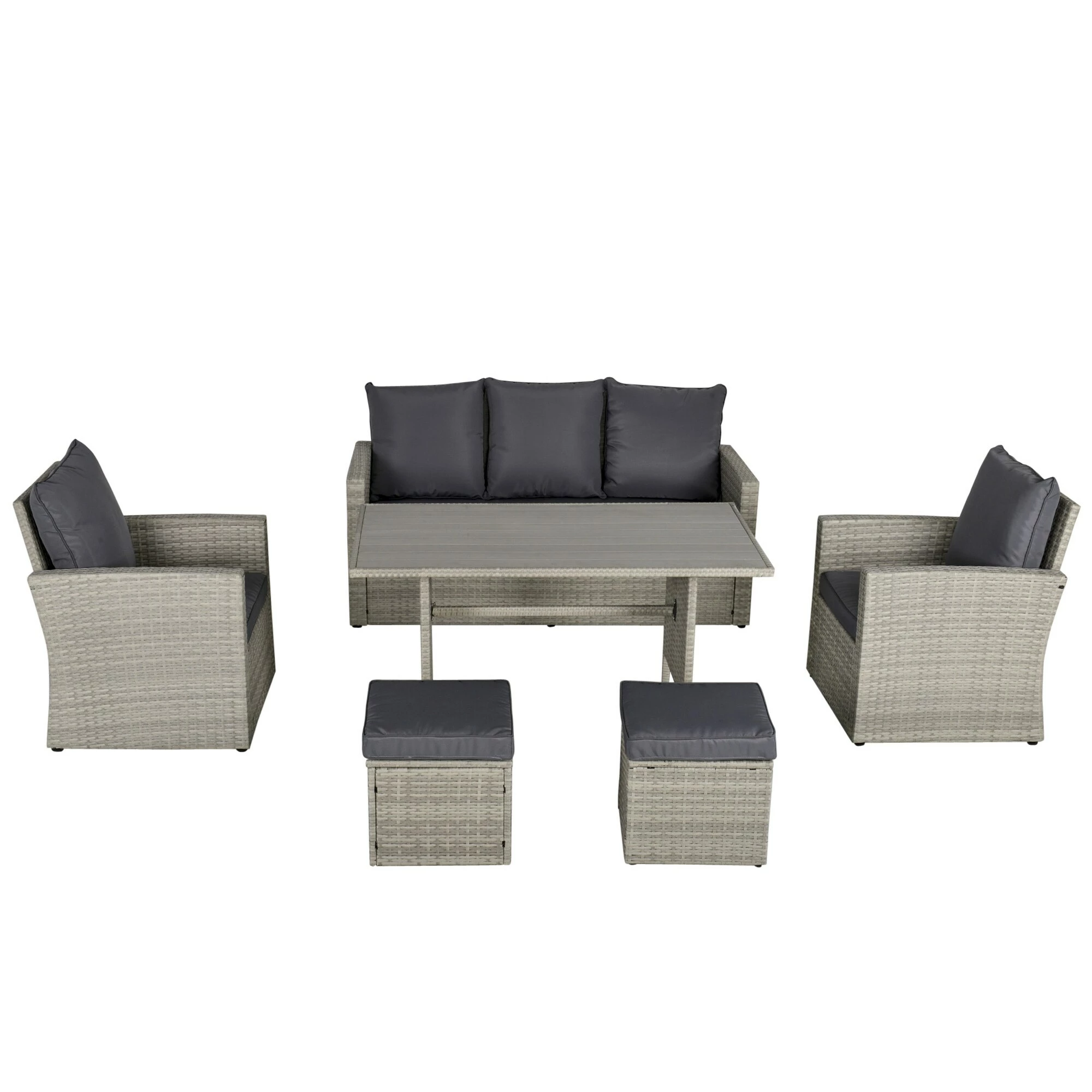 Dieses 6-teilige Outdoor-PE-Rattan-Essgruppe ist aus rostfreiem Stahlrahmen mit Pulverbeschichtung hergestellt, das handgeflochtene PE-Rattan ist stark genug, um allen Wetterbedingungen zu widerstehen. Weiche, dick gepolsterte Rücken- und Sitzkissen schaffen das ultimative Sitzgefühl im Freien. Der Esstisch wird mit einer Kunststoff-Holz-Tischplatte geliefert, um Ihrem Garten Stil zu verleihen.