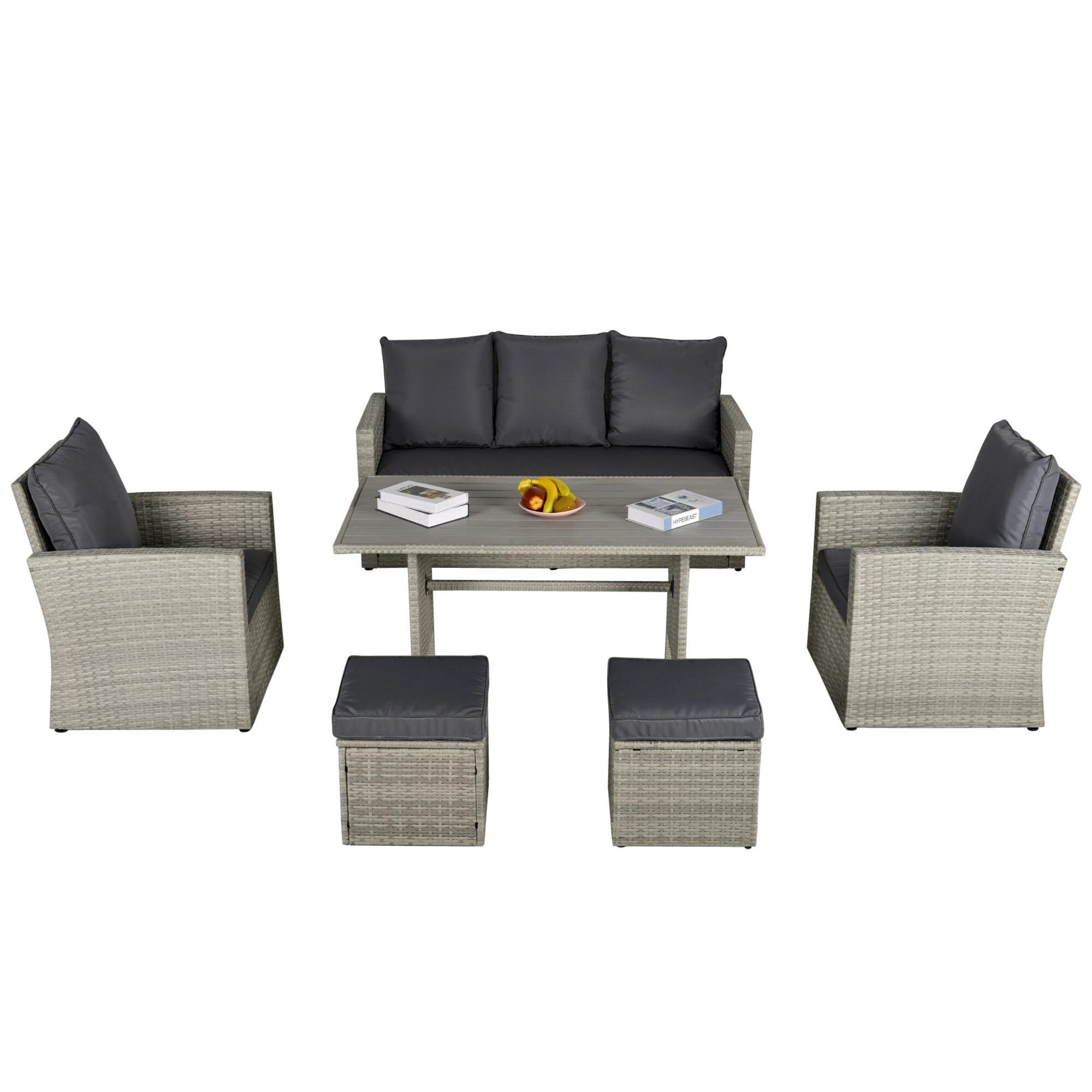 - Lieferumfang: 1 x Dreisitzer-Sofa, 2 x Einzelsofa, 1 x Esstisch, 2 x Fußhocker, 5 x Sitzkissen, 5 x Rückenkissen