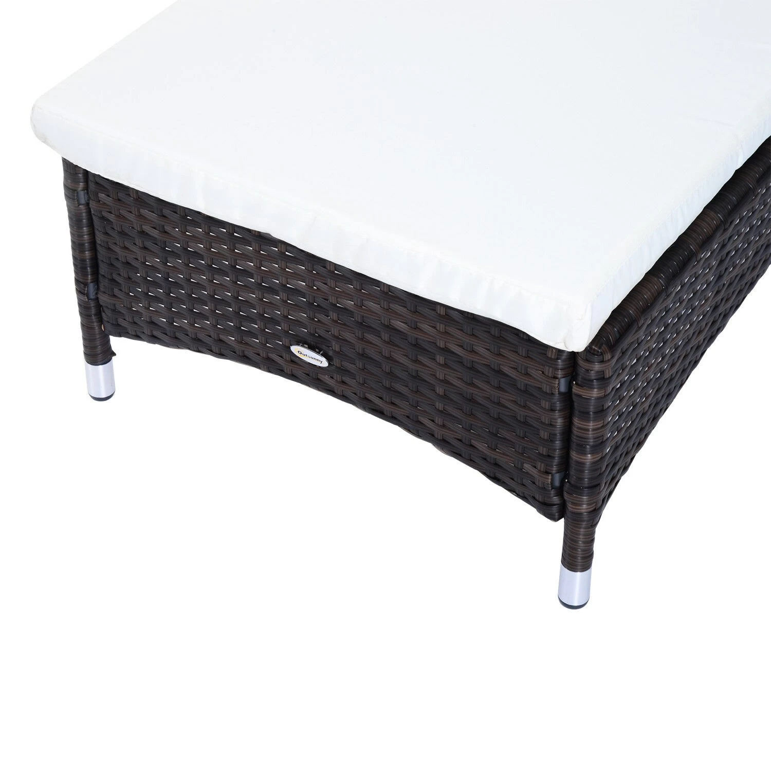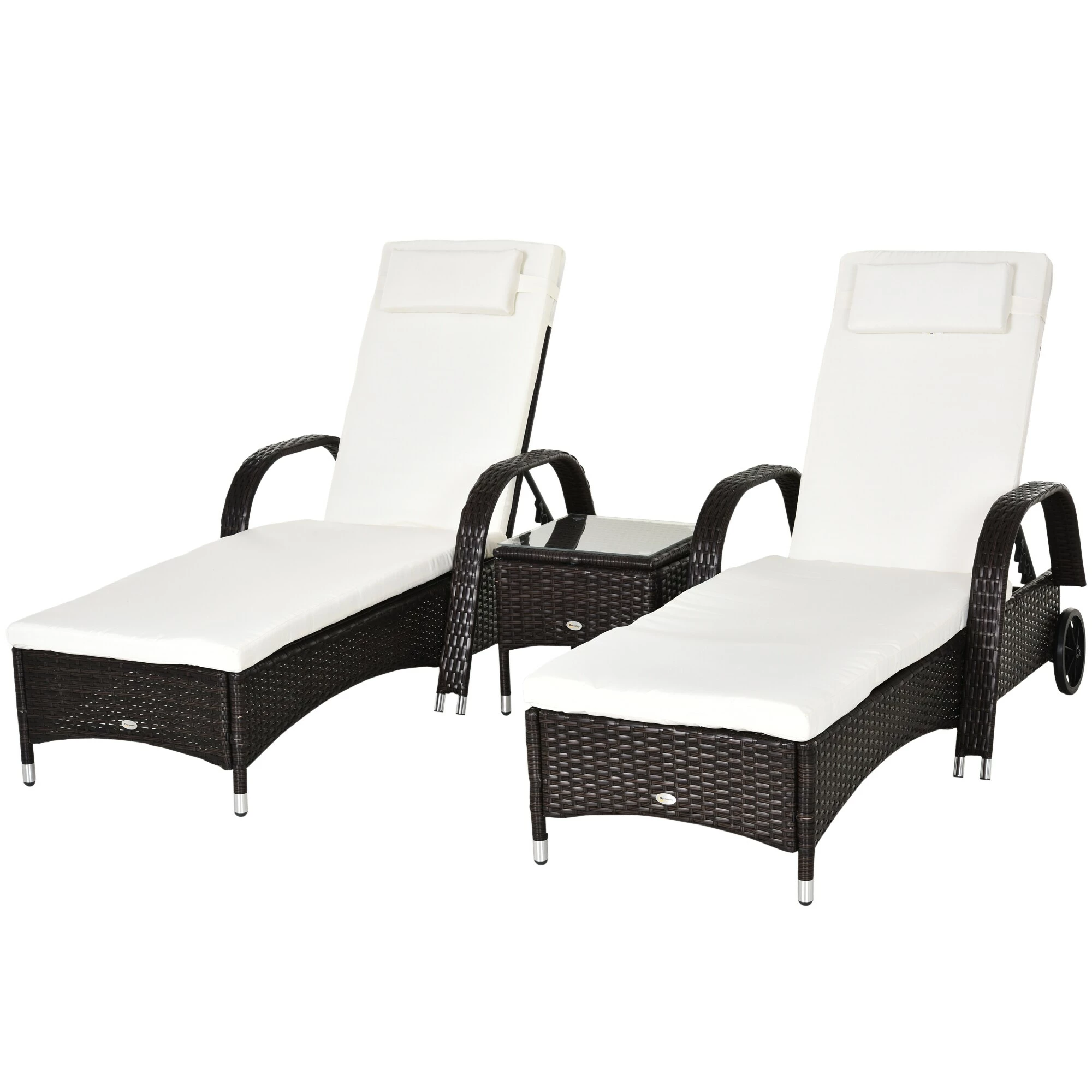 Unser 3-teiliges Gartenmöbel-Set von Outsunny aus Polyrattan zeichnet sich sowohl durch das innovative Design als auch die erstklassige Verarbeitung aus. Bestehend aus zwei Sonnenliegen und einem Beistelltisch ist es das perfekte Set für gemütliche Sommertage zu zweit. Das handgeflochtene Polyrattan ist witterungsbeständig und äußerst stabil. Das Metallgestell der Liegen ist pulverbeschichtet und damit gegen Rost geschützt. Die Sonnenliegen mit neigungsverstellbaren Rückenlehnen und weich gepolsterten Kissen gewährleisten ein ideales Liegevergnügen. Dank der zwei Rollen sind die Gartenliegen einfach zu bewegen, sodass Sie überall darauf entspannen und die Sonne in vollen Zügen genießen können.