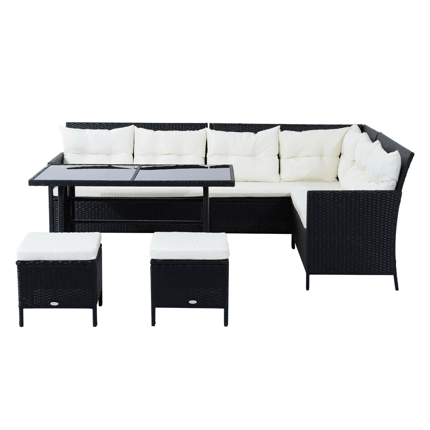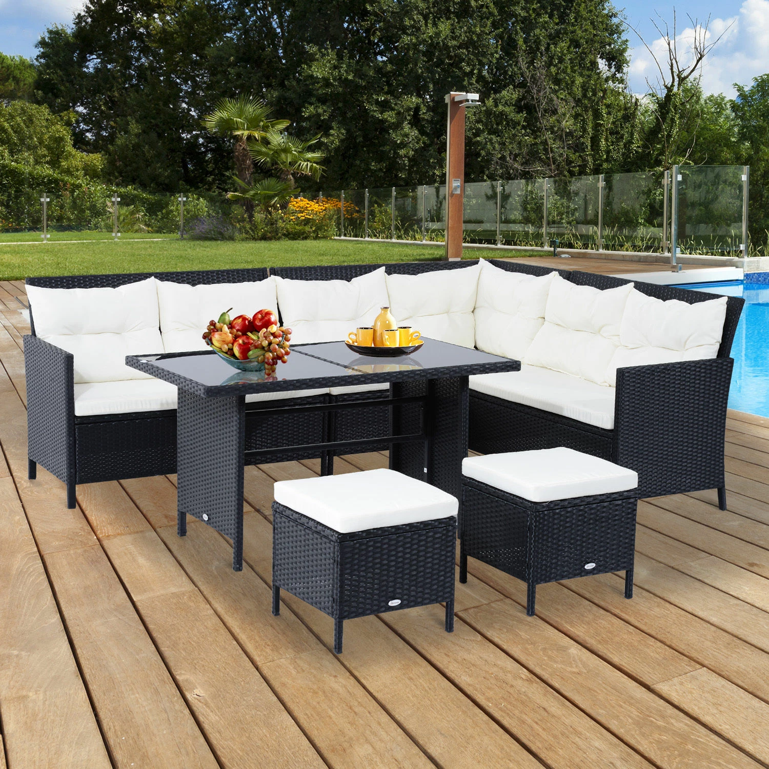 - Lieferumfang: 1 x Tisch inkl. 2 Sicherheitsglasplatten,2 x Doppelsofa, 1 x Ecksofa,2 x Hocker, 2 x Sitzkissen für Hocker, 3 x Sitzkissen für Sofa, 7 x Rückenkissen, 1 x Montageanleitung