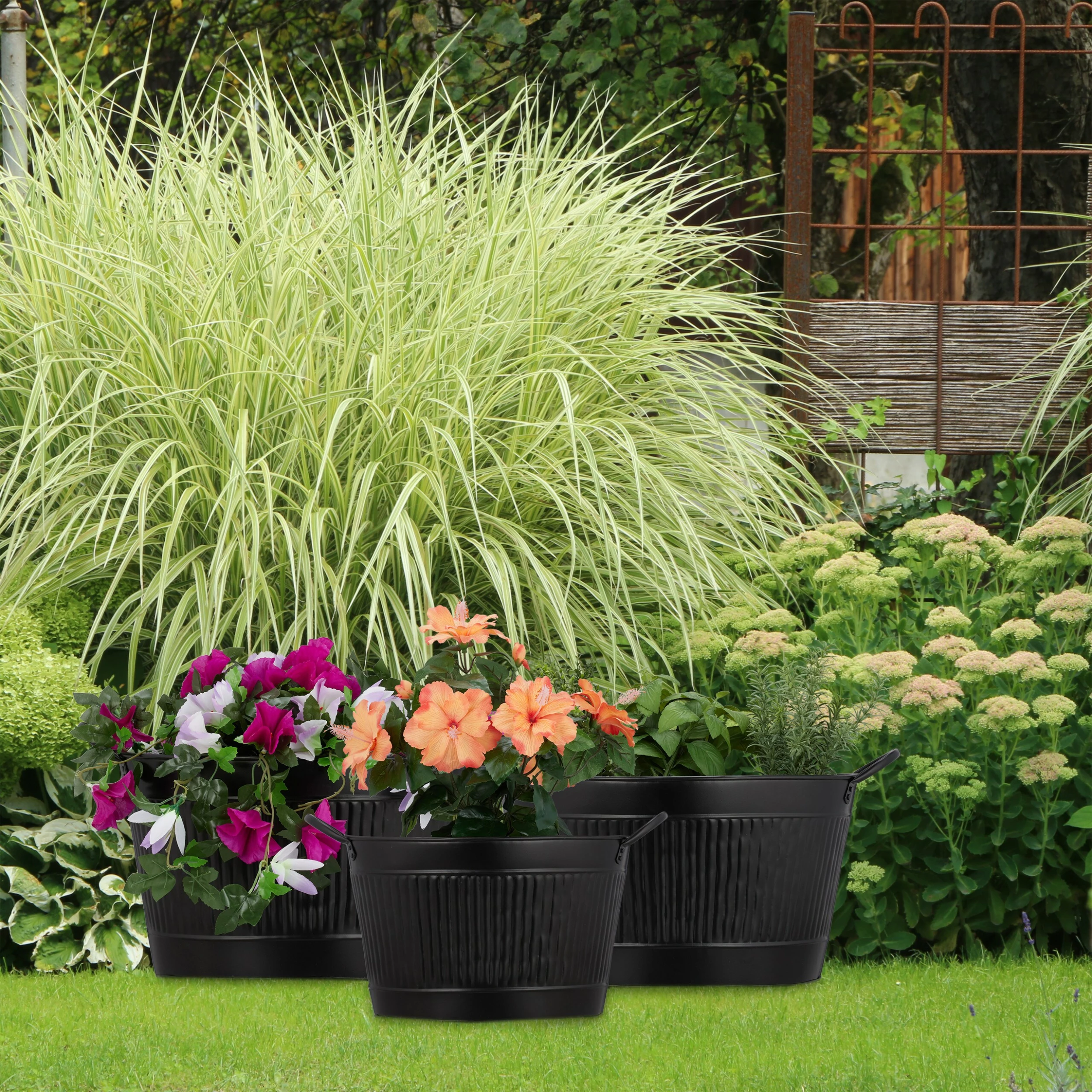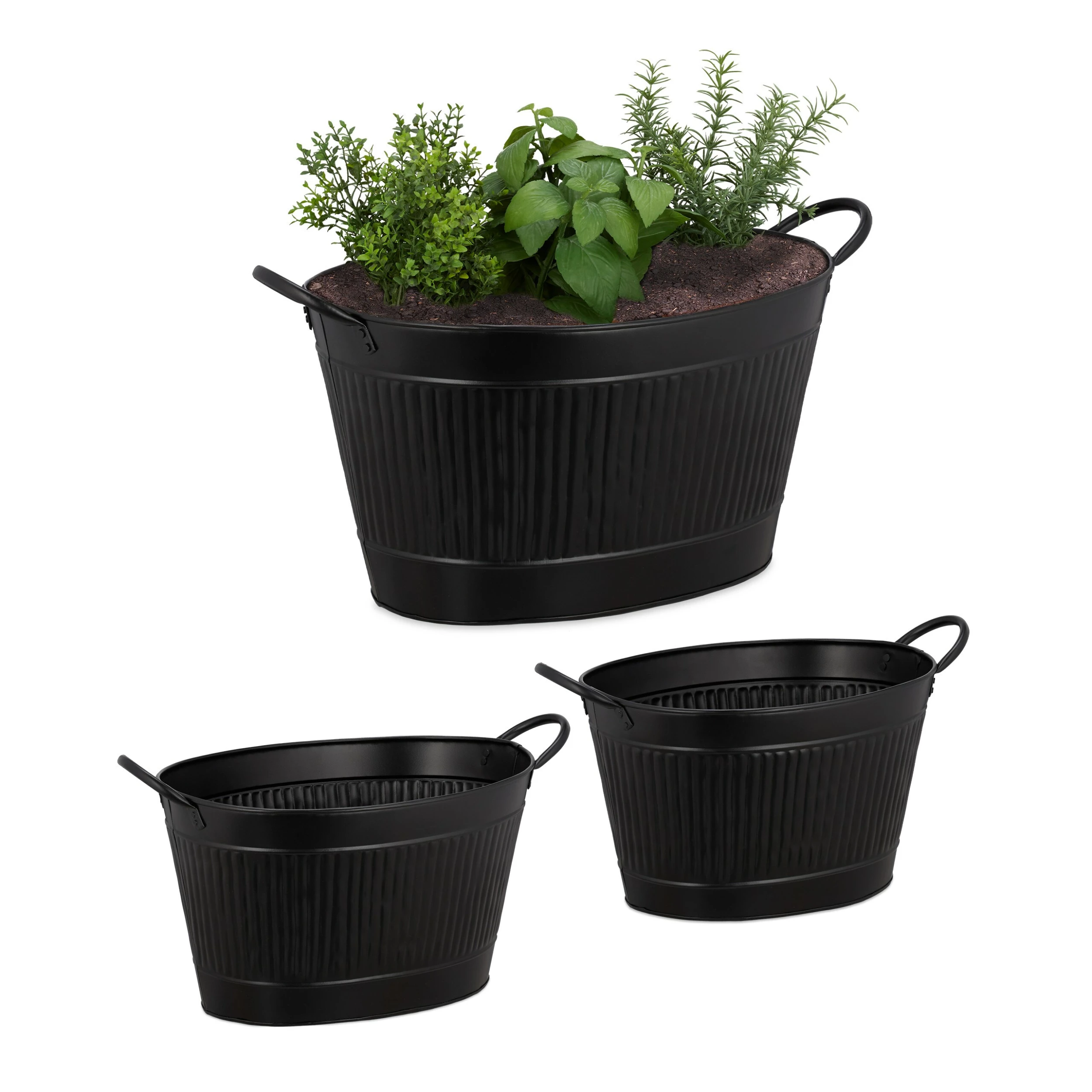 Das Dekowannen 3er Set im rustikalen Zinkwannen-Look präsentiert hervorragend Pflanzen auf Balkon, Terrasse oder im Garten. In die Pflanzwannen können Blumen und Kräuter gepflanzt werden oder Sie nutzen Sie lediglich als dekorativen Übertopf. Die wasserdichten Metallwannen sind für zahlreiche Outdoor Arrangements geeignet und können nebeneinander aufgestellt oder getrennt voneinander mit ihrem rustikalen Charme überzeugen. Genauso gut lassen sich die ovalen Gartenwannen aber auch als Eiskübel für Getränke auf der nächsten Sommerparty verwenden.
