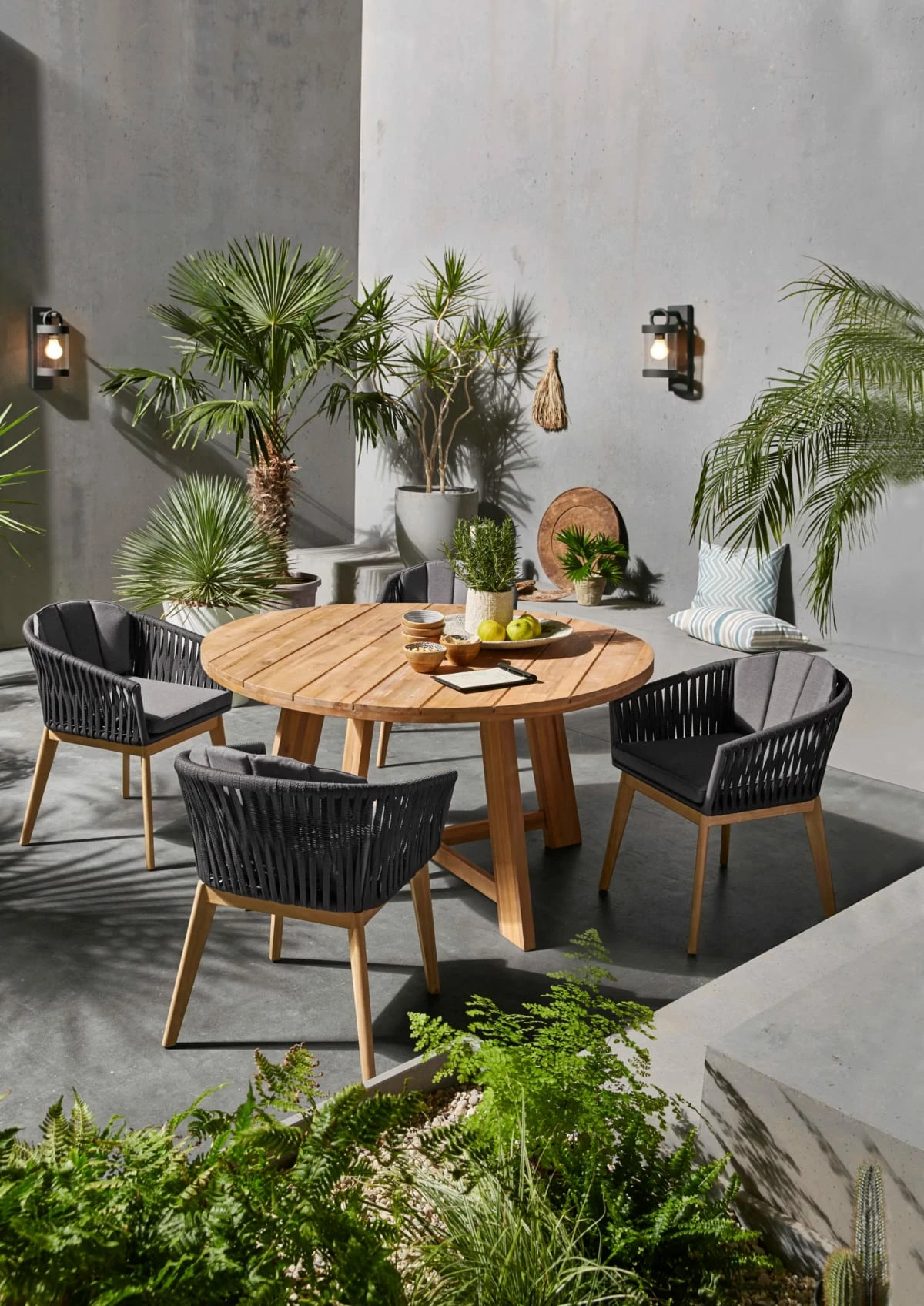 - An dem Garten-Esstisch finden ca. 5 bis 6 Personen Platz