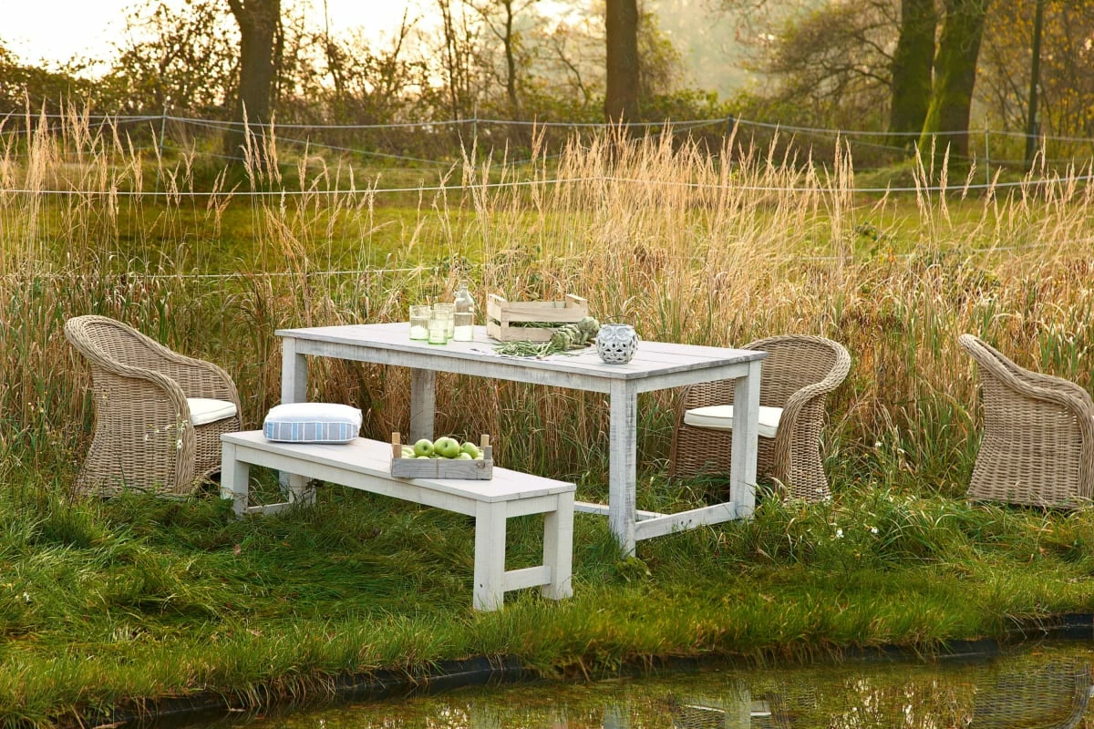 - Zur Bank passend, ist der Gartentisch Lordi (in zwei Größen) erhältlich.