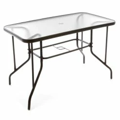 Der Glastisch ist eckig / rechteckig, pflegeleicht und hat eine Platte aus stabilem, lichtdurchlässigem Glas. Außerdem wurde in die Glasplatte aus Sicherheitsglas ein Schirmloch eingearbeitet. So können Sie bei Bedarf auch angenehm im Schatten sitzen. Die speziell geformten Beine und das Rahmenkonstrukt des Balkontisches sind optisch besonders ansprechend.