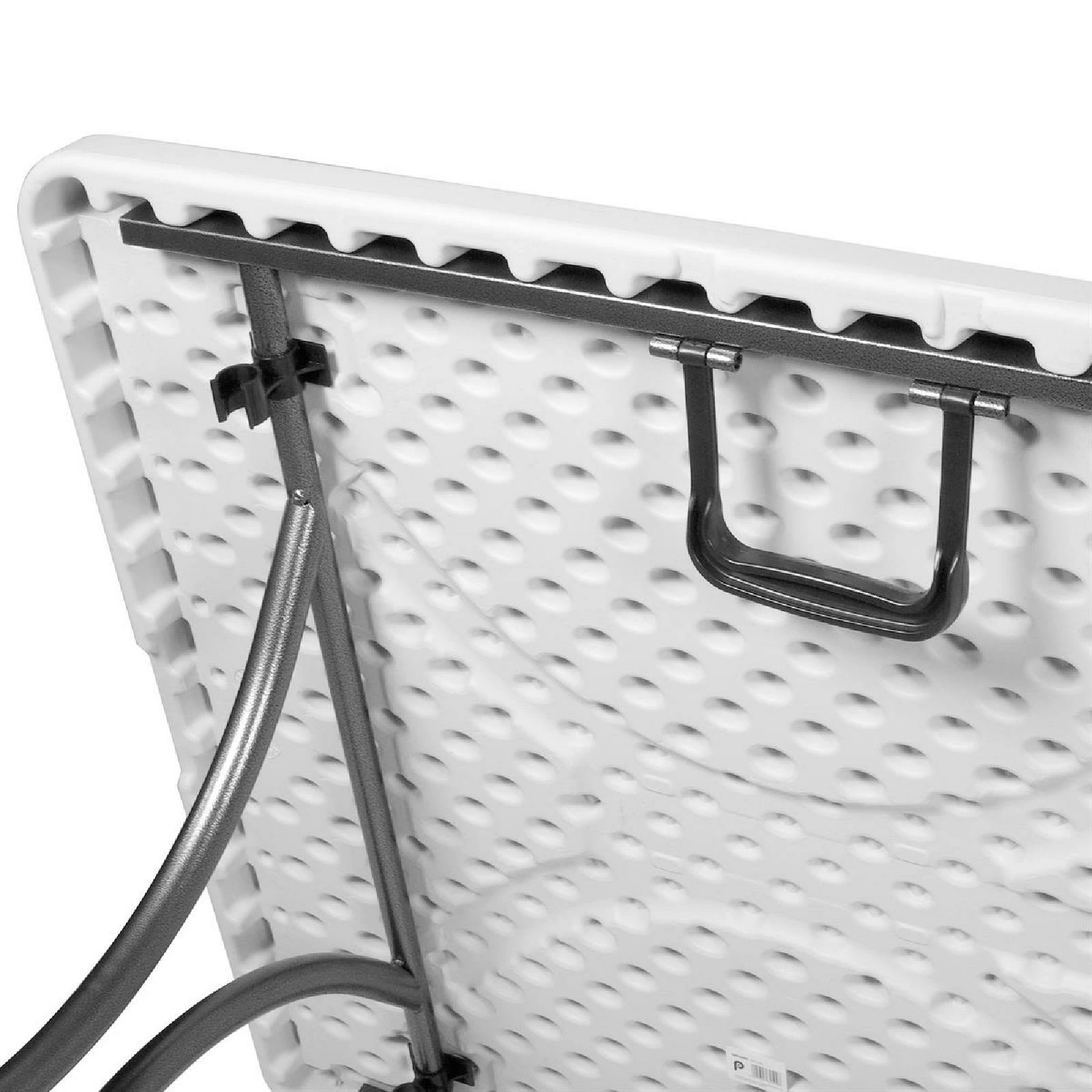 Großer Klapptisch mit pflegeleichter Hartplastikplatte und stabilem Metallgestell. Der Partytisch eignet sich hervorragend als Esstisch, sowohl innen als auch – dank der Gummischoner an den Füßen – für außen.