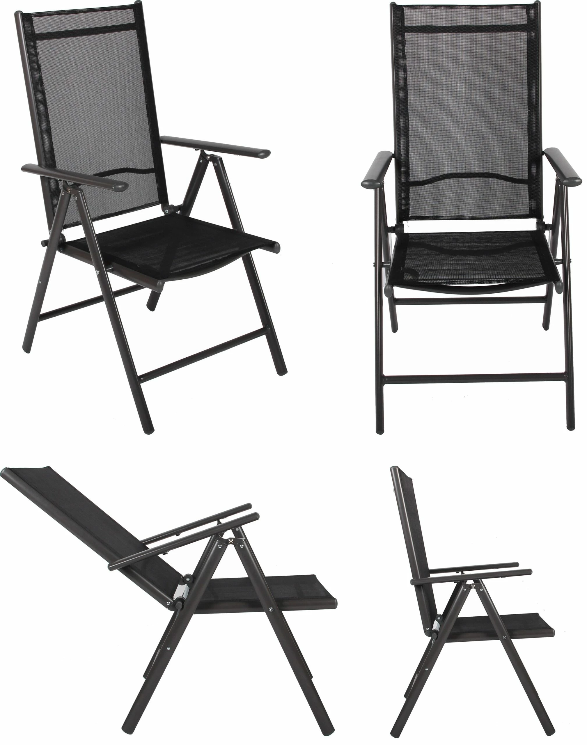 Armlehnen und verstellbare Rückenlehnen spenden zusätzlichen Komfort. Bei Nichtgebrauch können die Stühle platzsparend zusammengeklappt werden.