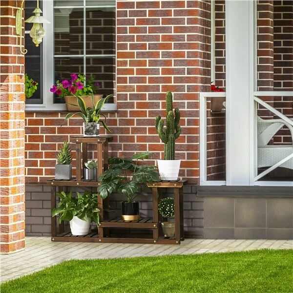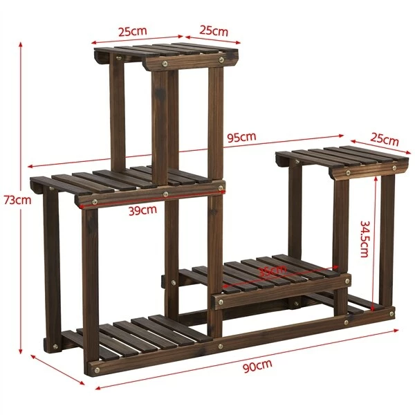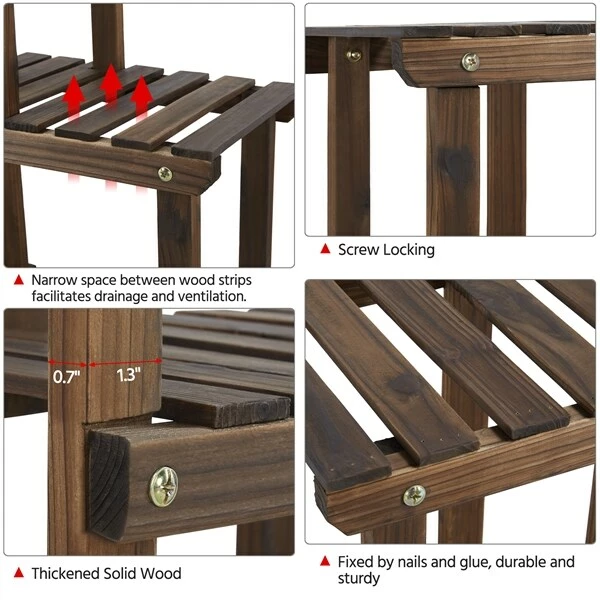 Möchten Sie Ihrem Zimmer frische Elemente hinzufügen? Zeigen Sie Ihre blühende Zimmerpflanze oder ein frisches Blumenarrangement auf unserem mehrstufigen Pflanzenstand. Dieser Holzblumenständer aus karbonisierendem behandeltem Tannenholz mit Lackierung zeichnet sich durch eine gute Haltbarkeit und eine natürliche Farbe aus. Es verfügt über 6 Plattformen, die in 4 Ebenen verteilt sind und ausreichenden Platz für mehrere Topfpflanzen. Es kann auch ein Ausstellungsstand für Fotos, Kunsthandwerk, Bücher im Wohnzimmer, auf der Terrasse und am Balkon sein und als Ablagefach für Toilettenartikel, Handtücher, Hüte im Badezimmer, Flur, Schlafzimmr, Küche usw. dienen.